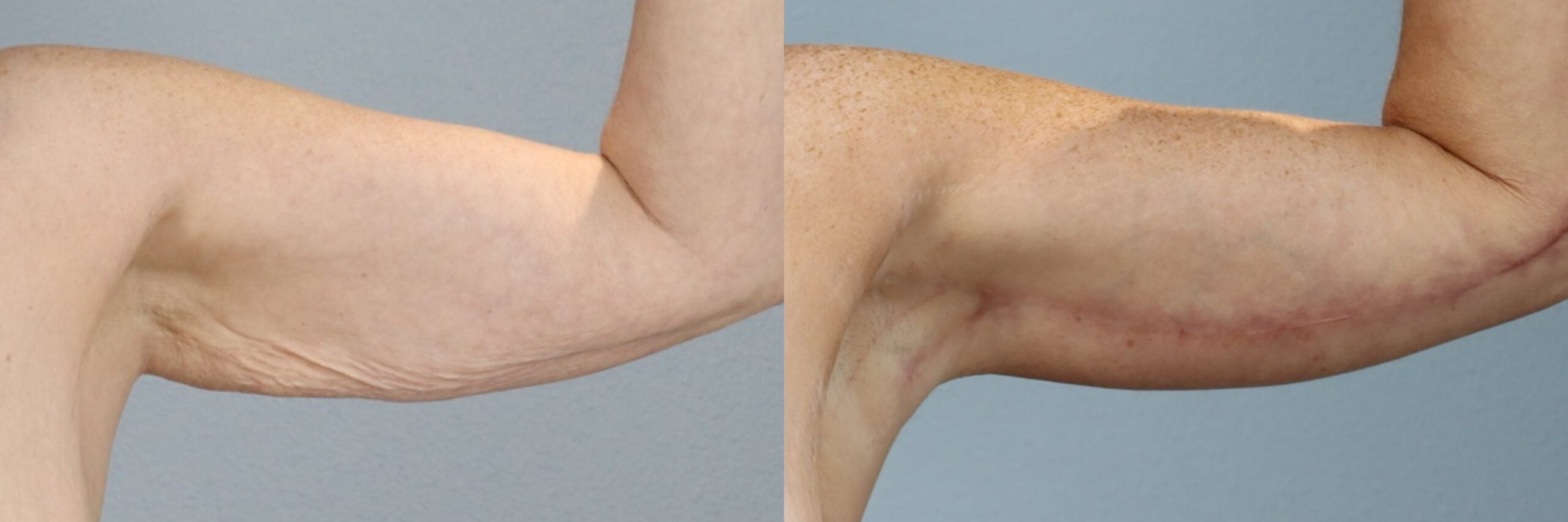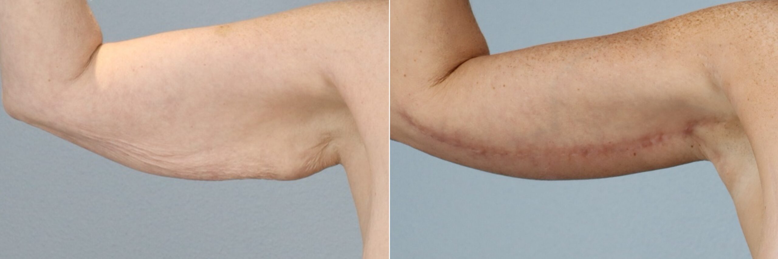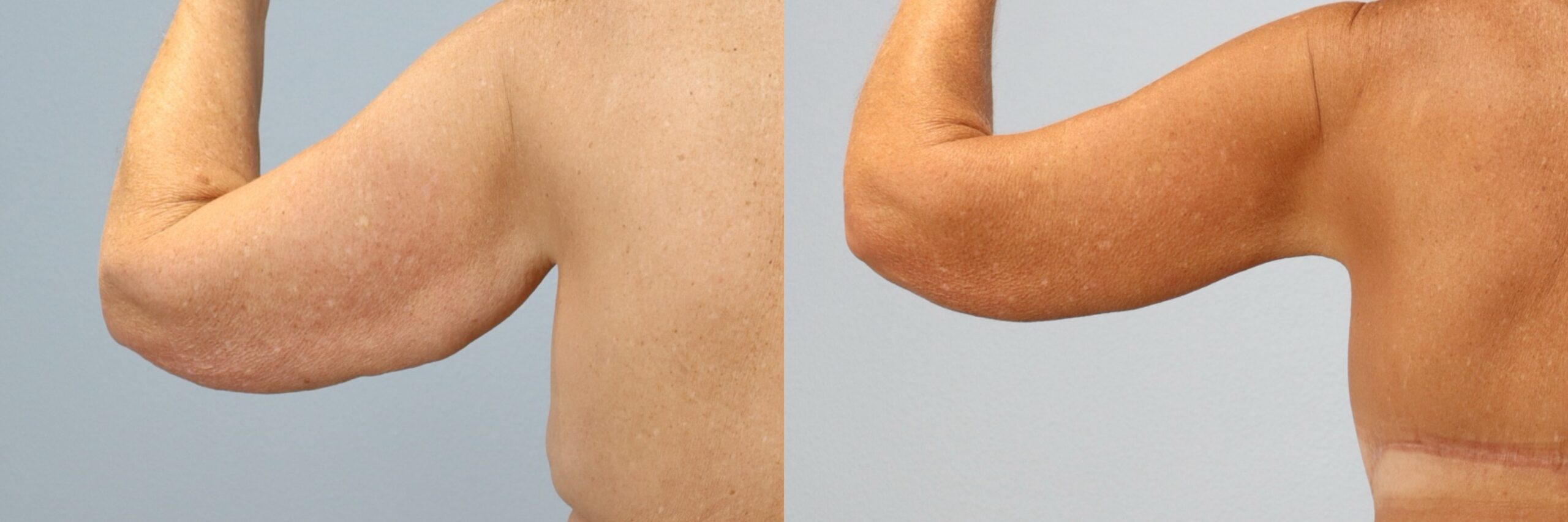 This 51-year-old female patient is shown 8 months after undergoing an arm lift (brachioplasty) performed by board-certified plastic surgeon Dr. Neaman. The procedure removed excess skin and reshaped the upper arms for a smoother, more toned contour. At 8 months post-op, her results highlight leaner arm definition, improved proportions, and scars placed discreetly for minimal visibility.