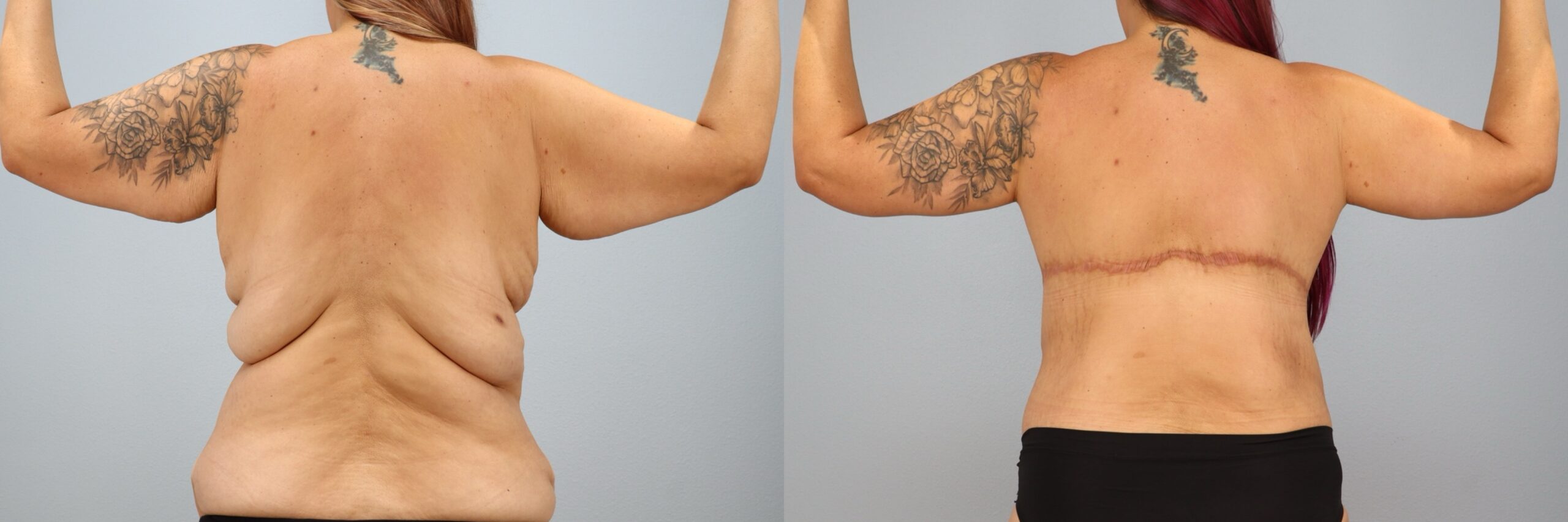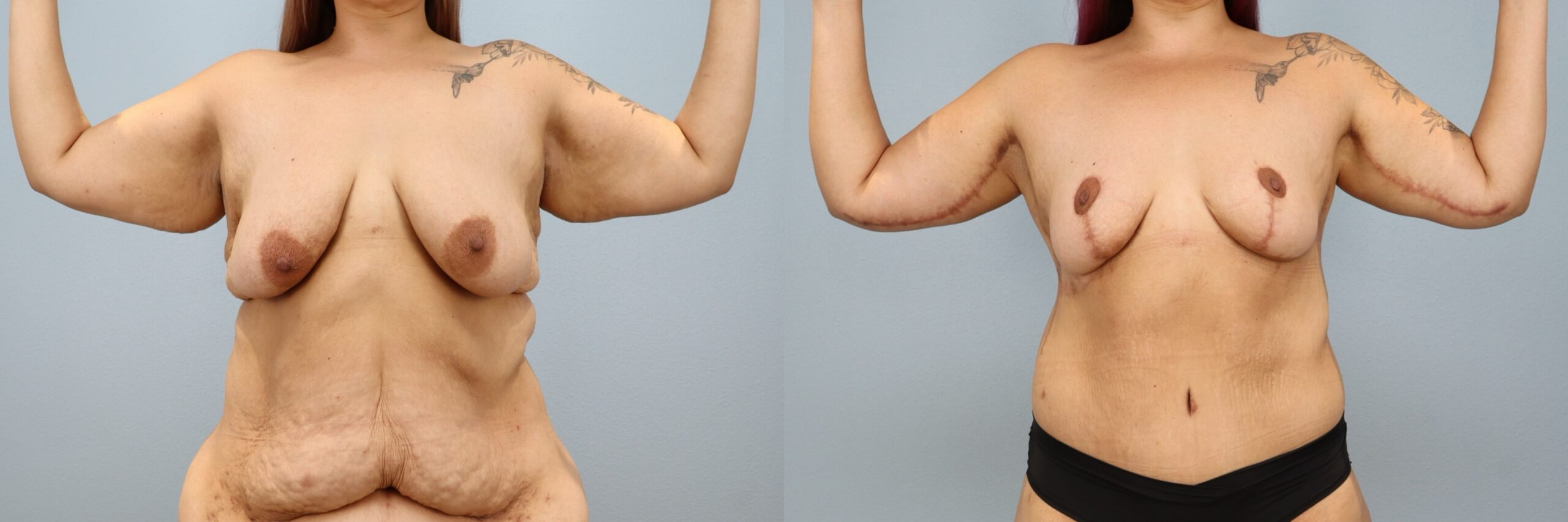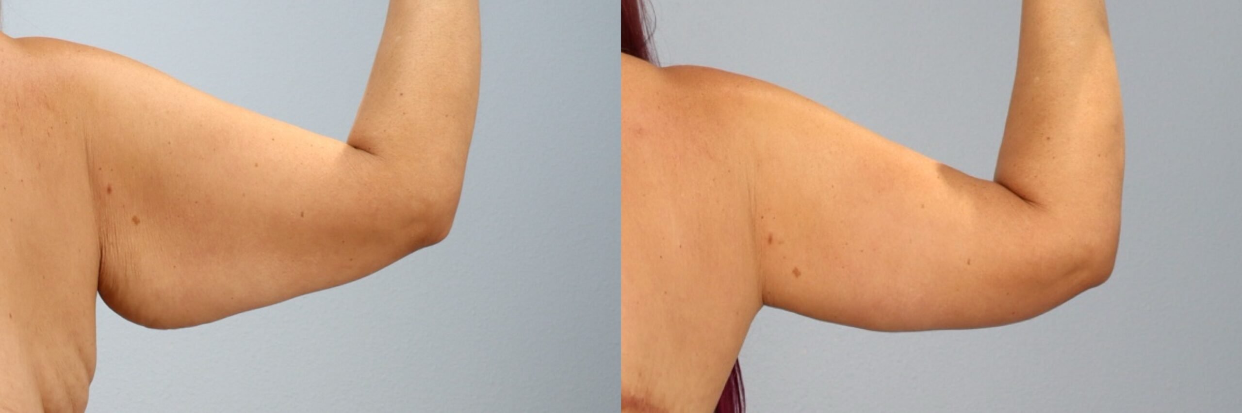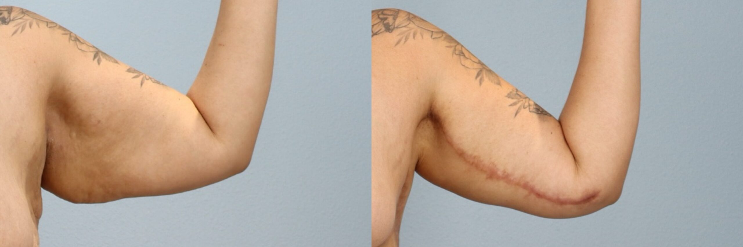 This 42-year-old female patient is shown 8 months after an arm lift (brachioplasty) performed by board-certified plastic surgeon Dr. Neaman. The procedure removed excess skin and improved arm contour. Her results show firmer, more streamlined upper arms with improved tone and definition.