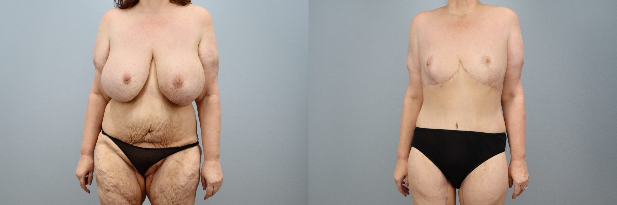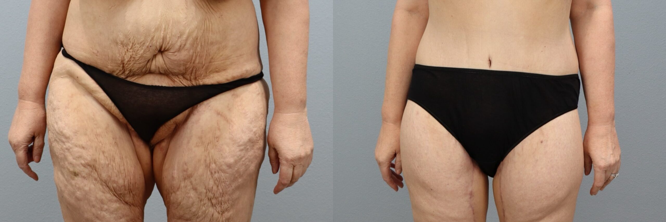 This 48-year-old female patient is shown 18 months after undergoing a body lift (circumferential abdominoplasty) with Fleur de Lis extension, performed by board-certified plastic surgeon Dr. Neaman. This advanced skin removal surgeryaddressed both vertical and horizontal skin laxity to improve abdominal contour and definition. Her long-term results reveal a firmer, flatter midsection with enhanced shape and improved symmetry from all angles.