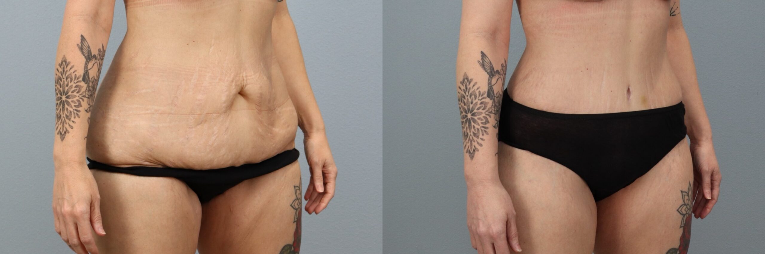 This 48-year-old female patient is shown 6 months after undergoing a Body Lift (Circumferential Abdominoplasty) with Auto Augmentation performed by board-certified plastic surgeon Dr. Neaman. This comprehensive procedure addressed excess skin around the midsection while reshaping the torso for improved contour. Auto augmentation utilized her own tissue to enhance natural projection. In addition, 1000cc of liposuction was performed to refine surrounding areas and improve overall balance. At 6 months post-op, her results demonstrate smoother contours, improved waist definition, and a more sculpted silhouette.