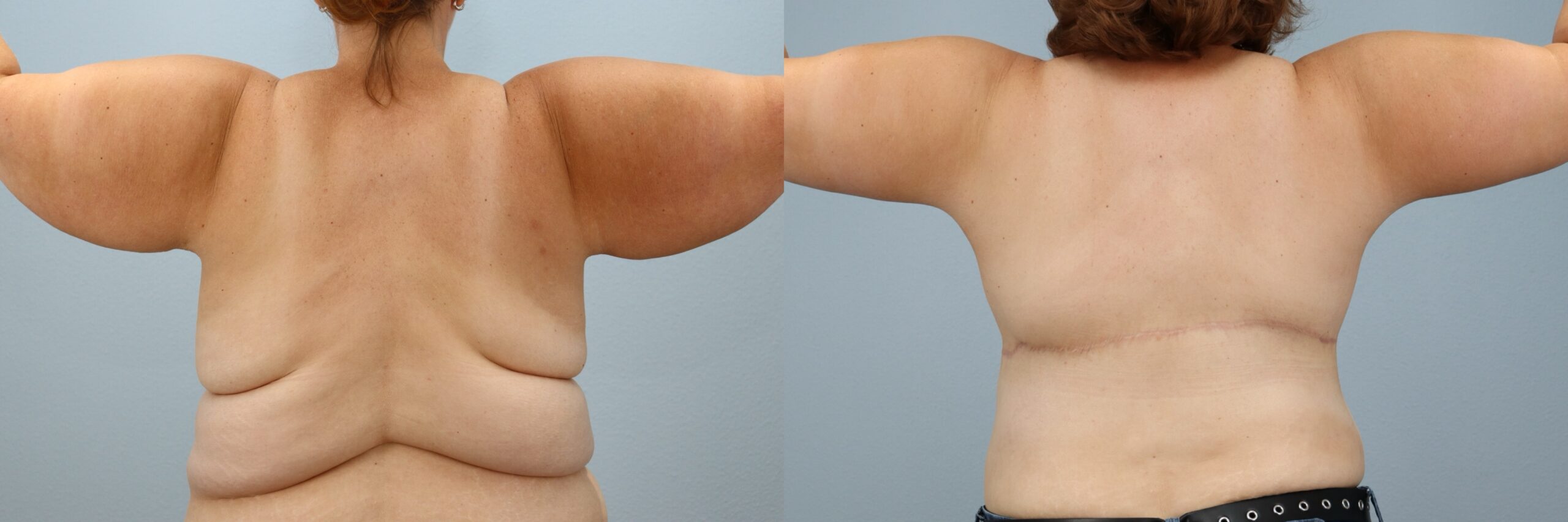 This 44-year-old female patient is shown 6 months after undergoing a bra line back lift performed by board-certified plastic surgeon Dr. Neaman. This skin removal surgery was designed to target excess tissue along the upper back, creating a smoother, tighter contour. The incision was carefully placed along the bra line for discreet healing. At 6 months post-op, her results reveal a sculpted, more refined upper back with natural definition.