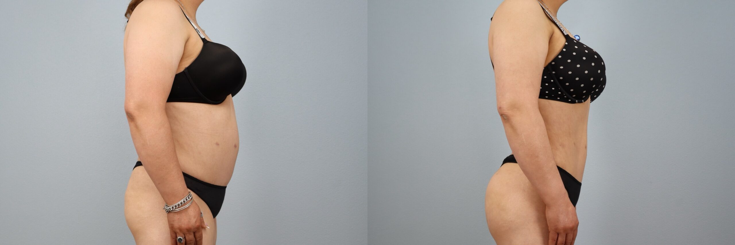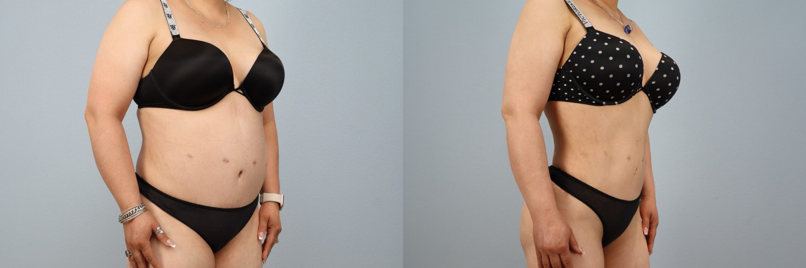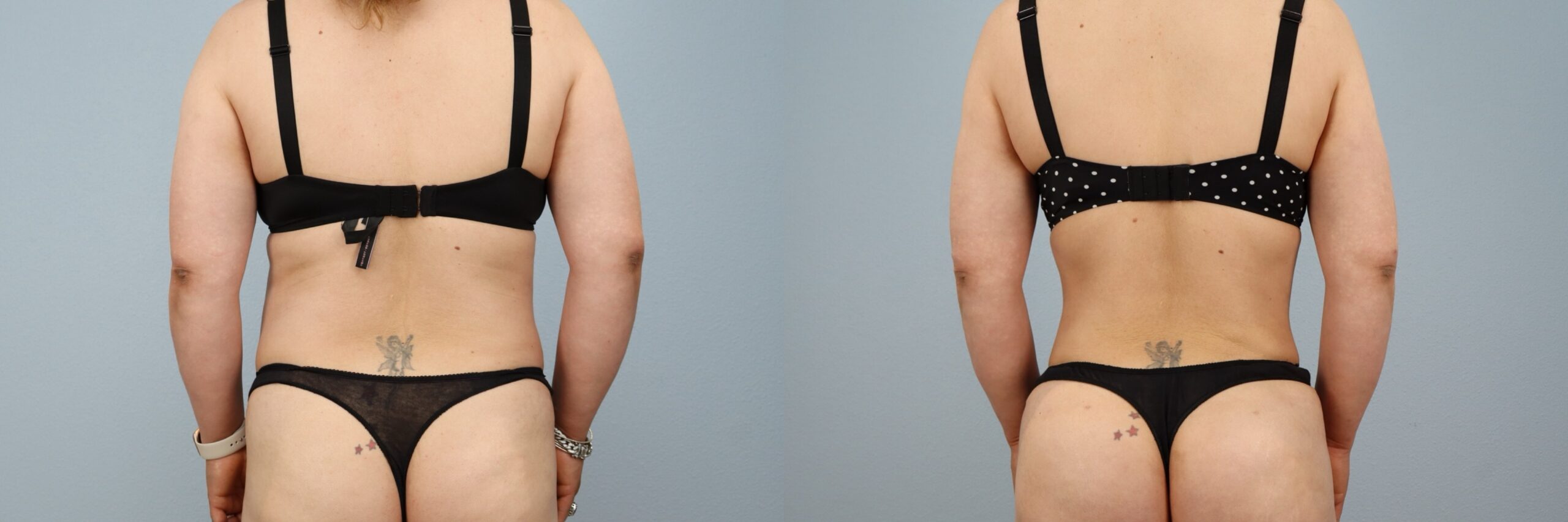 This 43-year-old female patient is shown 7 months after undergoing Lipo 360 performed by board-certified plastic surgeon Dr. Neaman. This circumferential liposuction technique targets the abdomen, flanks, and back to create a more balanced and sculpted midsection. By addressing multiple areas at once, Lipo 360 enhances waist definition and improves overall body contour. At 7 months post-op, her before and after results demonstrate smoother transitions, refined waistline contour, and a more sculpted silhouette.