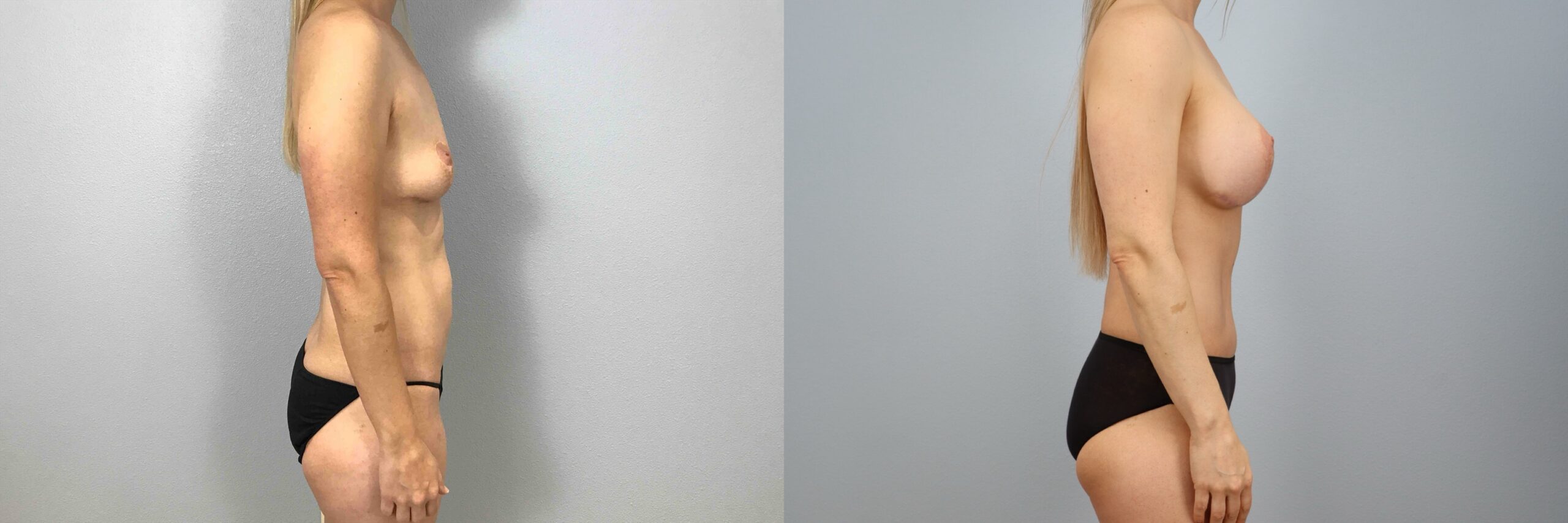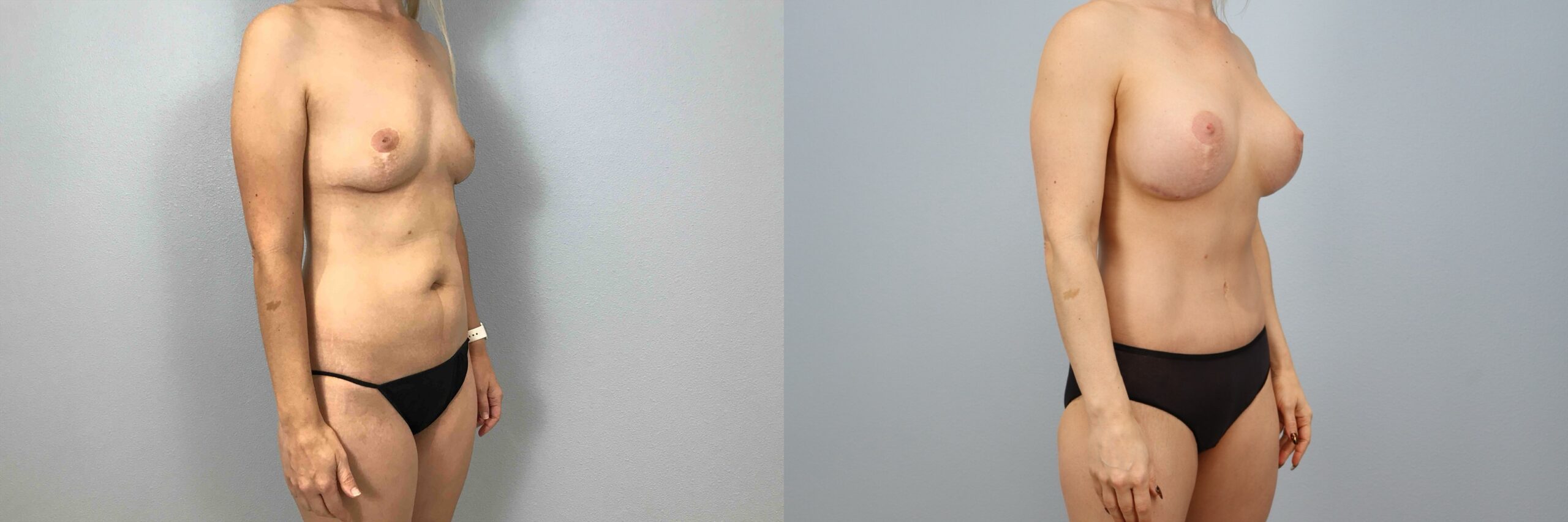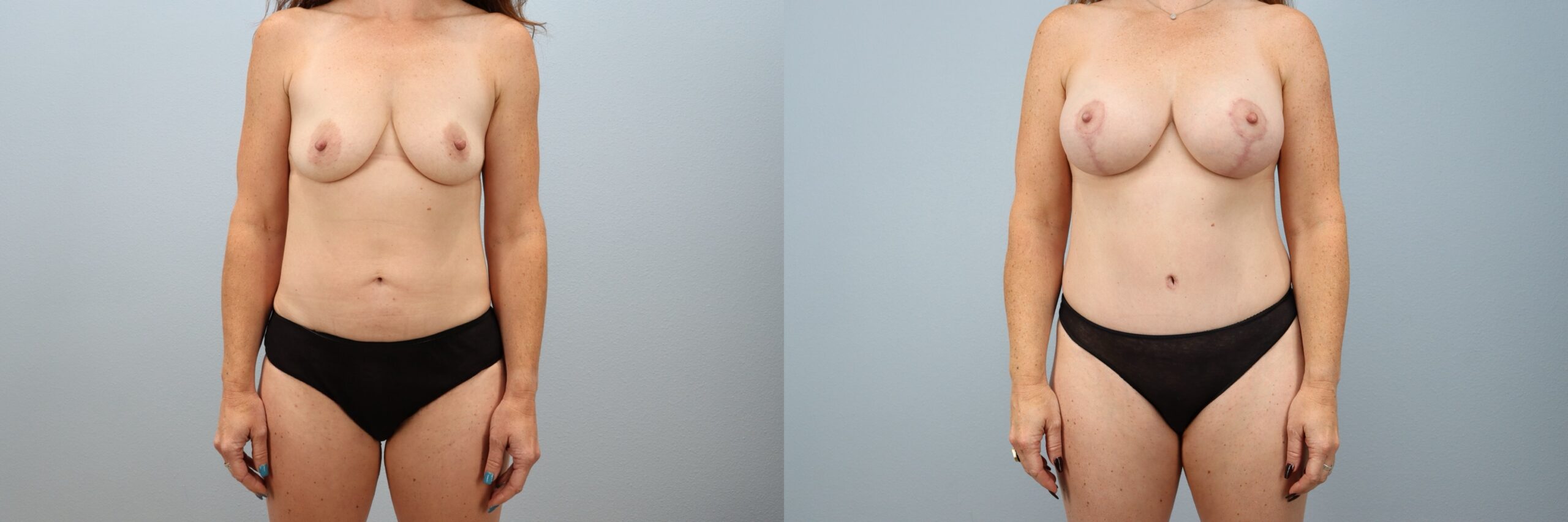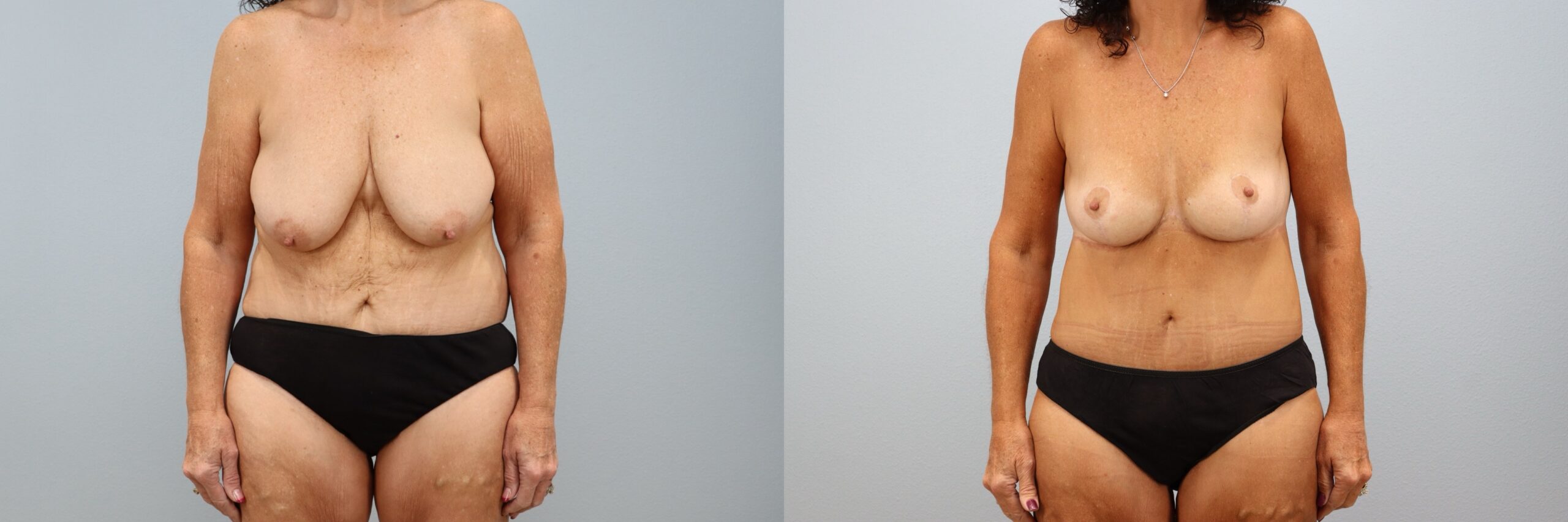 This 47-year-old female patient is shown 6 years after undergoing a Mommy Makeover with board-certified plastic surgeon Dr. Neaman. Her surgical plan included a tummy tuck (abdominoplasty) with liposuction to the flanks and back and a breast augmentation. The combination of procedures rejuvenated her midsection and breasts, restoring youthful proportions and improved contour. Her long-term results highlight a flatter abdomen, enhanced breast volume, and overall body balance.