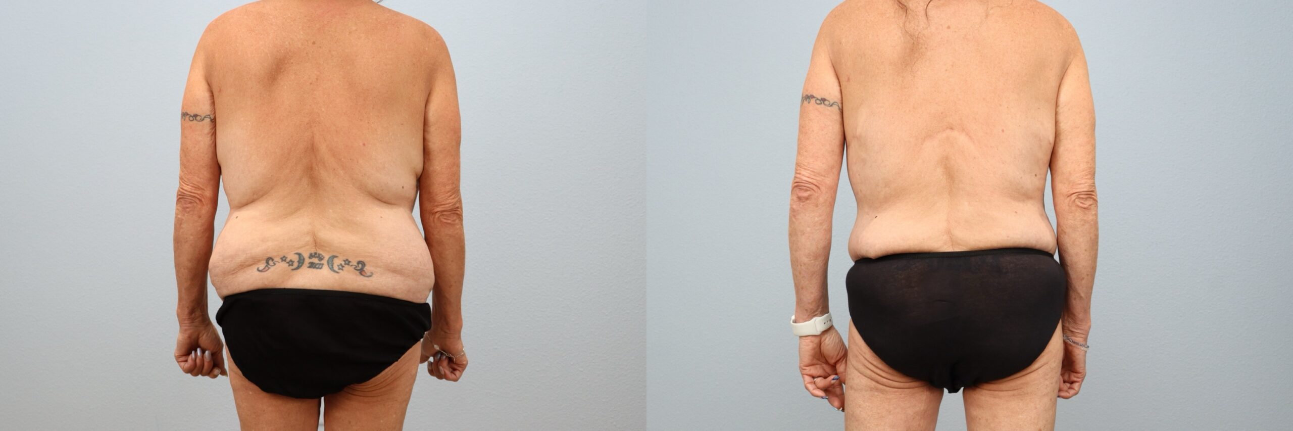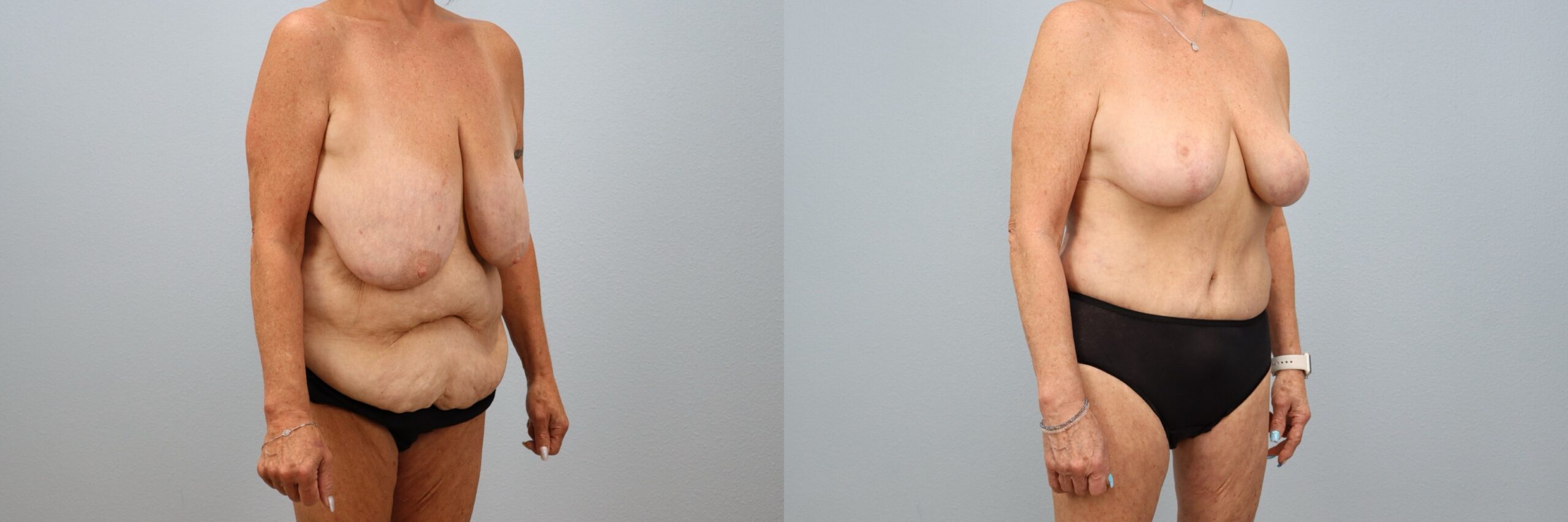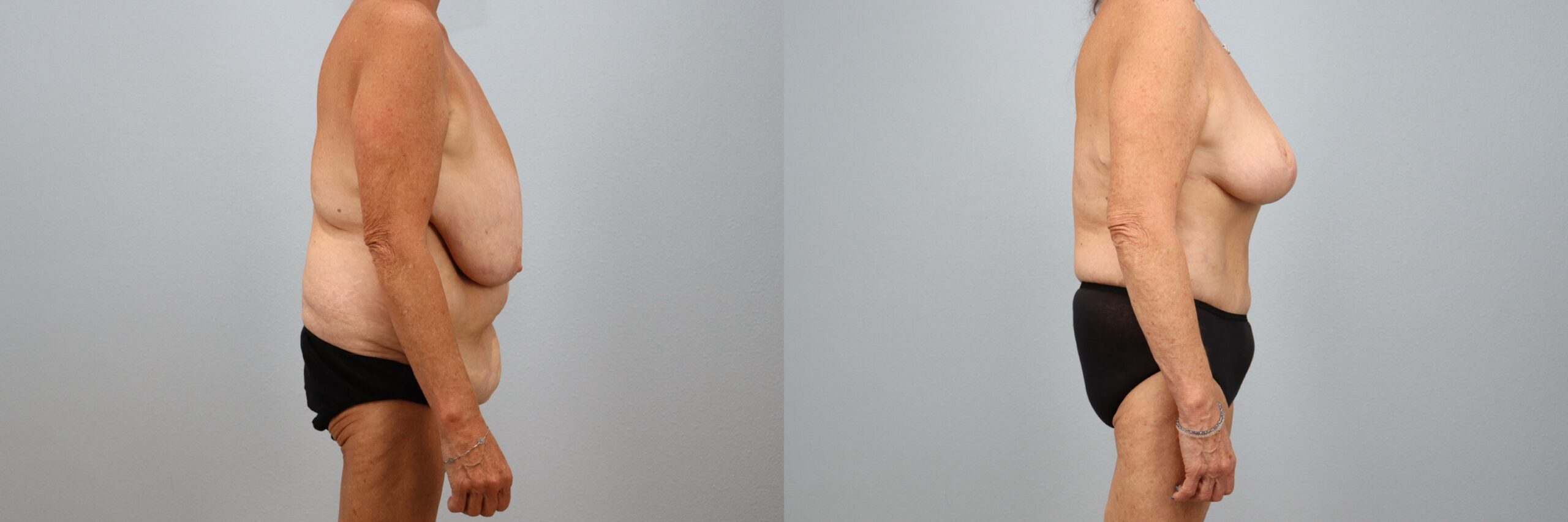 This 61-year-old female patient is shown 11 months after her Mommy Makeover performed by board-certified plastic surgeon Dr. Neaman. Her comprehensive body contouring procedure included a breast reduction with lateral extension and a tummy tuck (abdominoplasty) with liposuction to the flanks, addressing excess skin and restoring balanced proportions. This transformative skin removal surgery tightened the abdomen, reshaped the waistline, and lifted the breasts for a more youthful contour. At 11 months post-op, her before and after Mommy Makeover results highlight a flatter, smoother midsection and lifted, natural-looking breast shape that complements her overall figure.