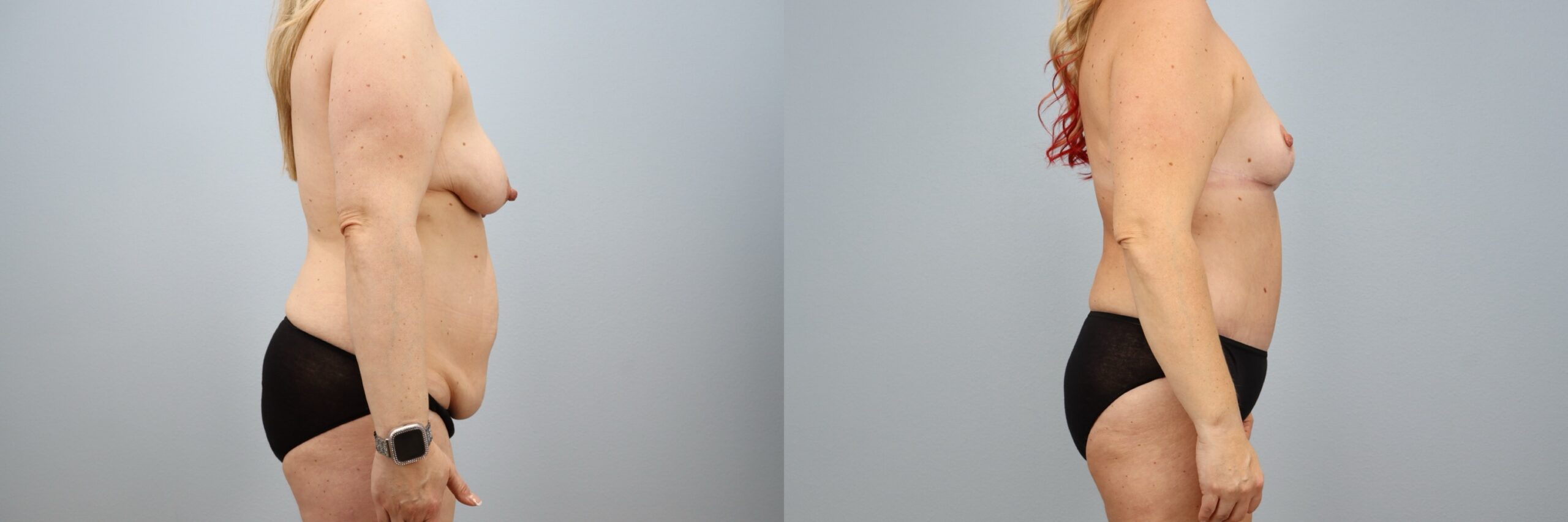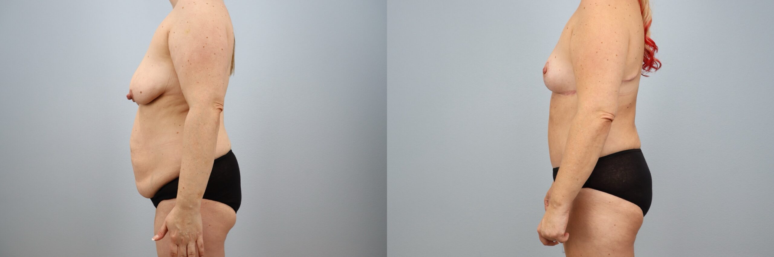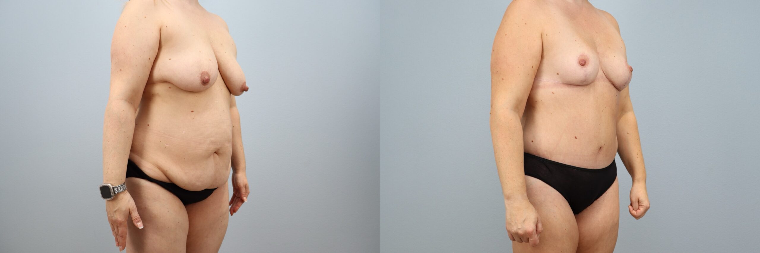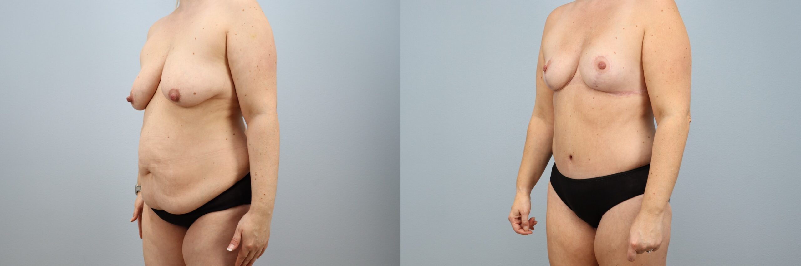 This 42-year-old female patient is shown 8 months after undergoing a Mommy Makeover performed by board-certified plastic surgeon Dr. Neaman. Her personalized treatment plan included a tummy tuck (abdominoplasty) with liposuction to the flanks and a breast lift (mastopexy) with lateral extension. Together, these procedures restored shape and firmness to the abdomen and breasts, addressing loose skin and improving overall body contour. At 8 months post-op, her results highlight balanced proportions, a flatter midsection, and rejuvenated breast position and symmetry.