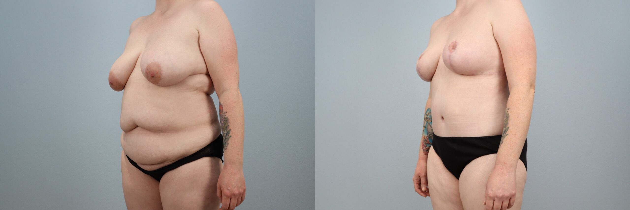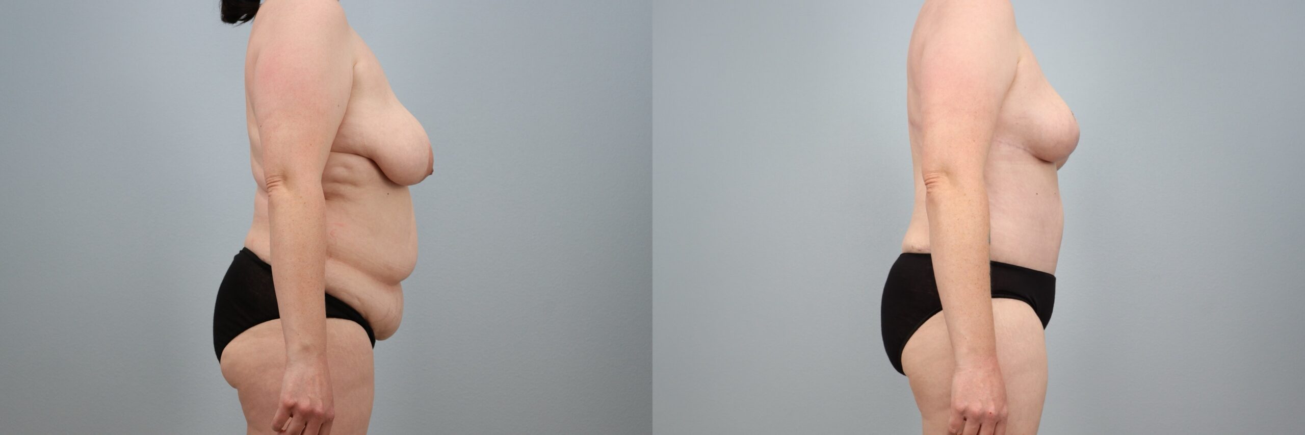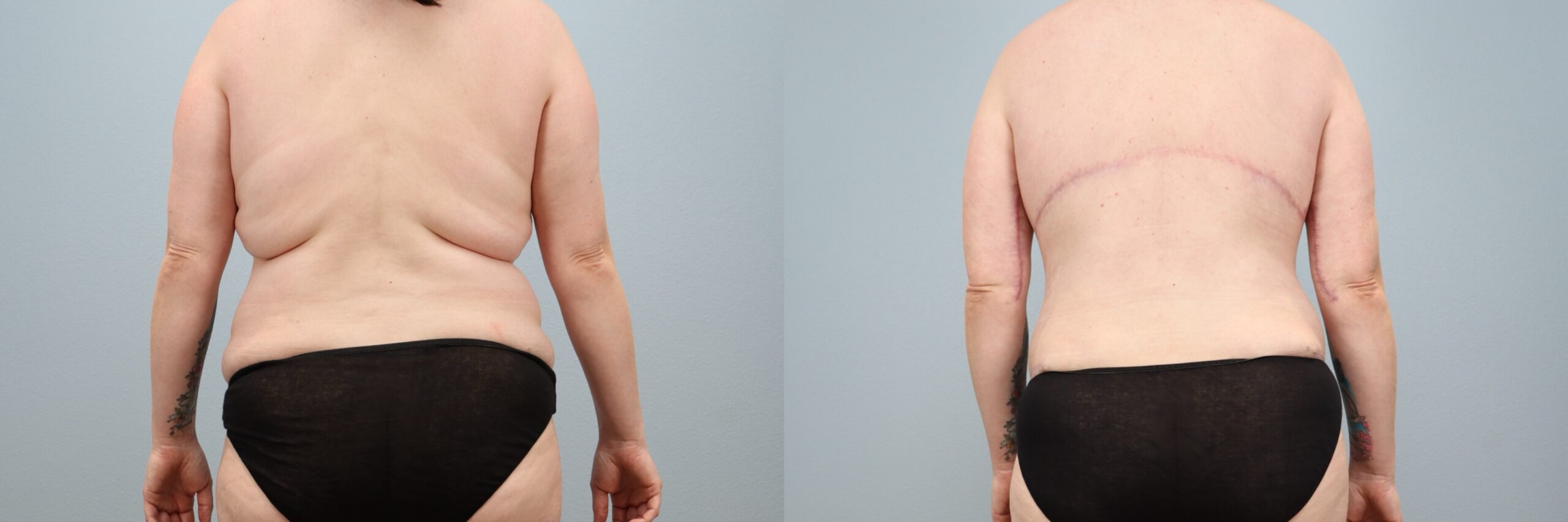 This 39-year-old female patient is shown 6 months after her Mommy Makeover performed by board-certified plastic surgeon Dr. Neaman. Her customized surgical plan included a tummy tuck (abdominoplasty) with liposuction to the flanks, back, and abdomen, a breast lift (mastopexy), and a bra line back lift. This comprehensive body contouring and skin removal surgery addressed excess skin while restoring balanced proportions. Her before and after Mommy Makeover results highlight a flatter abdomen, lifted breasts, and smoother contours throughout the torso.