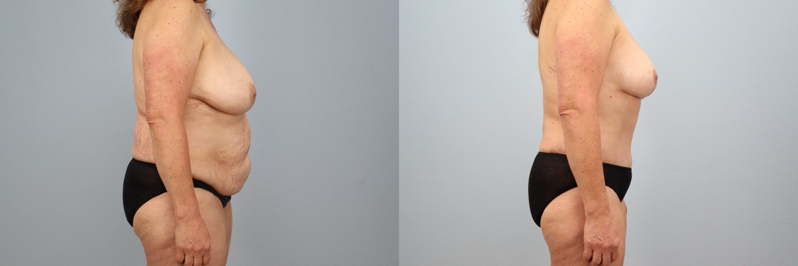 This 59-year-old female patient is shown 6 months after her Mommy Makeover performed by board-certified plastic surgeon Dr. Neaman. Her customized plan included a Tummy Tuck (Abdominoplasty) with liposuction to the flanks, back, and abdomen along with a Breast Reduction with axillary liposuction. Together, these procedures addressed excess skin, improved body contouring, and restored balance throughout the torso. At 6 months post-op, her before and after Mommy Makeover results reveal a smoother waistline, improved breast proportion, and a more defined silhouette.