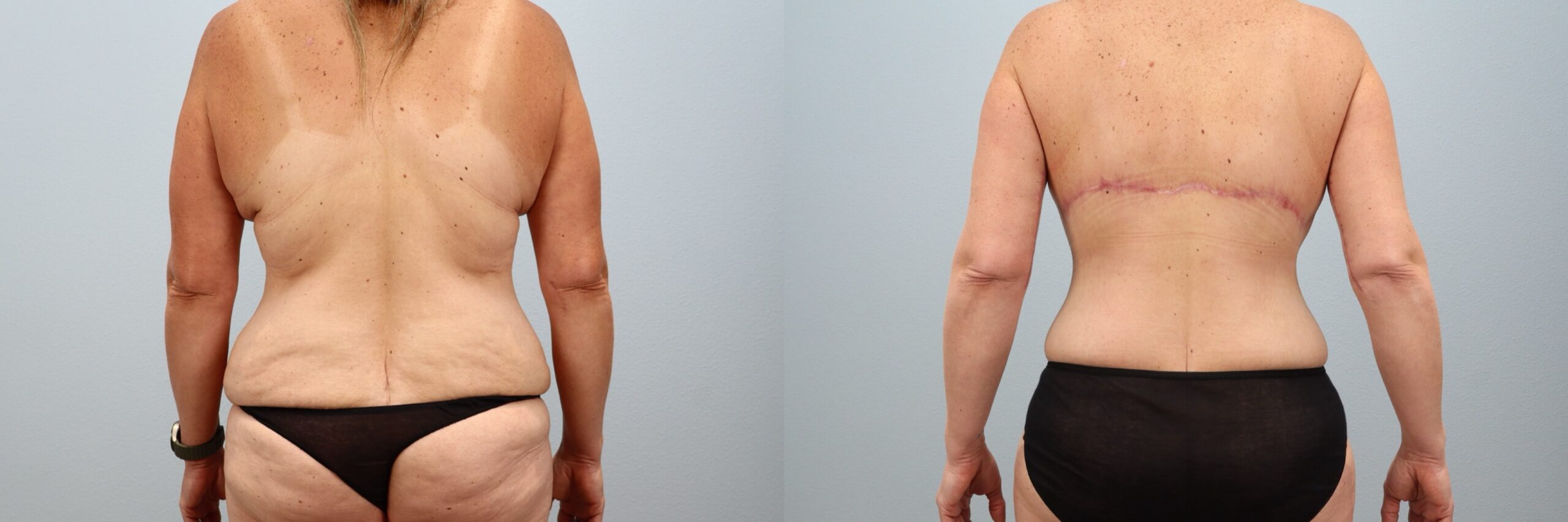 This 48-year-old female patient is shown 7 months after her Mommy Makeover performed by board-certified plastic surgeon Dr. Neaman. Her customized surgical plan included a tummy tuck with liposuction to the flanks, back and abdomen, a bra line back lift, an L-type arm lift, and a breast lift with 450cc silicone smooth round high profile implants. This comprehensive body contouring approach addressed excess skin, improved waist definition, refined the upper body, and restored breast volume. Her before and after Mommy Makeover results reveal smoother contours and balanced proportions throughout.
