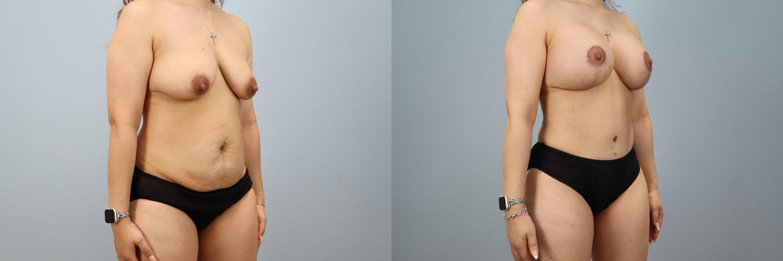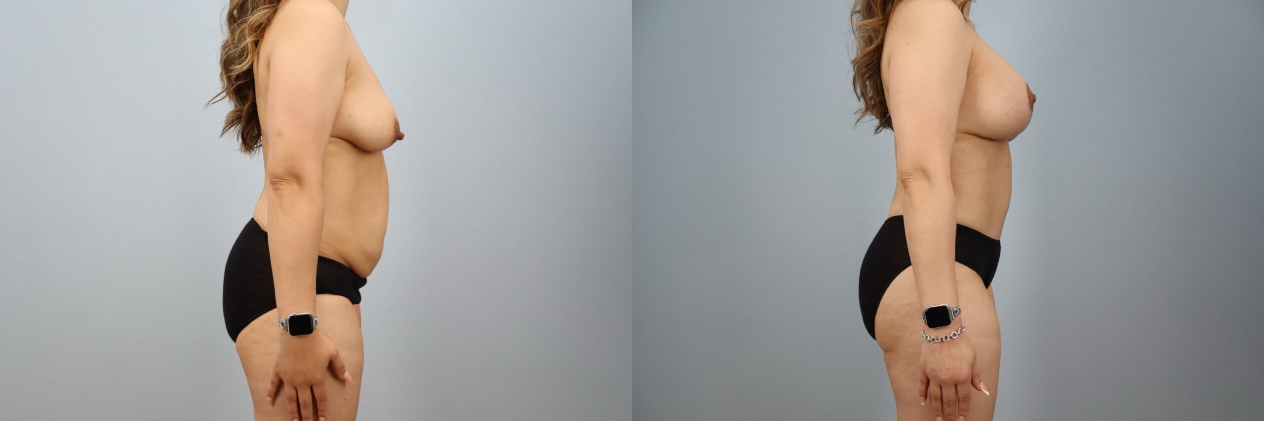 This 37-year-old female patient is shown 6 months after her Mommy Makeover performed by board-certified plastic surgeon Dr. Neaman. Her procedure included a Breast Lift with 415cc implants and a Full Tummy Tuck with Lipo 360. By combining breast enhancement with comprehensive midsection contouring, the surgery improved balance, projection, and waist definition. Her before and after Mommy Makeover results demonstrate lifted breast shape, a flatter abdomen, and a sculpted silhouette.
