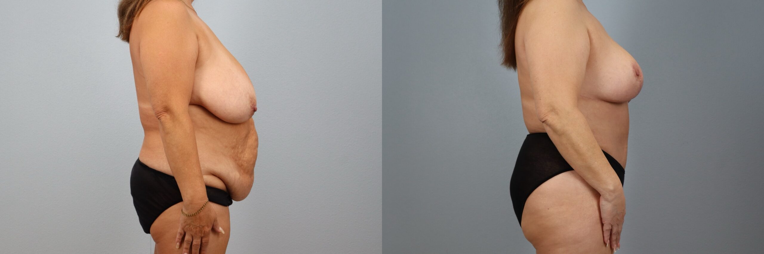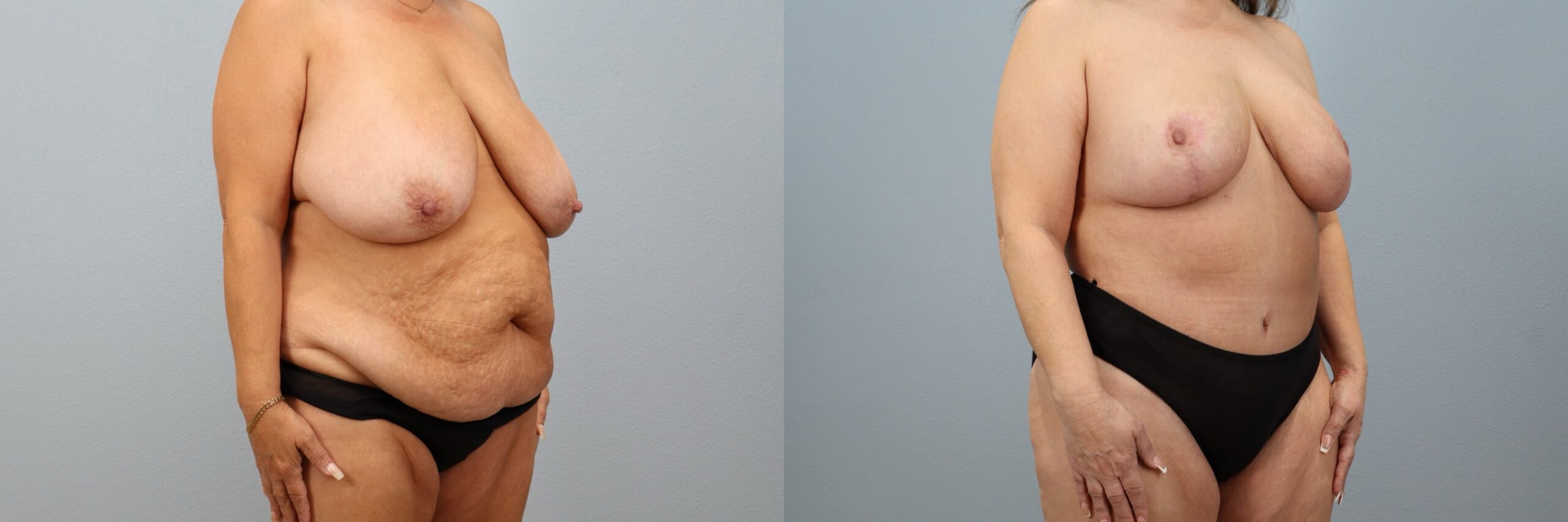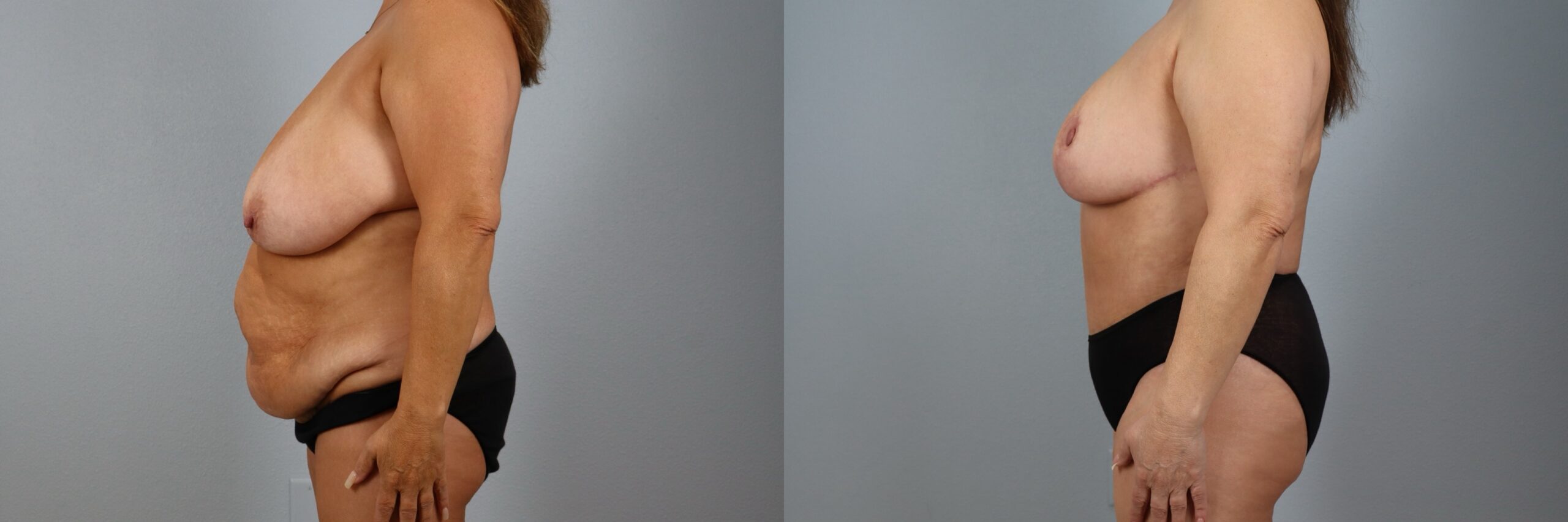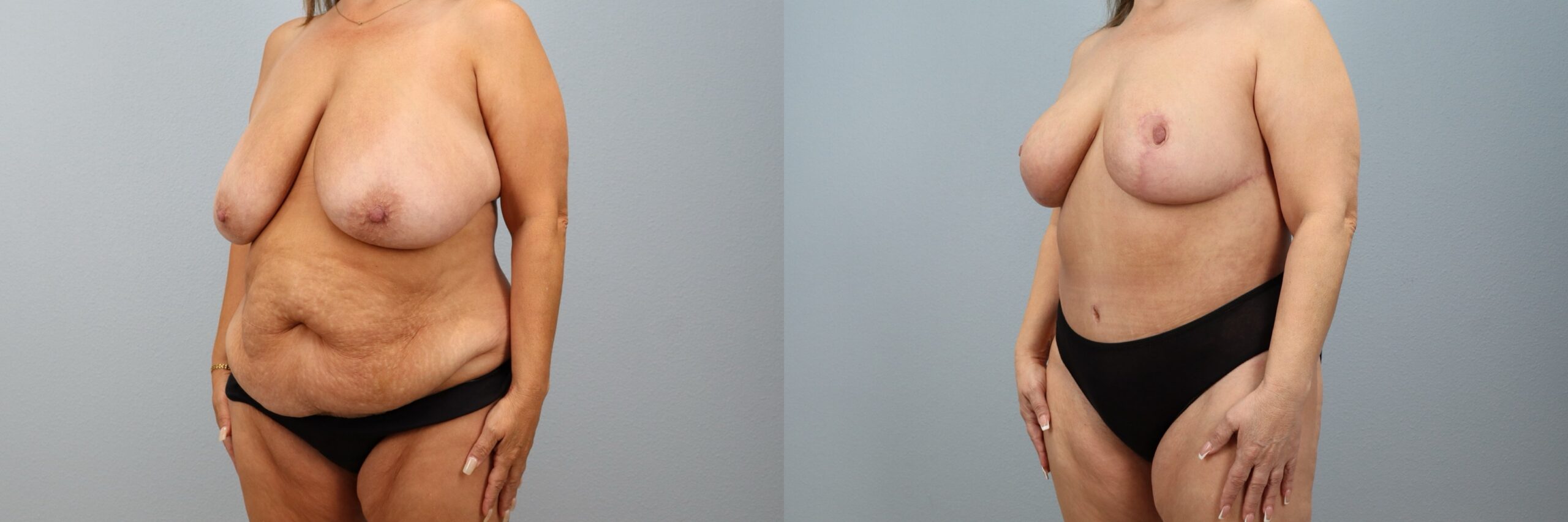 This 55-year-old female patient is shown 6 months after her Mommy Makeover performed by board-certified plastic surgeon Dr. Neaman. Her customized procedure included a Breast Reduction and a Tummy Tuck (Abdominoplasty) with Liposuction to the abdomen. This comprehensive body contouring approach addressed both breast size and abdominal contour to improve overall proportion. Her before and after Mommy Makeover results highlight a flatter midsection, improved breast shape, and a more balanced silhouette.