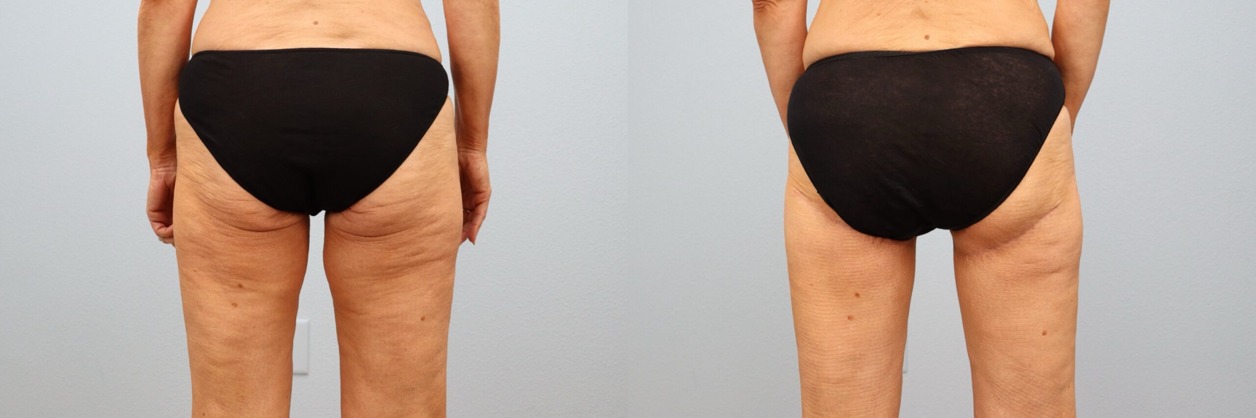 This 62-year-old female patient is shown 6 months after her inguinal thigh lift performed by board-certified plastic surgeon Dr. Neaman. This skin removal surgery targeted loose inner thigh skin, improving contour and comfort. The incision was placed discreetly in the groin crease to support natural-looking healing. At 6 months post-op, her results highlight smoother thighs, reduced skin laxity, and enhanced leg definition, offering a more balanced lower body silhouette.