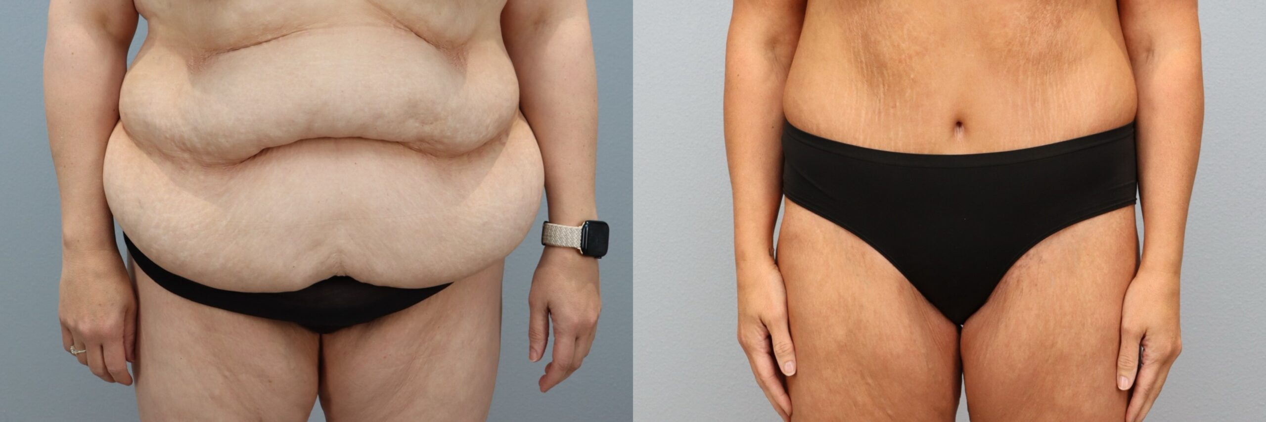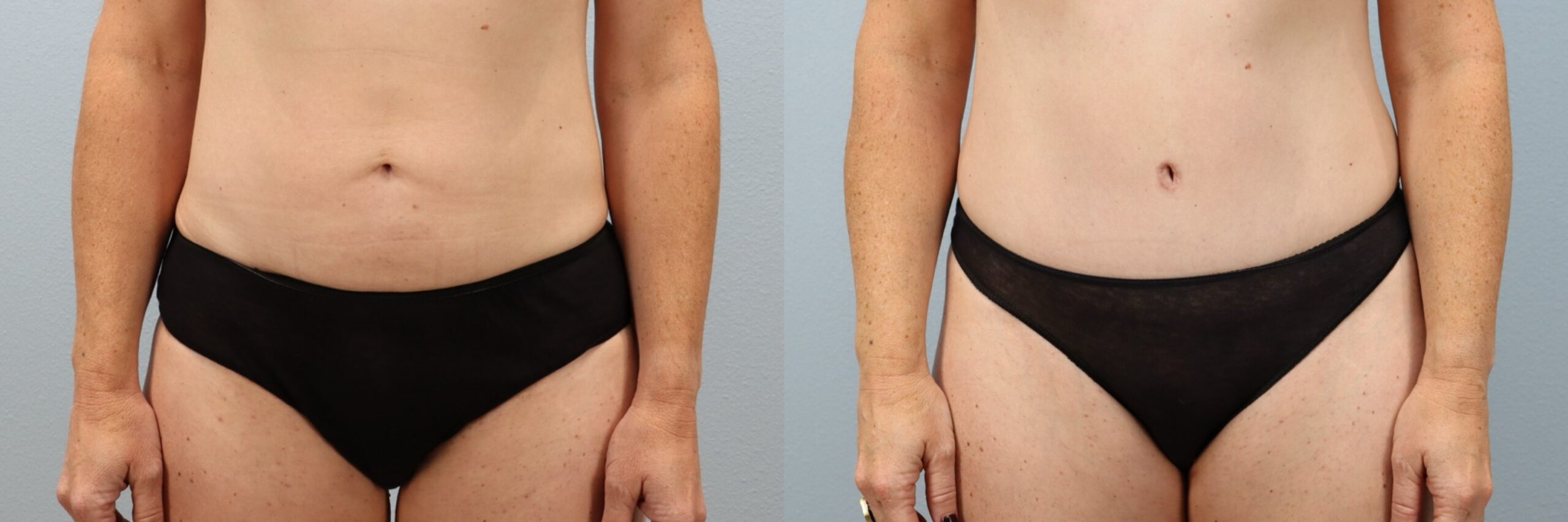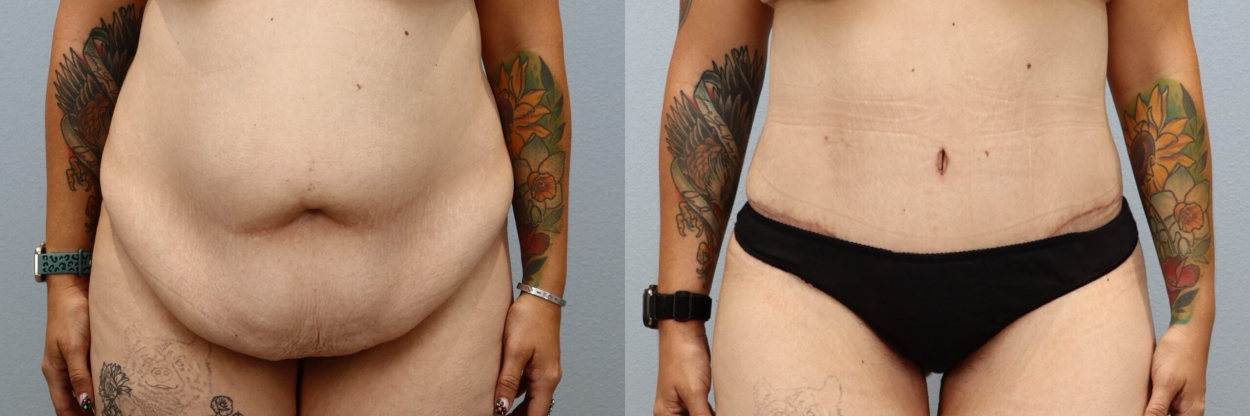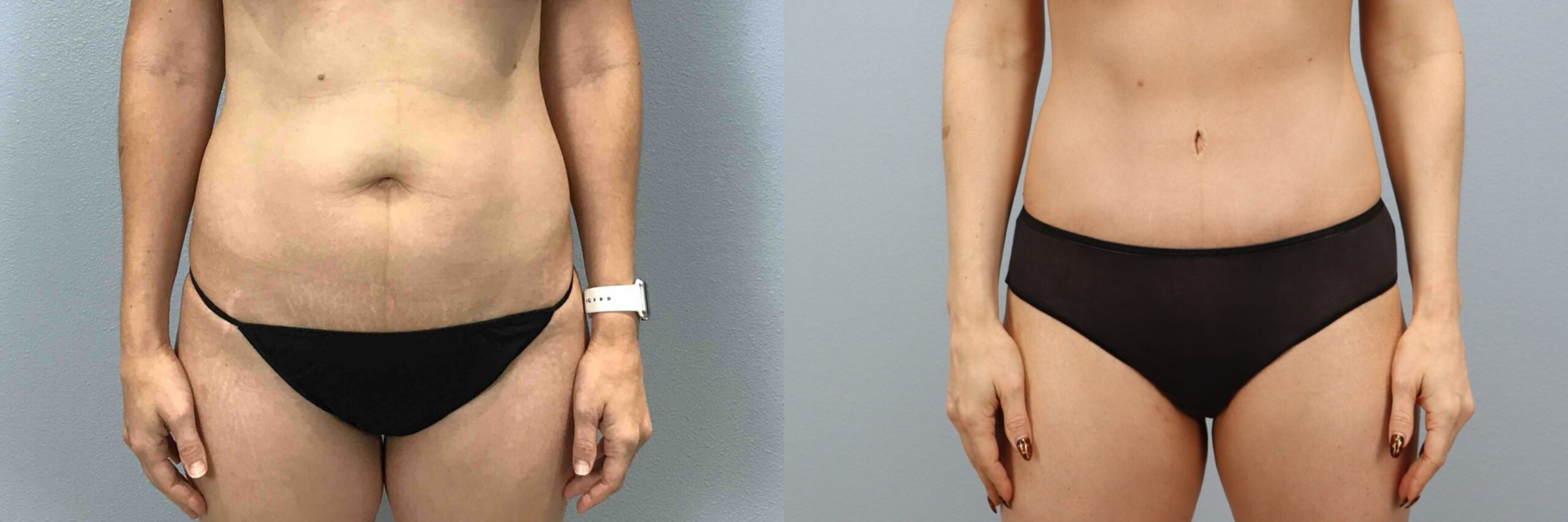 This 41-year-old female patient is shown 3 years after undergoing a tummy tuck (abdominoplasty) with liposuction to the flanks, back, and upper abdomen, performed by board-certified plastic surgeon Dr. Neaman in Oregon. This body contouring surgery addressed loose abdominal skin and muscle laxity while using liposuction to sculpt the waistline and upper abdomen for improved definition. Her before and after tummy tuck photos highlight a smoother, flatter midsection and enhanced overall body shape. These long-term 3-year results showcase the durability of her tummy tuck recovery and the benefits of combining excess skin removal with targeted fat reduction.