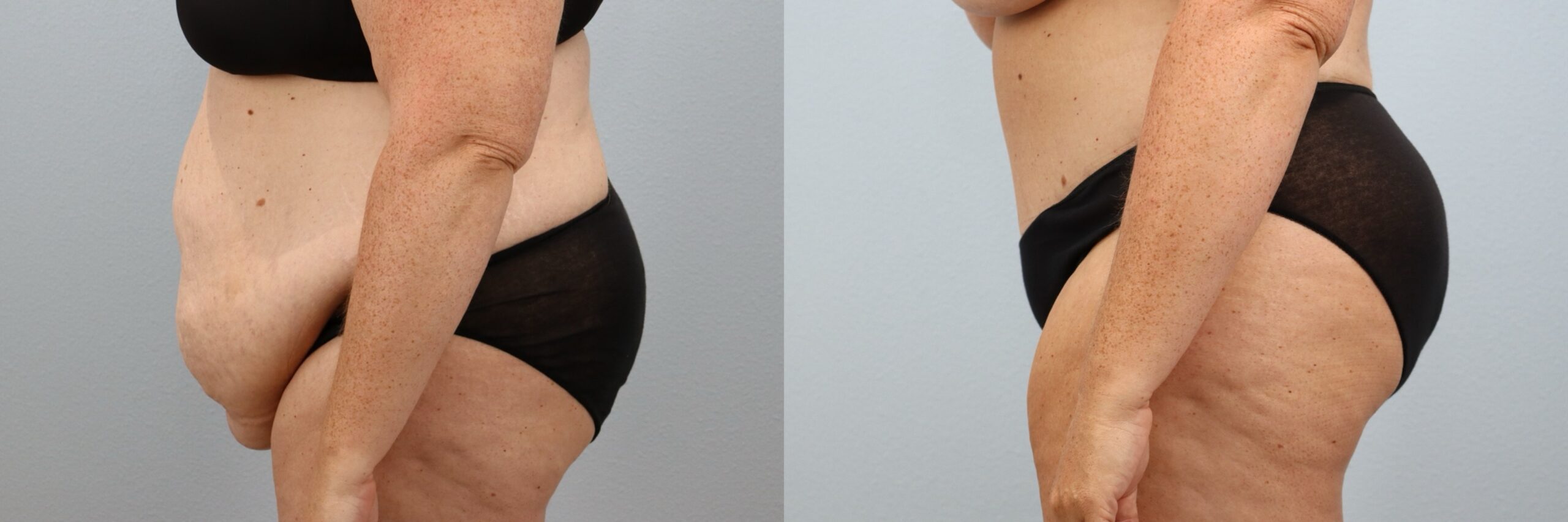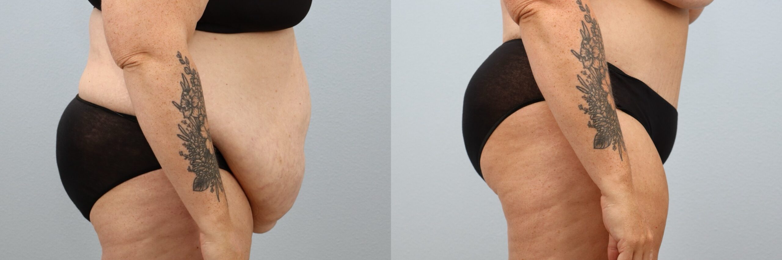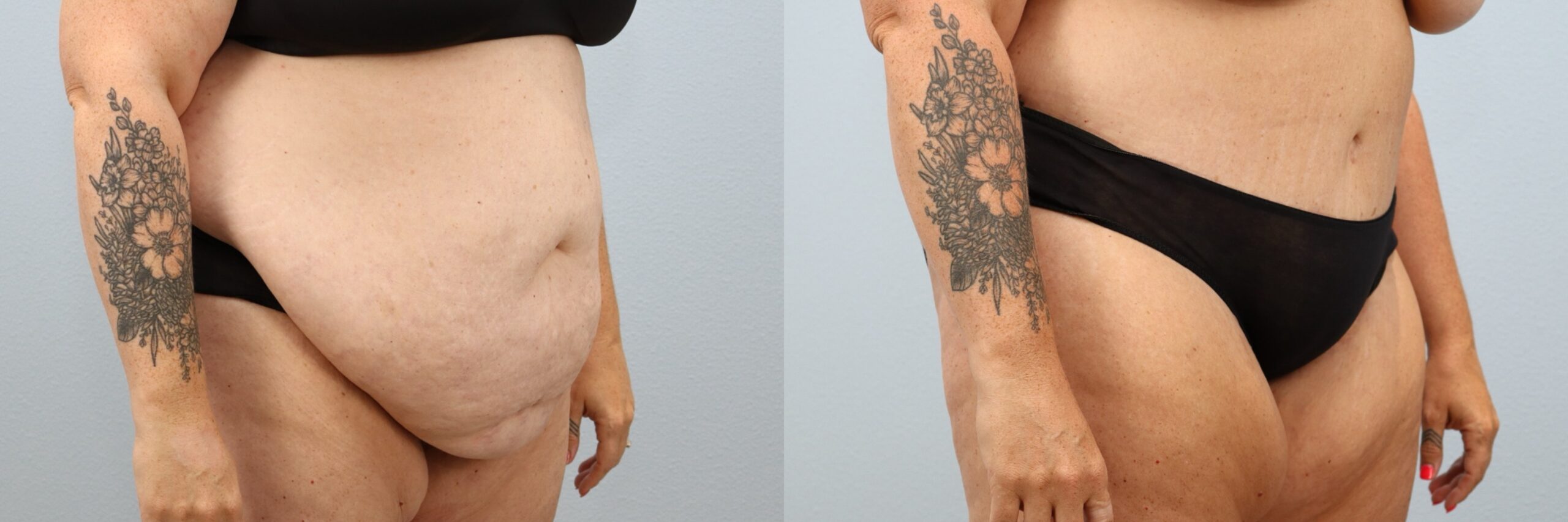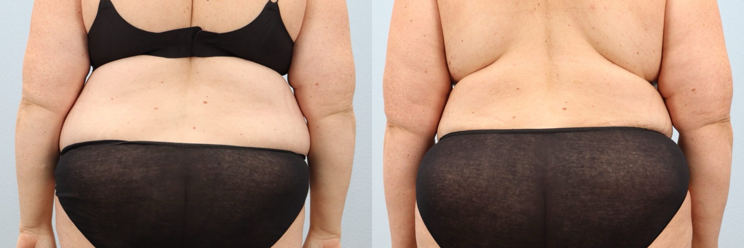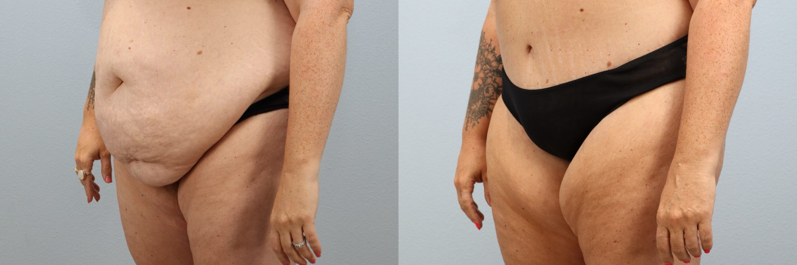 This 35-year-old female patient is shown 8 months after undergoing a tummy tuck (abdominoplasty) with Lipo 360, performed by board-certified plastic surgeon Dr. Neaman. This comprehensive skin removal surgery eliminated excess abdominal skin, tightened weakened muscles, and enhanced body contour. Lipo 360 provided circumferential shaping by targeting the flanks, waistline, and back for a balanced silhouette from every angle. At 8 months post-op, her results reveal a flatter midsection, smoother contours, and improved proportions throughout her torso.