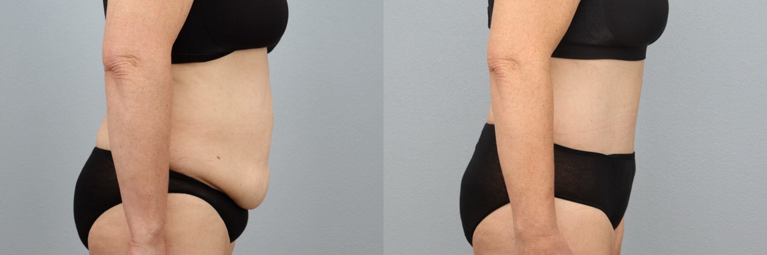 This 58-year-old female patient is pictured 8 months after undergoing a tummy tuck (abdominoplasty) performed by board-certified plastic surgeon Dr. Neaman. The surgery addressed excess abdominal skin and improved core support by tightening the abdominal muscles for a smoother, firmer midsection. A total of 4.25 pounds of tissue was removed to enhance overall contour and balance. At 8 months post-op, her before and after tummy tuck results demonstrate a flatter abdominal profile, more defined waistline, and natural-looking proportions.