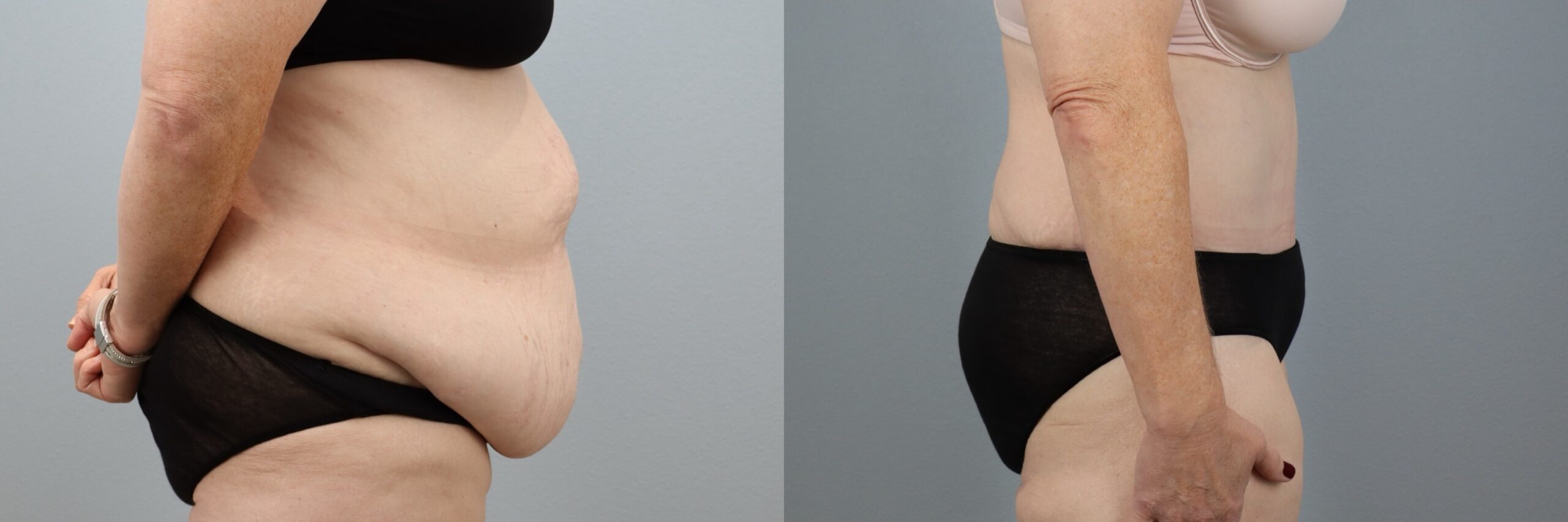 This 60-year-old female patient is shown 6 months after undergoing a tummy tuck (abdominoplasty) with liposuction to the upper abdomen performed by board-certified plastic surgeon Dr. Neaman. The procedure focused on removing excess abdominal skin while refining the upper abdomen to create a smoother, more contoured profile. At 6 months post-op, her before and after tummy tuck results show a flatter abdomen, improved definition, and a natural-looking waistline with continued refinement as healing progresses.