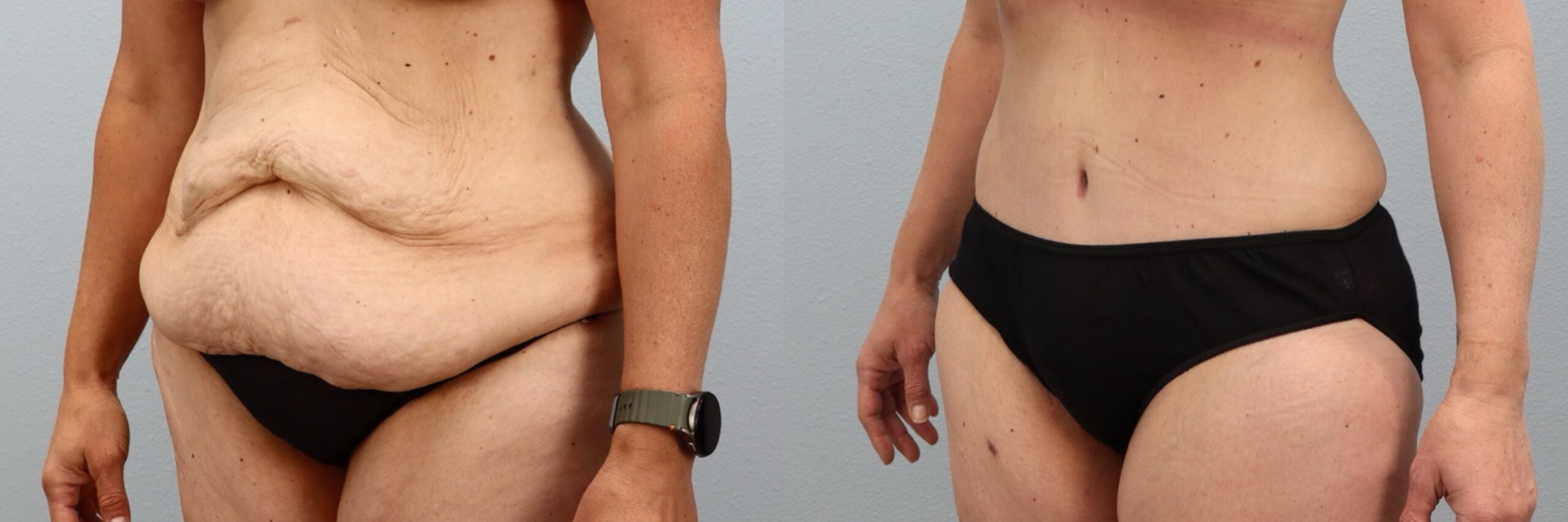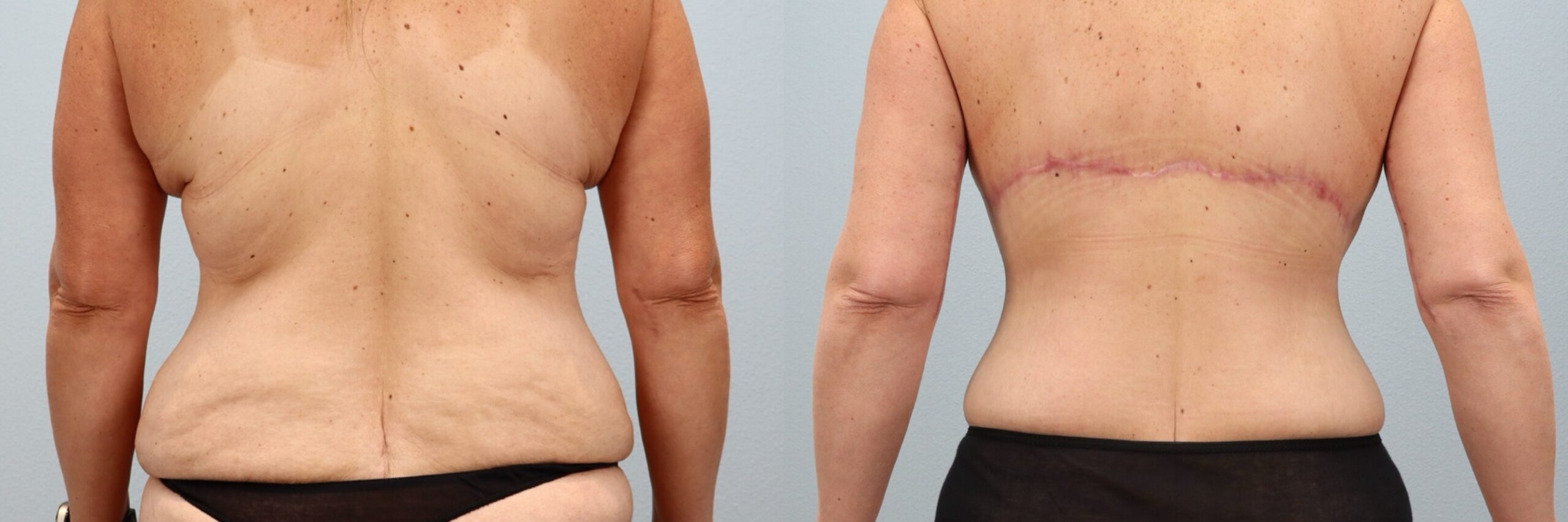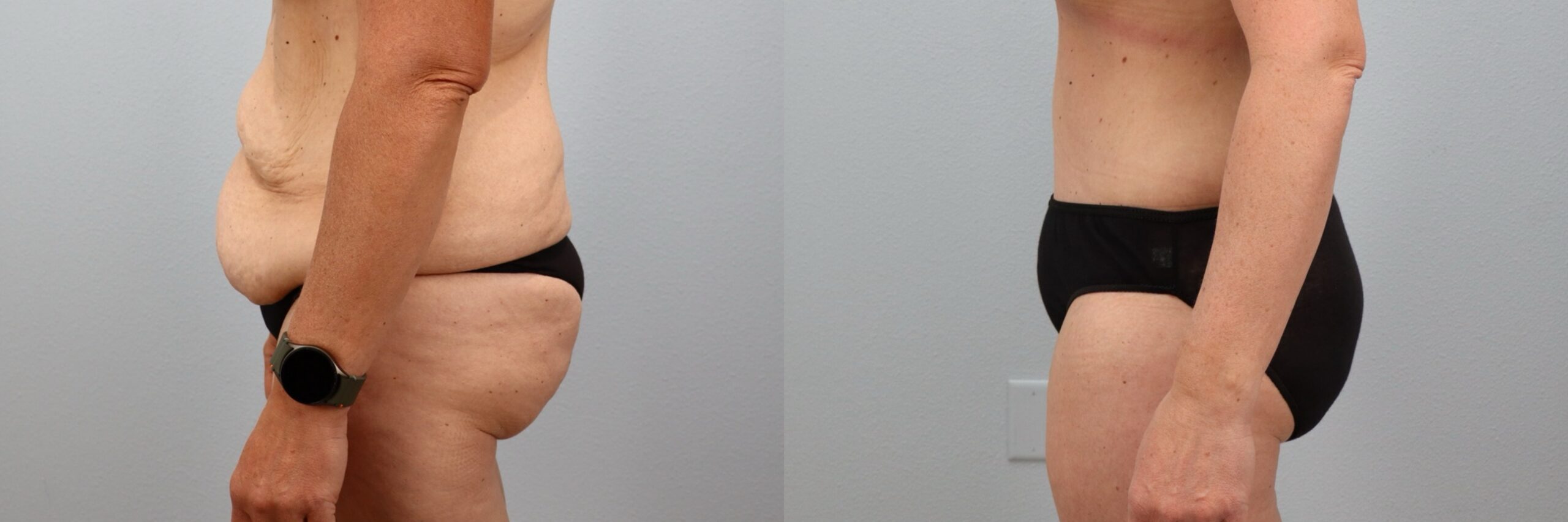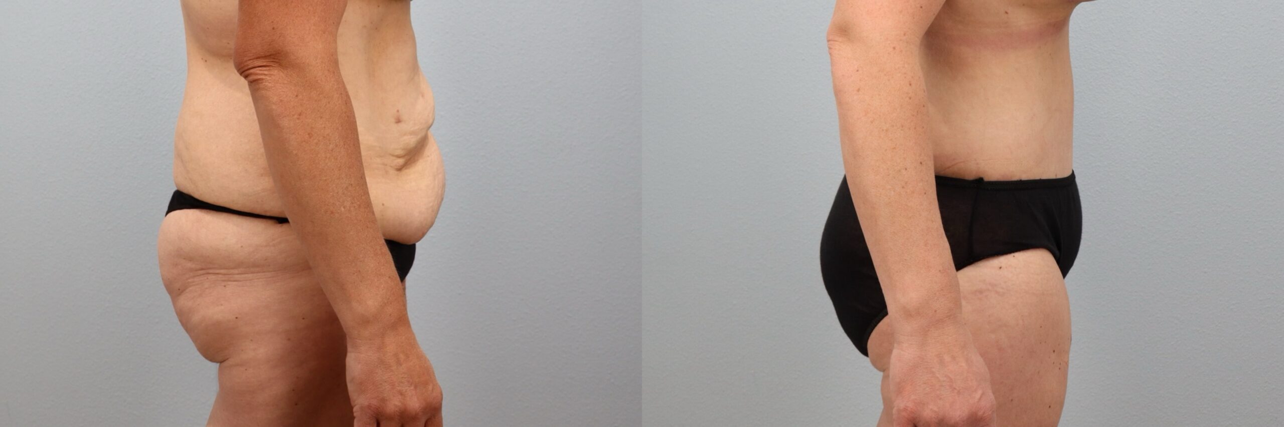 This 48-year-old female patient is shown 7 months after undergoing a Tummy Tuck (Abdominoplasty) with liposuction to the flanks, back and abdomen performed by board-certified plastic surgeon Dr. Neaman. This body contouring procedure removed excess abdominal skin and tightened the underlying muscles to restore a flatter, more supported midsection. Liposuction refined the waistline and smoothed surrounding areas for improved overall contour. Her before and after tummy tuck results highlight enhanced waist definition and a more sculpted silhouette with natural, long-lasting improvement.