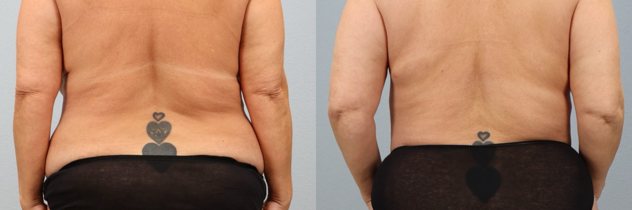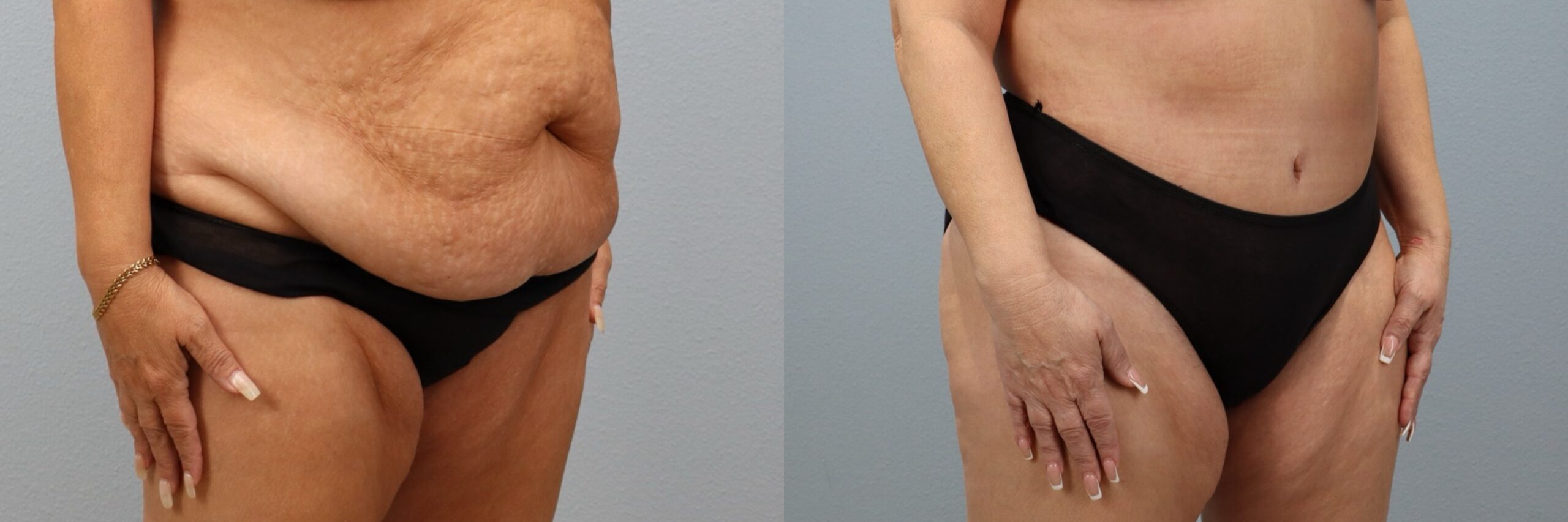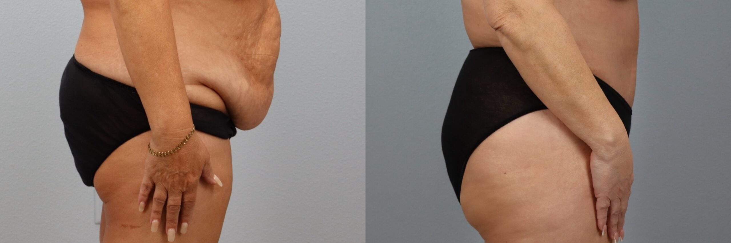 This 55-year-old female patient is shown 6 months after undergoing a Tummy Tuck (Abdominoplasty) with Liposuction to the abdomen performed by board-certified plastic surgeon Dr. Neaman. The procedure removed excess abdominal skin and tightened the midsection while liposuction refined the surrounding contour. By addressing both skin laxity and localized fat, the surgery created a flatter abdomen and improved waist definition. Her before and after results highlight smoother abdominal contour, improved silhouette, and balanced body proportions.