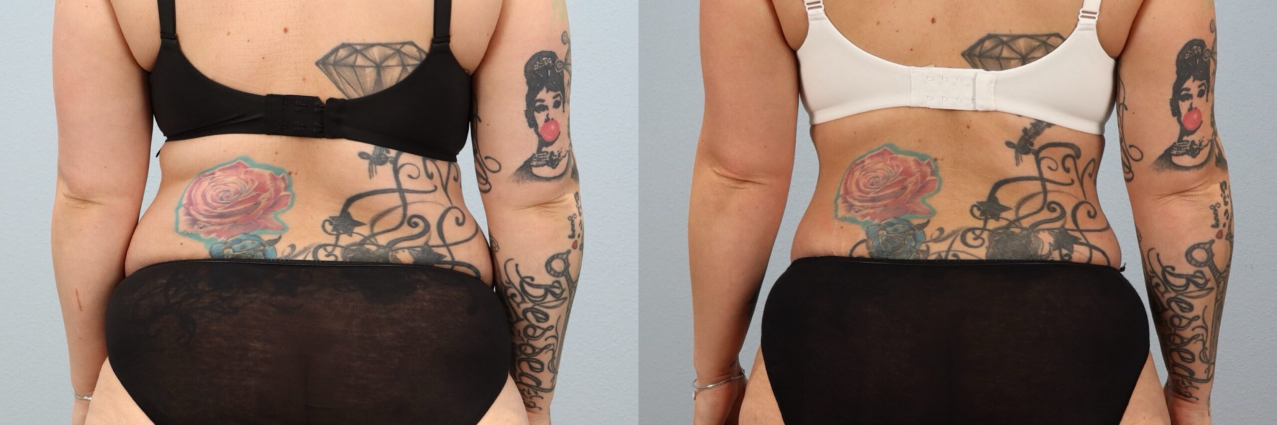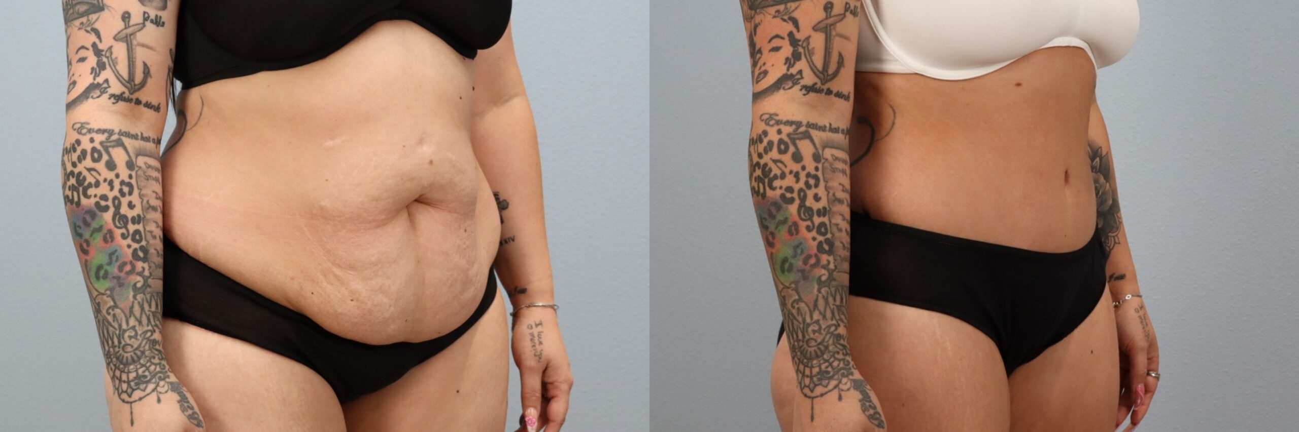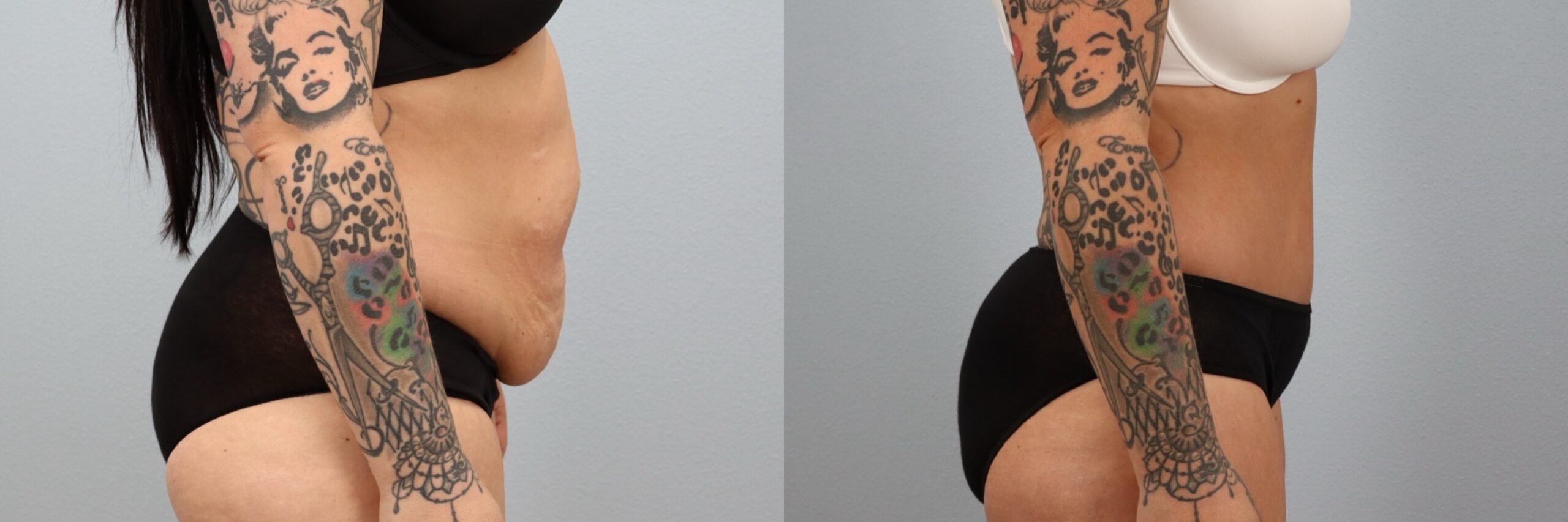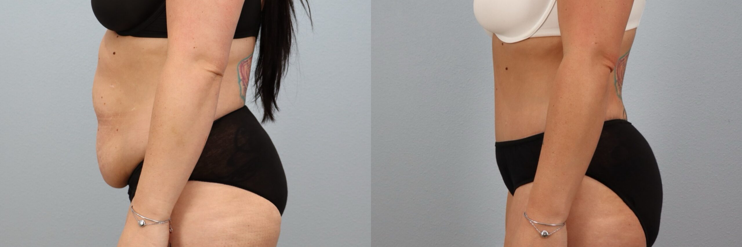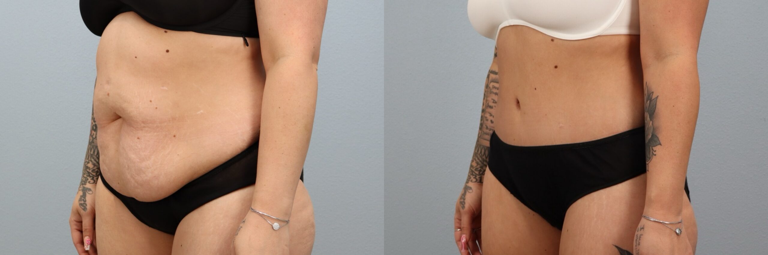This 39-year-old female patient is shown 6 months after undergoing a Full Abdominoplasty (Tummy Tuck) with Liposuction to the flanks performed by board-certified plastic surgeon Dr. Neaman. This procedure removed excess abdominal skin and tightened the underlying muscles to create a flatter, more supported midsection. Liposuction to the flanks refined the waistline and enhanced overall contour. At 6 months post-op, her before and after results demonstrate improved abdominal definition, smoother body lines, and a more sculpted silhouette.