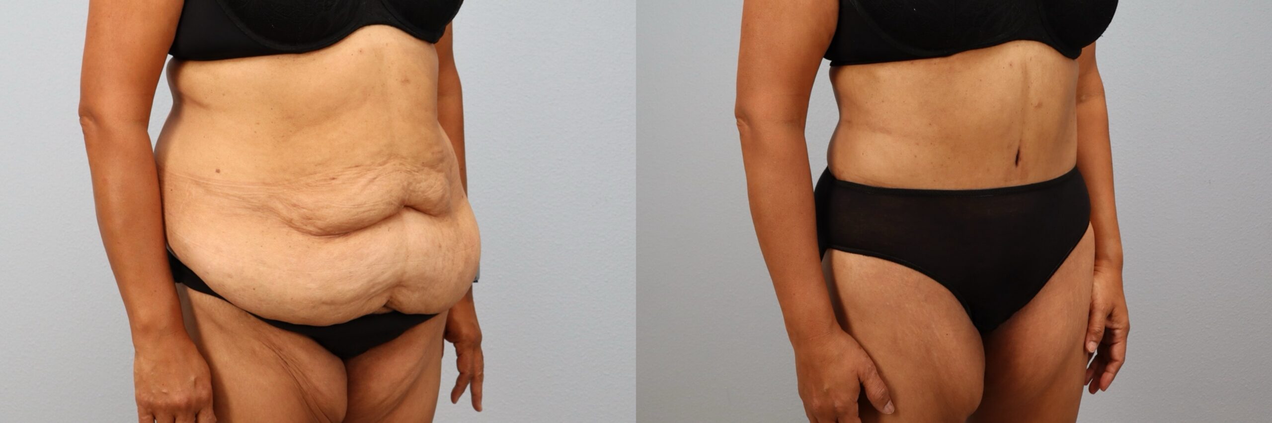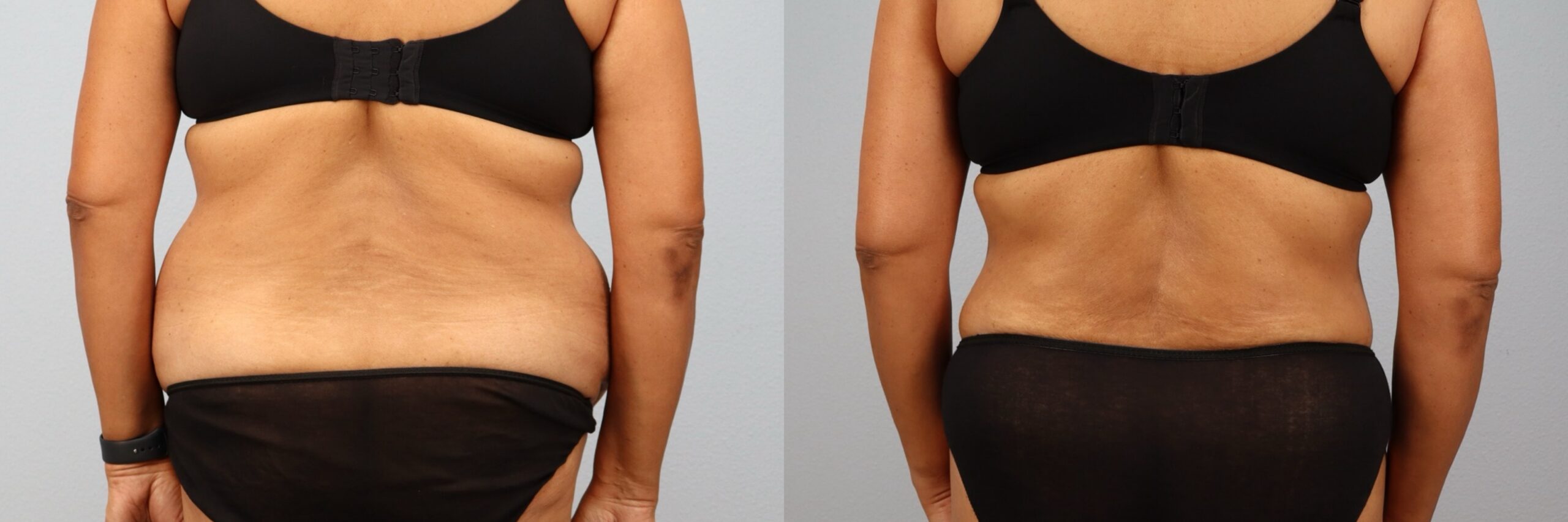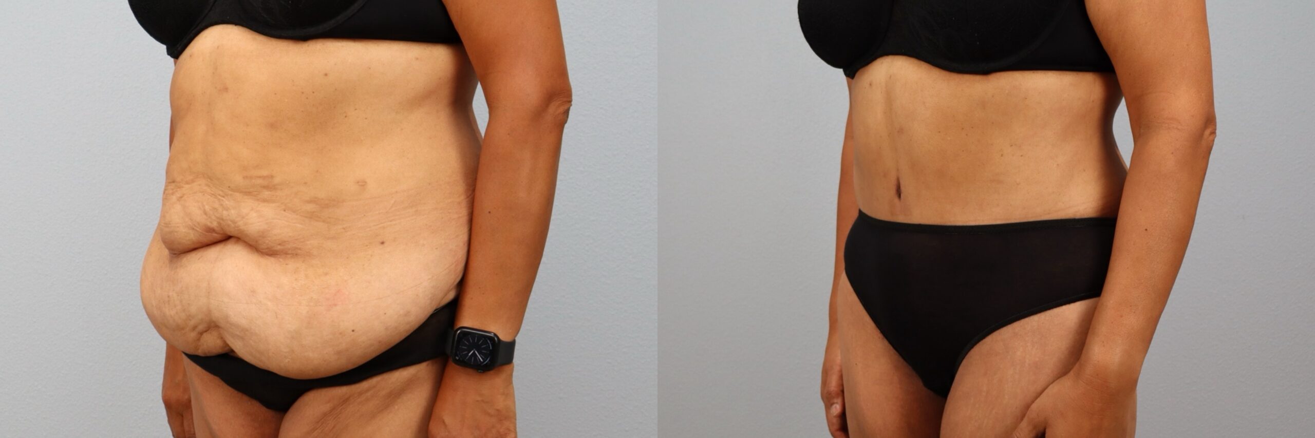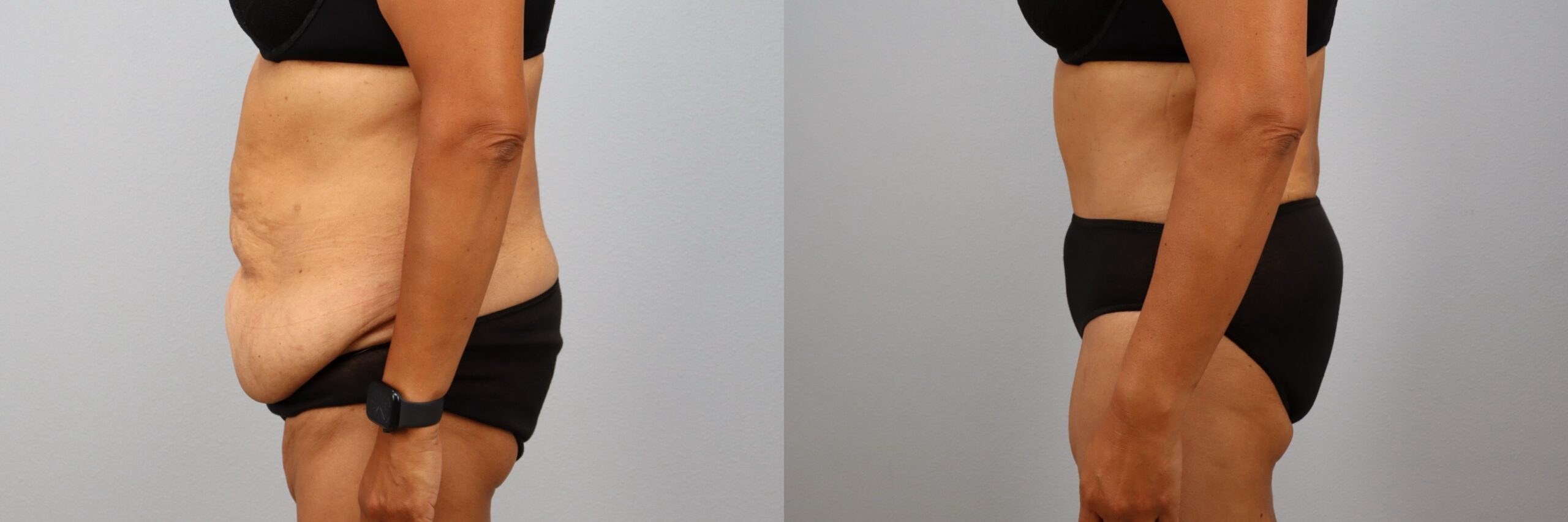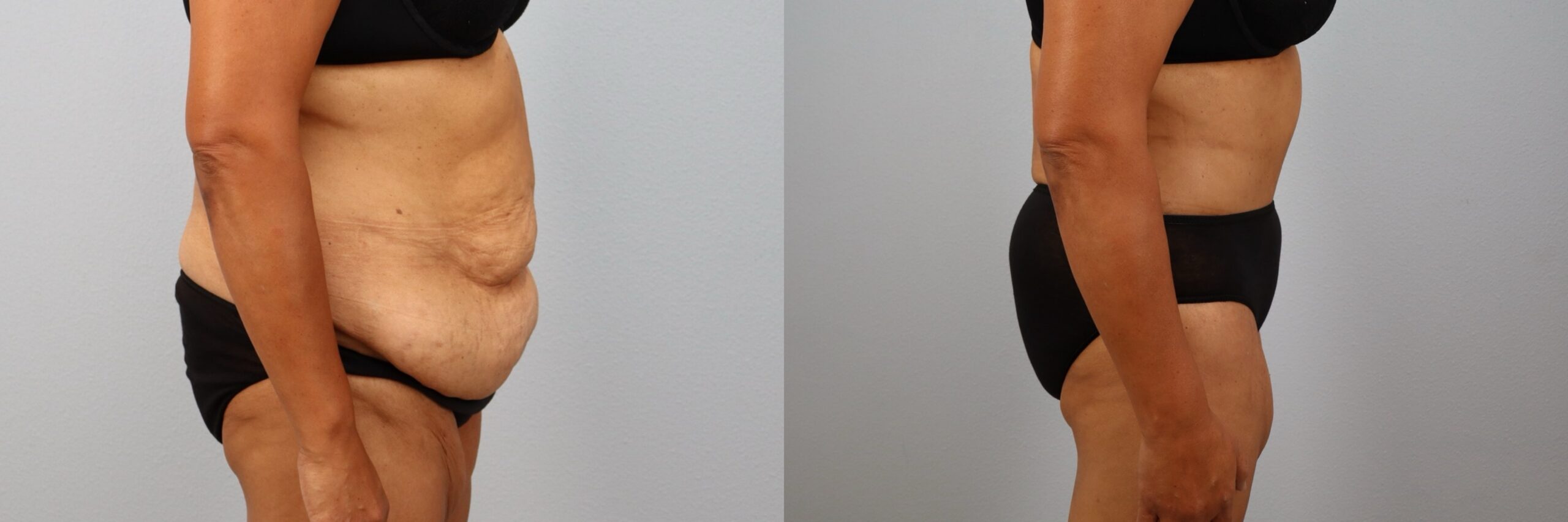 This 60-year-old female patient is shown 5 months after undergoing a Tummy Tuck (Abdominoplasty) with Liposuction to the Flanks, Back, and Abdomen performed by board-certified plastic surgeon Dr. Neaman. This comprehensive procedure removed excess abdominal skin and tightened the midsection while liposuction refined surrounding areas for improved contour. By addressing the abdomen, flanks, and back together, the surgery created smoother transitions and enhanced waist definition. Her before and after results demonstrate a flatter abdomen, improved contour, and a more balanced silhouette.