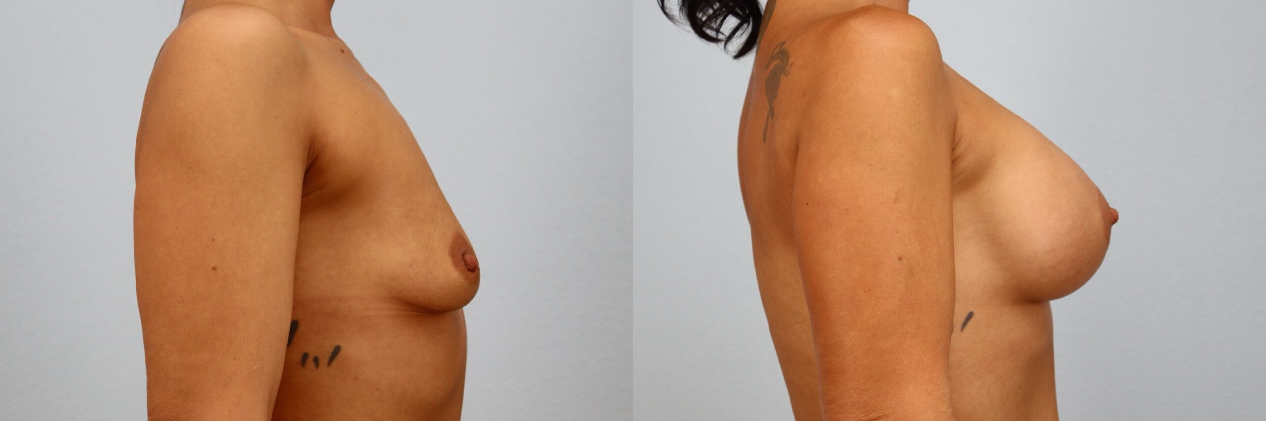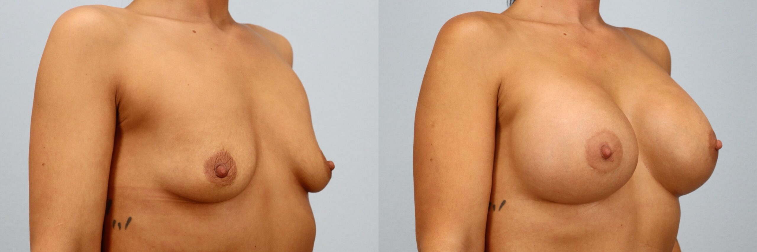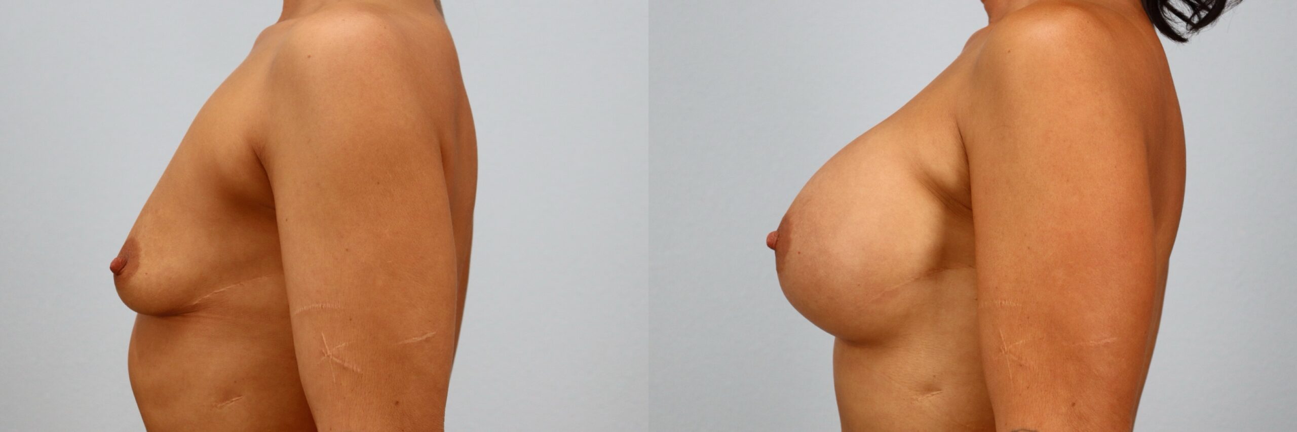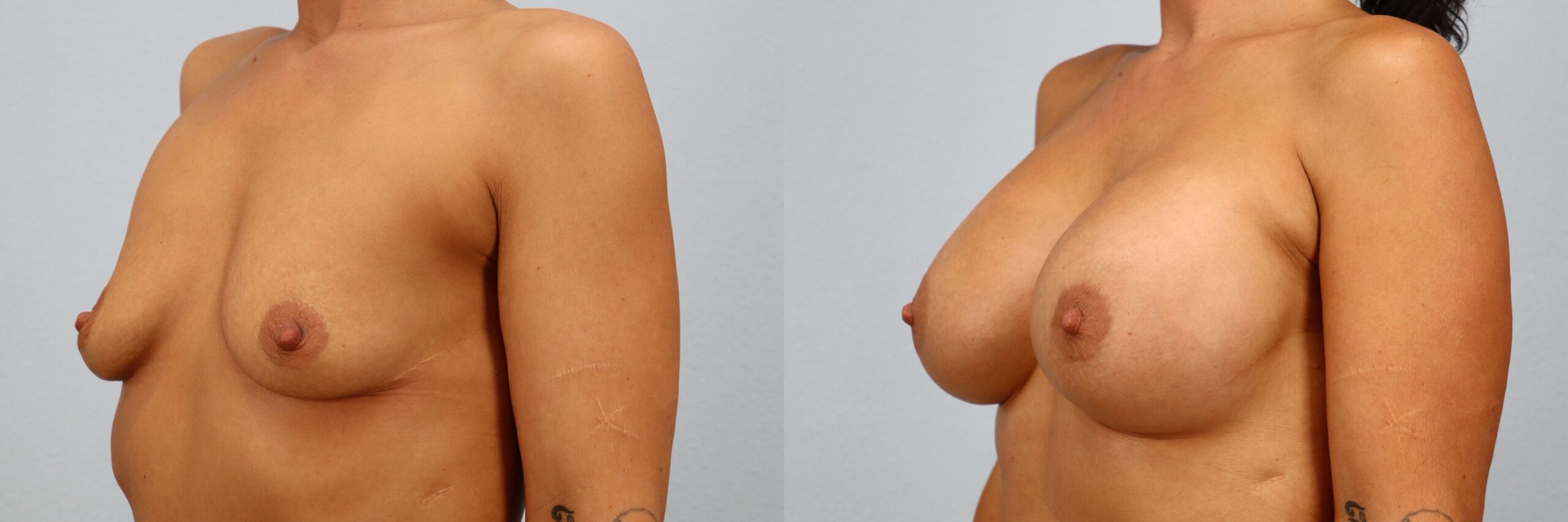 This 45-year-old female patient is shown 6 months after undergoing a breast augmentation performed by board-certified plastic surgeon Dr. Neaman. The procedure enhanced breast size, shape, and projection using 560cc silicone smooth round high profile implants. At 6 months post-op, her results reveal fuller volume, improved upper pole contour, and balanced proportions that complement her frame. The outcome demonstrates a natural, aesthetically pleasing enhancement with long-lasting results.