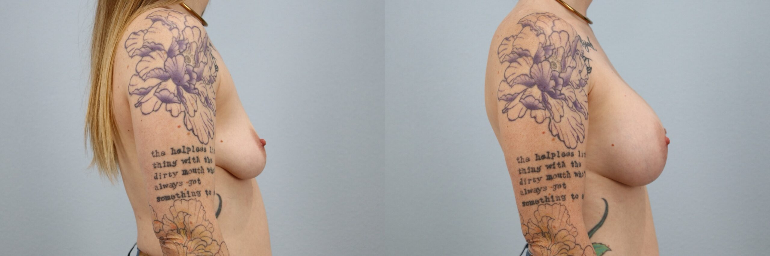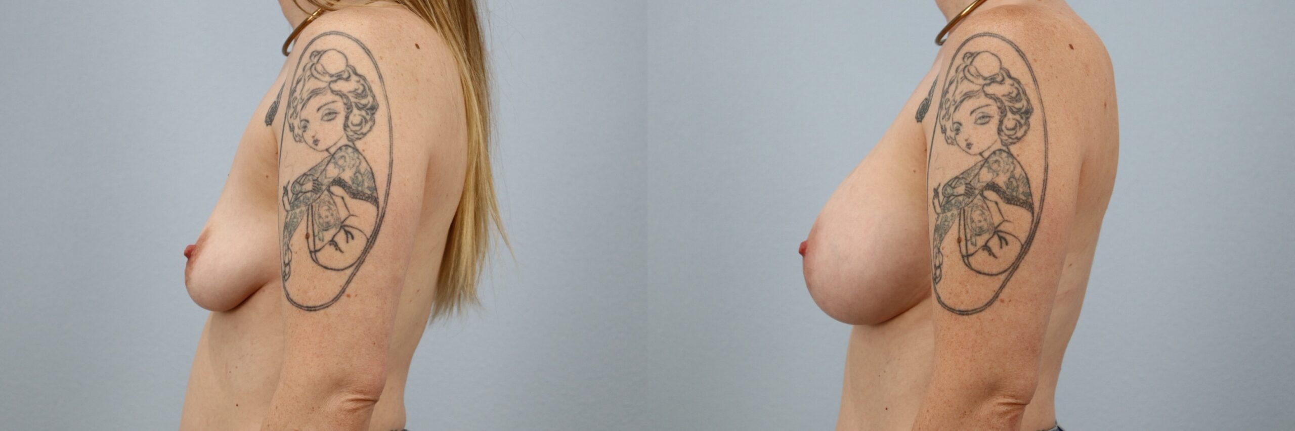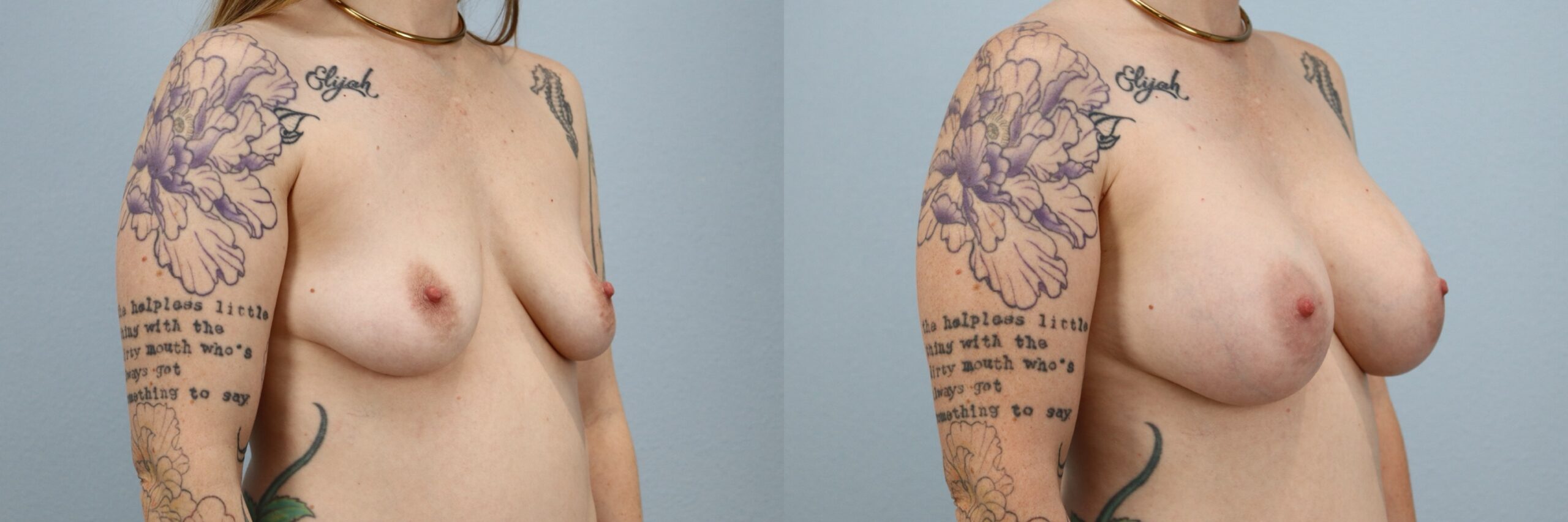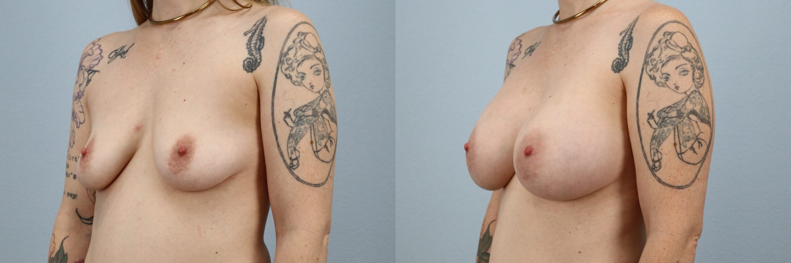 This 37-year-old female patient is shown 8 months after undergoing a breast augmentation performed by board-certified plastic surgeon Dr. Neaman. The procedure enhanced breast volume and contour with 415cc silicone smooth round implants, placed to improve fullness and symmetry. At 8 months post-op, her results highlight a natural shape with balanced projection and long-lasting proportion that complements her frame.