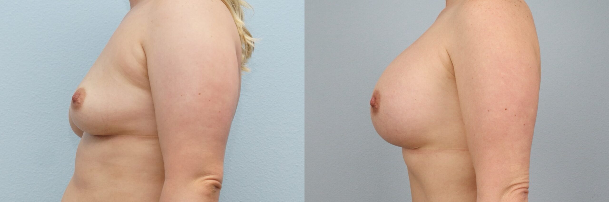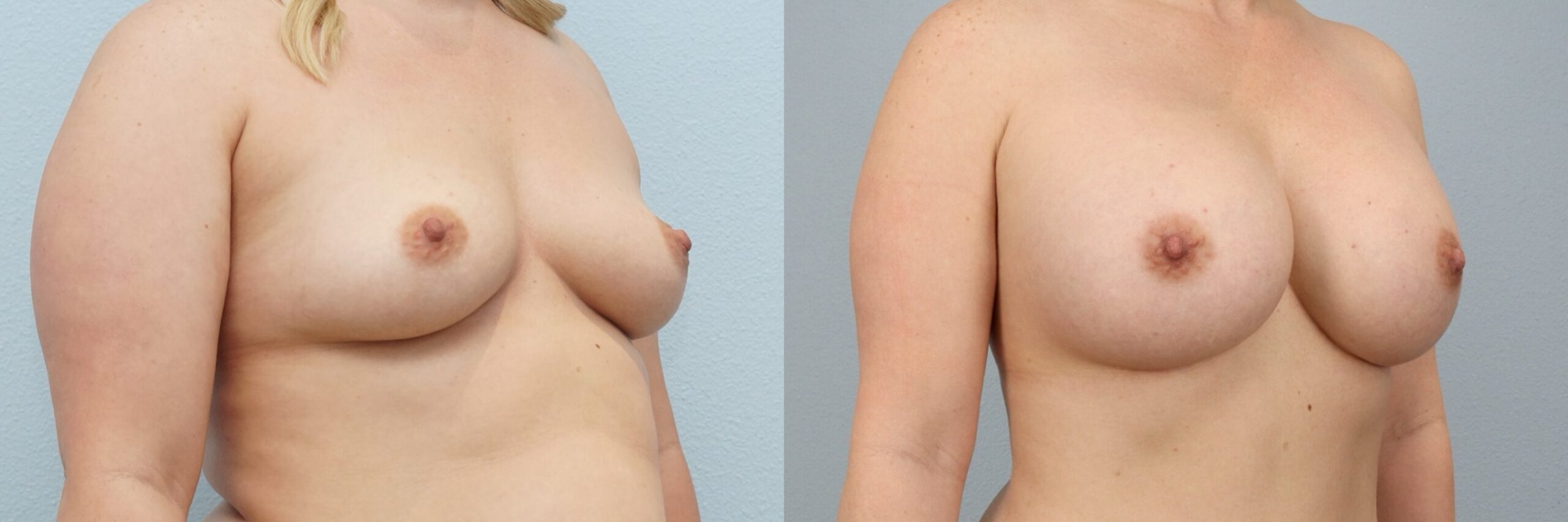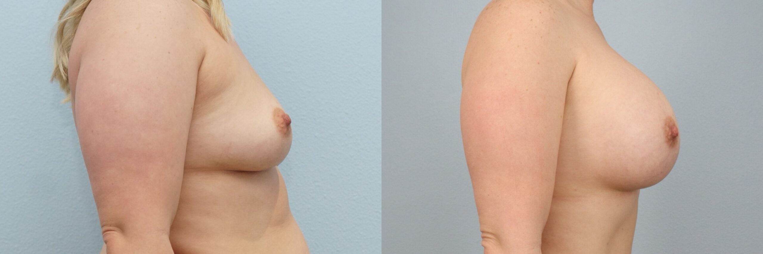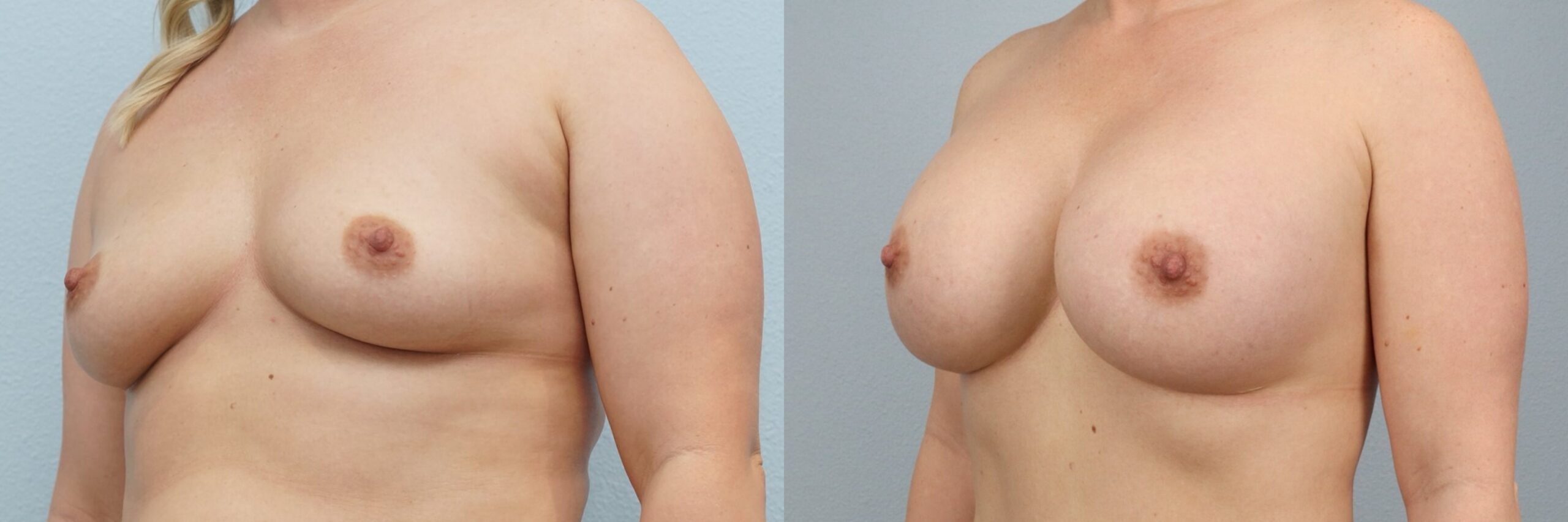 This 36-year-old female patient is shown 5 years after undergoing a Breast Augmentation performed by board-certified plastic surgeon Dr. Neaman. She received 770cc implants to enhance breast volume, projection, and overall contour. The procedure created fuller upper pole definition while maintaining proportion with her frame. At 5 years post-op, her results demonstrate maintained fullness, smooth contour, and balanced symmetry. Her before and after breast augmentation results reflect natural integration and cohesive upper body enhancement.