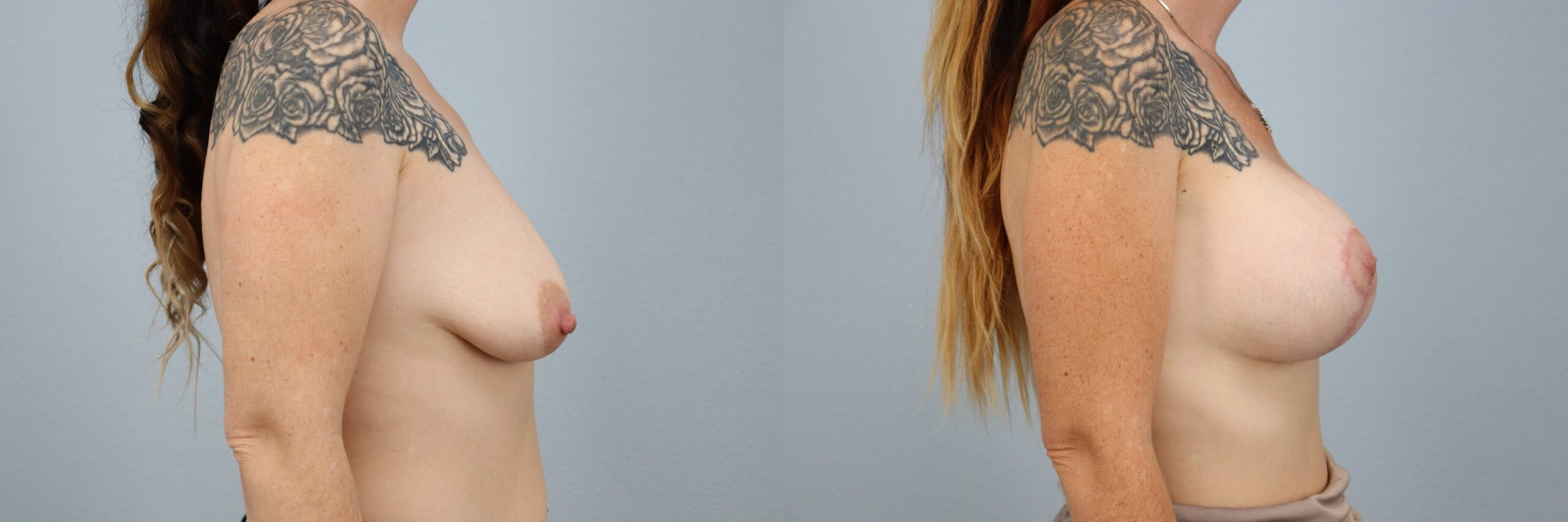 This 35-year-old female patient is shown 6 months after undergoing a breast lift (mastopexy) with implants performed by board-certified plastic surgeon Dr. Neaman. The procedure elevated and reshaped the breasts while enhancing volume and projection with high profile silicone implants placed under the muscle. Implant sizes were 485cc on the right and 520cc on the left, selected to create symmetry and balance. At 6 months post-op, her breasts appear fuller, uplifted, and proportionate to her frame, with natural contour and improved upper pole fullness.