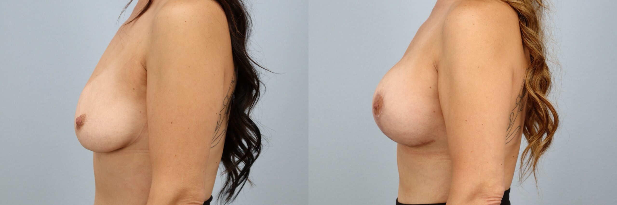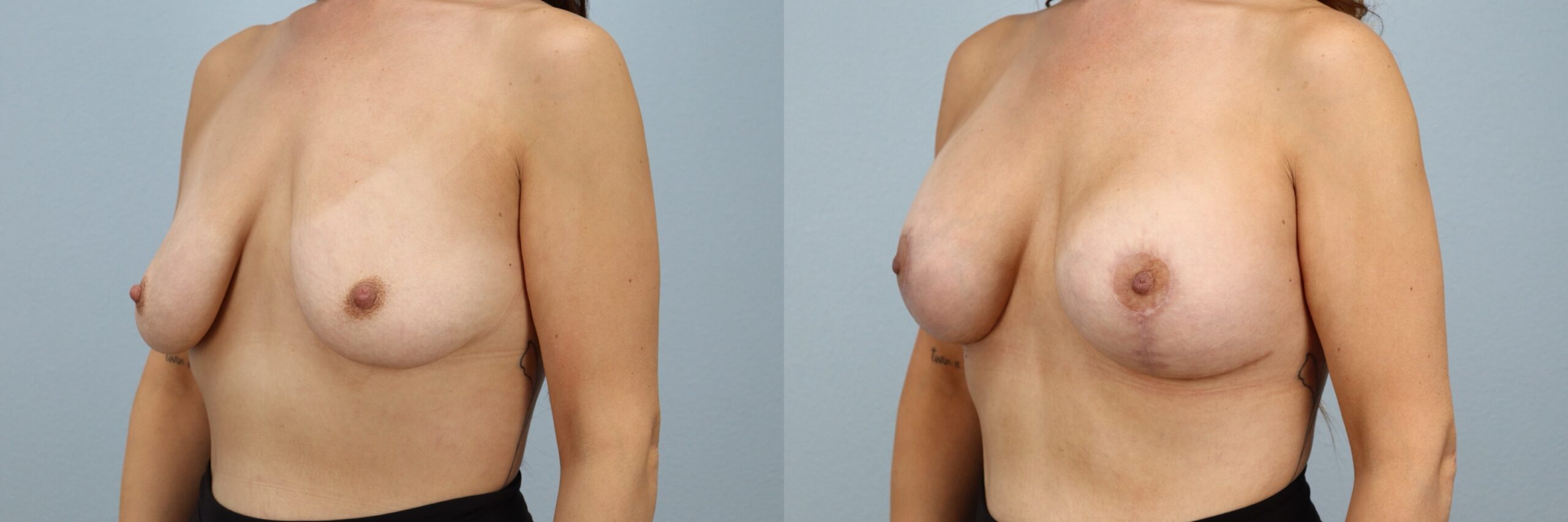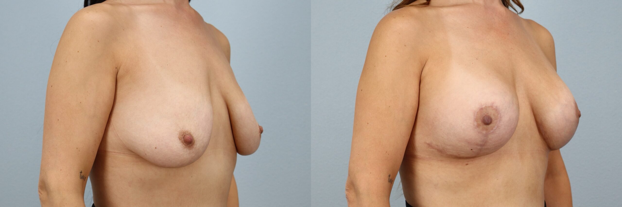 This 41-year-old female patient is shown 6 months after undergoing a breast lift (mastopexy) with implants performed by board-certified plastic surgeon Dr. Neaman. The procedure elevated and reshaped her breasts while enhancing volume and projection with silicone implants. Implant sizes are 385cc on the right and 415cc on the left, selected to create improved balance and symmetry. At 6 months post-op, her breasts appear fuller, more youthful, and proportionate to her frame, with natural contour and long-lasting results.