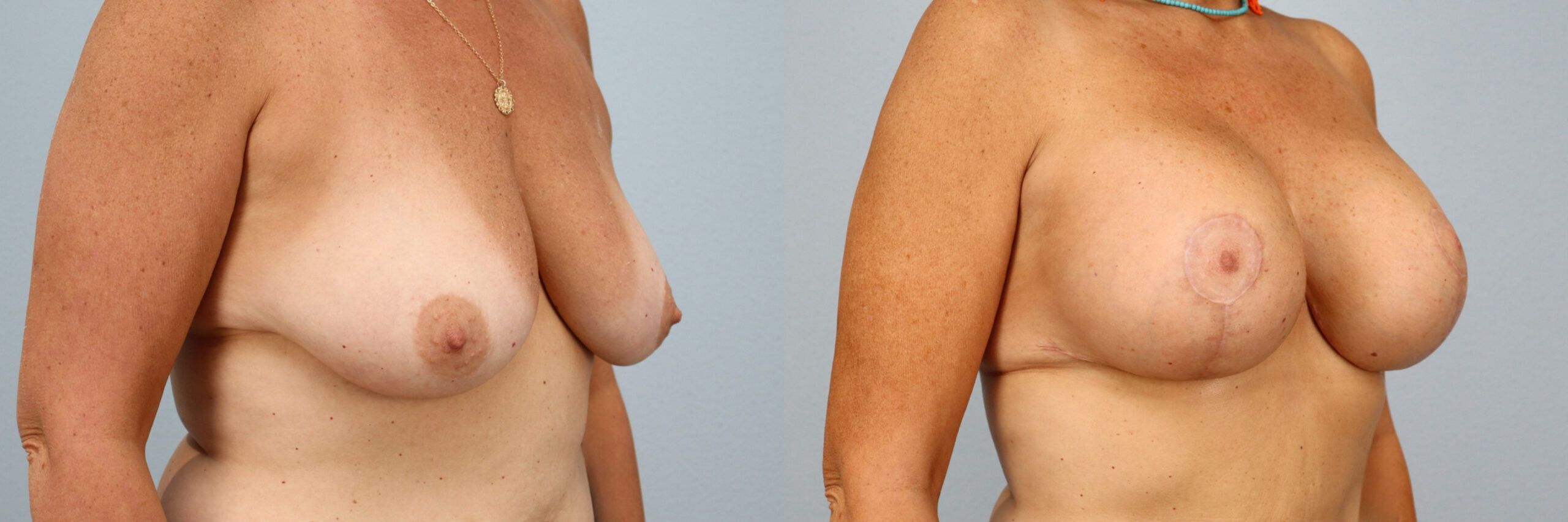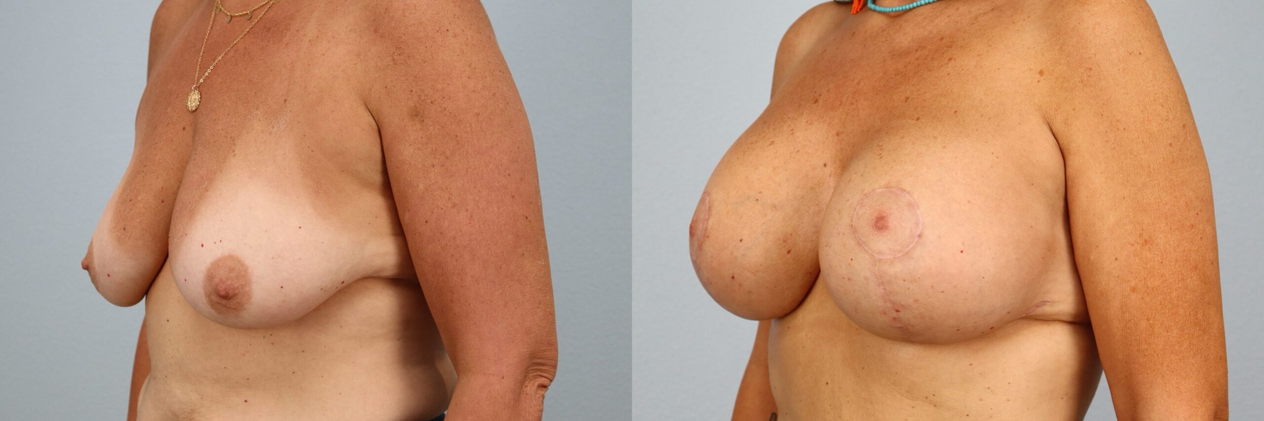 This 43-year-old female patient is shown 6 months after undergoing a breast lift (mastopexy) with implants performed by board-certified plastic surgeon Dr. Neaman. The procedure elevated and reshaped the breasts while restoring volume using 560cc silicone cohesive high-profile implants placed beneath the muscle. At 6 months post-op, her results highlight improved breast position, enhanced fullness, and balanced proportions. The breasts appear well-supported with smooth contours as healing continues to refine the final outcome.
