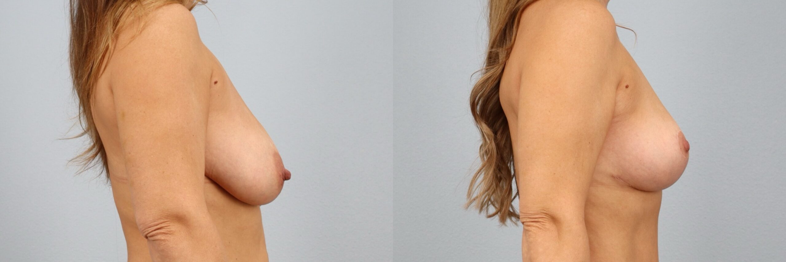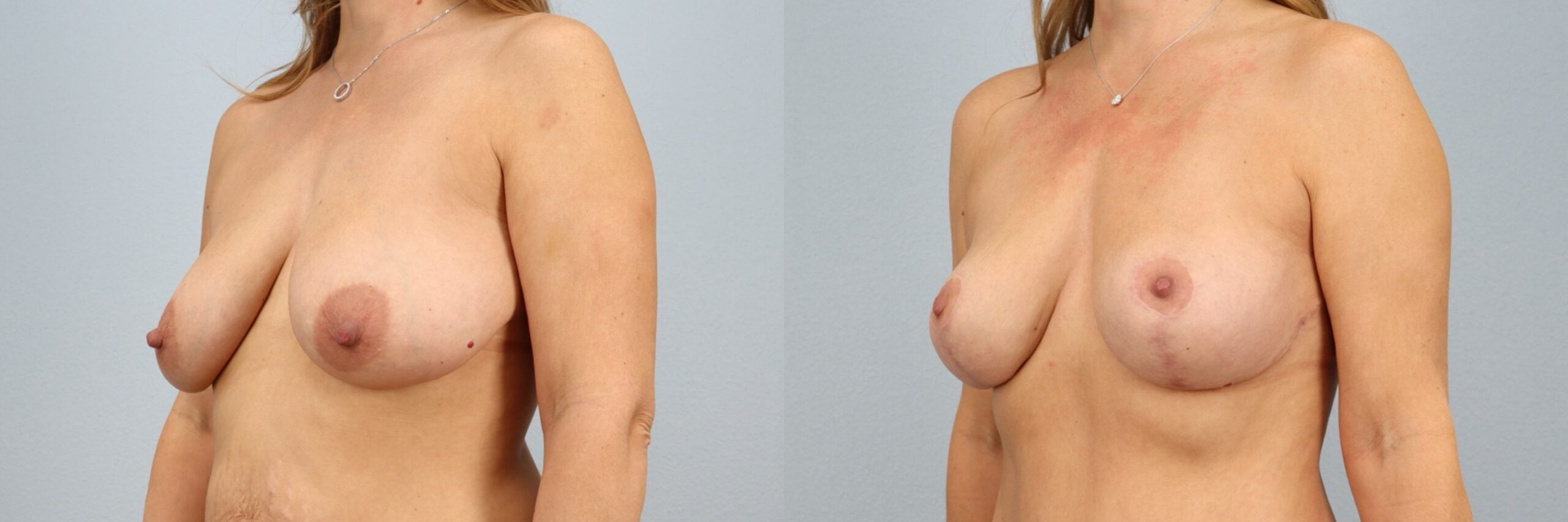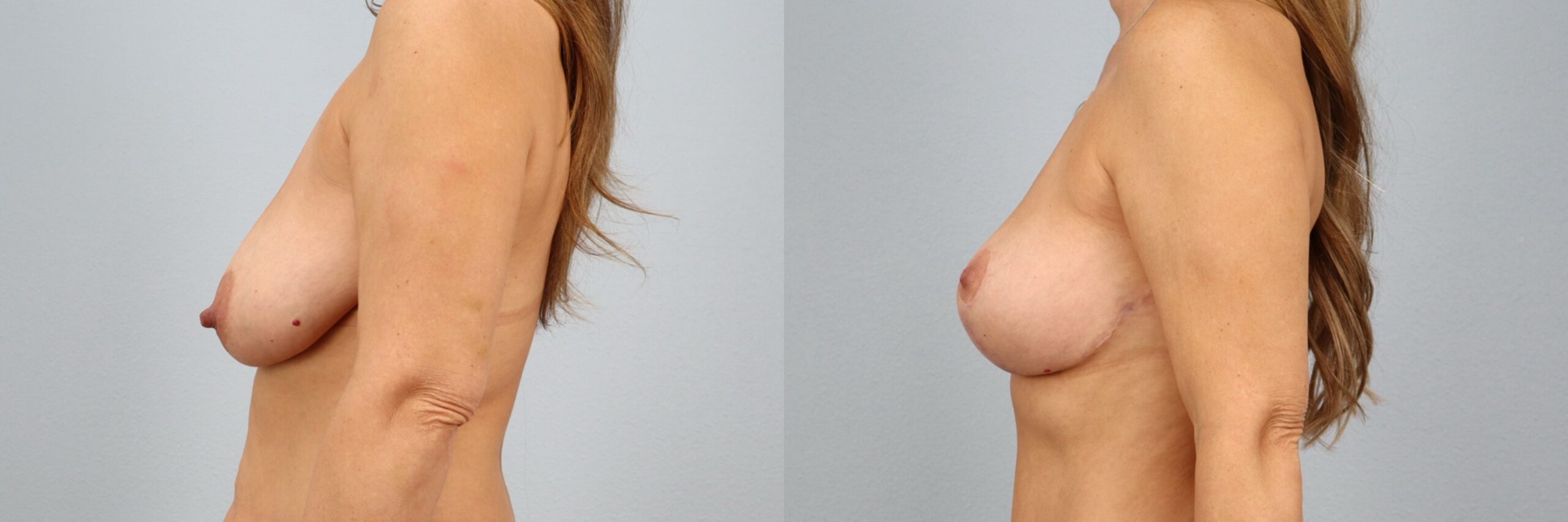 This 43-year-old female patient is shown 7 months after undergoing a breast lift (mastopexy) performed by board-certified plastic surgeon Dr. Neaman. The procedure elevated and reshaped the natural breast tissue to improve position, symmetry, and contour. At 7 months post-op, her results show a more youthful breast profile with improved projection and balance that complements her frame. Continued healing supports long-lasting, natural-looking results.