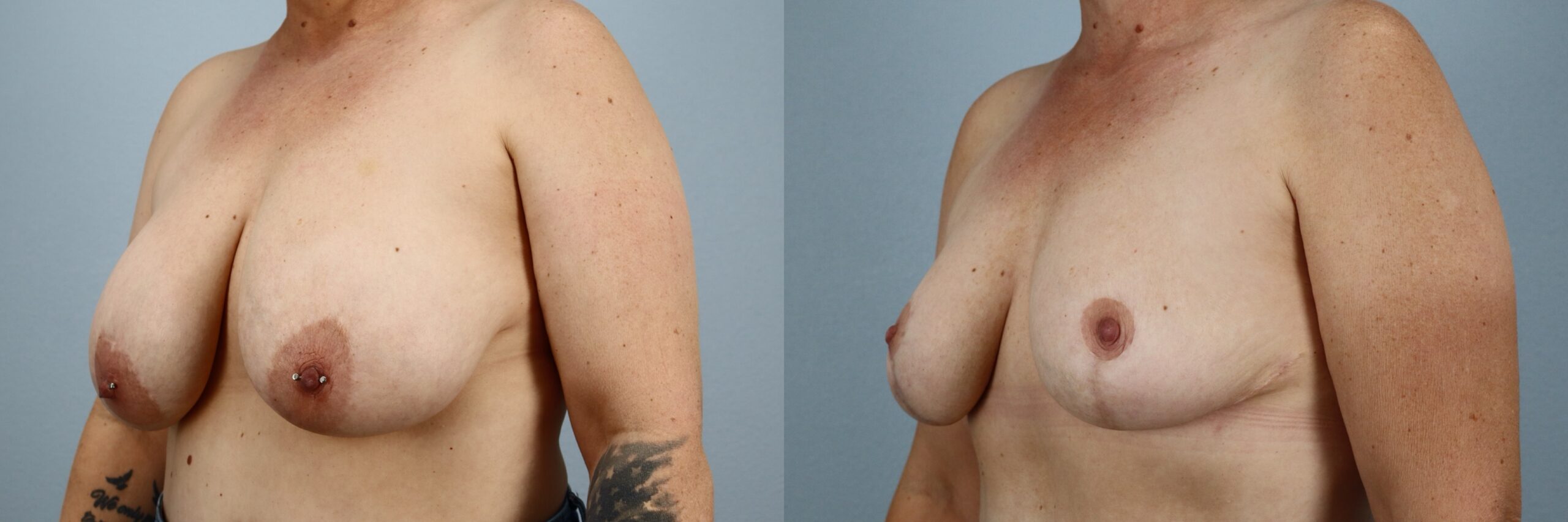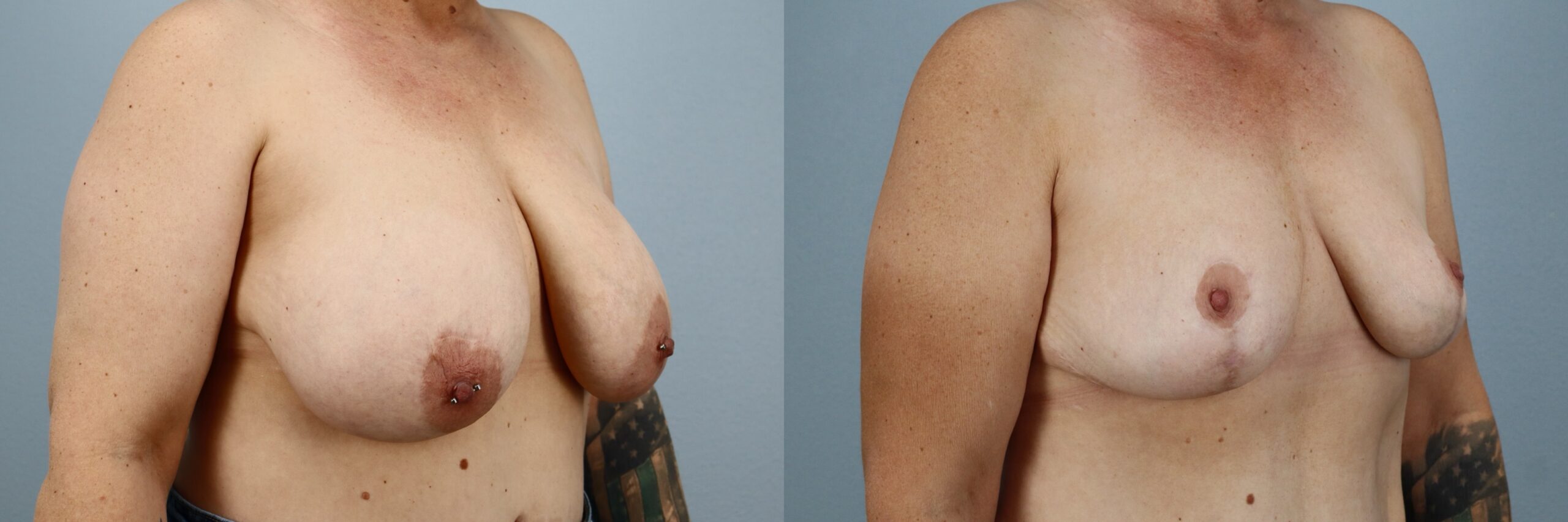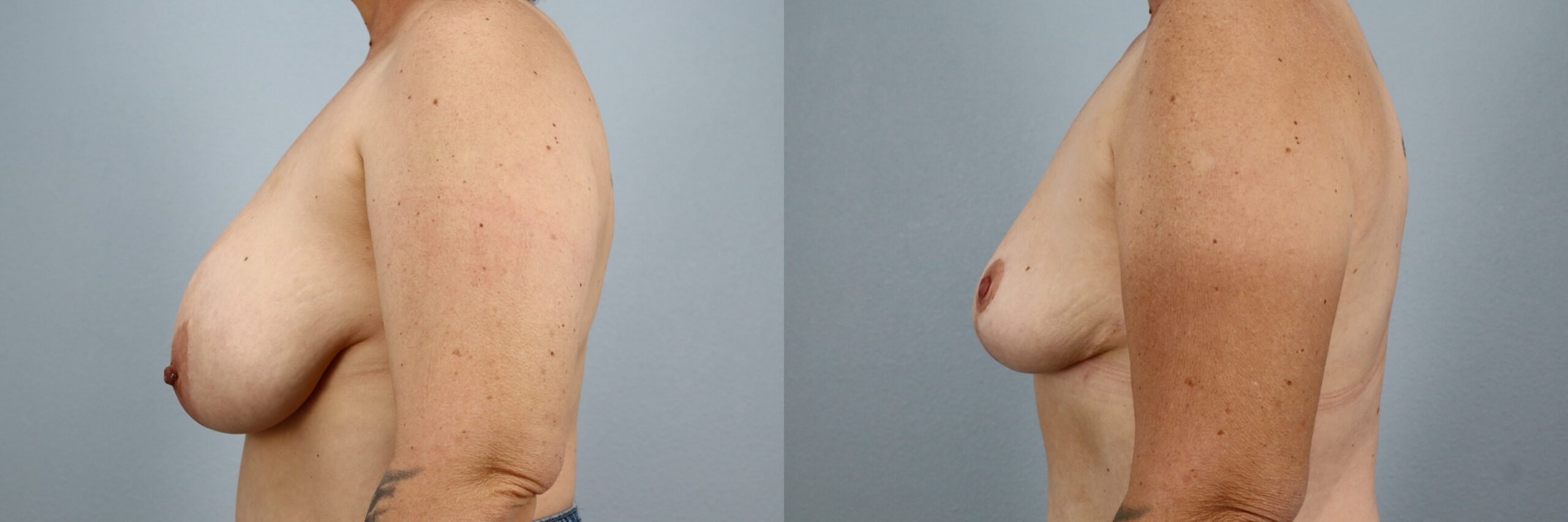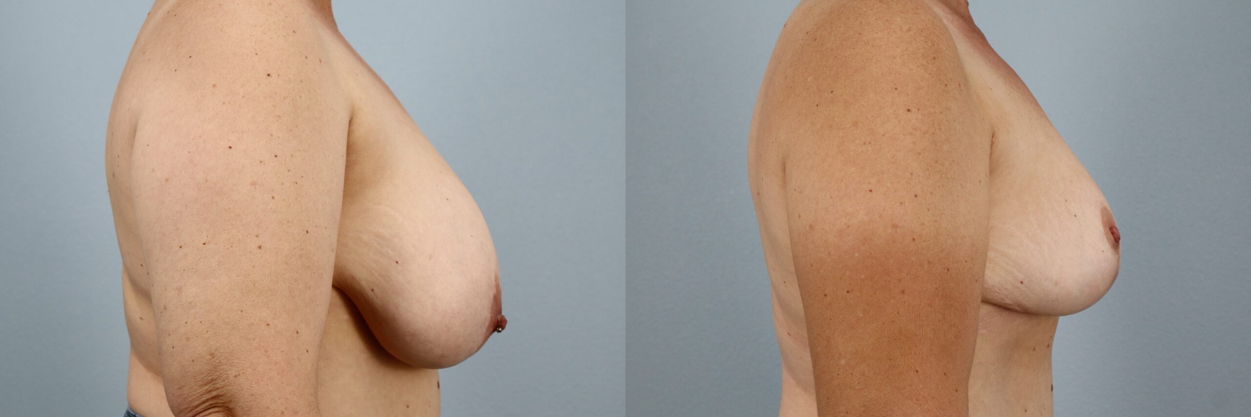 This 51-year-old female patient is shown 12 months after undergoing a Breast Reduction performed by board-certified plastic surgeon Dr. Neaman. This procedure removed excess breast tissue and reshaped the remaining tissue to improve proportion and contour. Breast reduction surgery can help address concerns such as heaviness and imbalance while creating a more comfortable and supported breast shape. At one year post-op, her before and after results demonstrate improved symmetry, refined contour, and a natural breast position that complements her frame.
