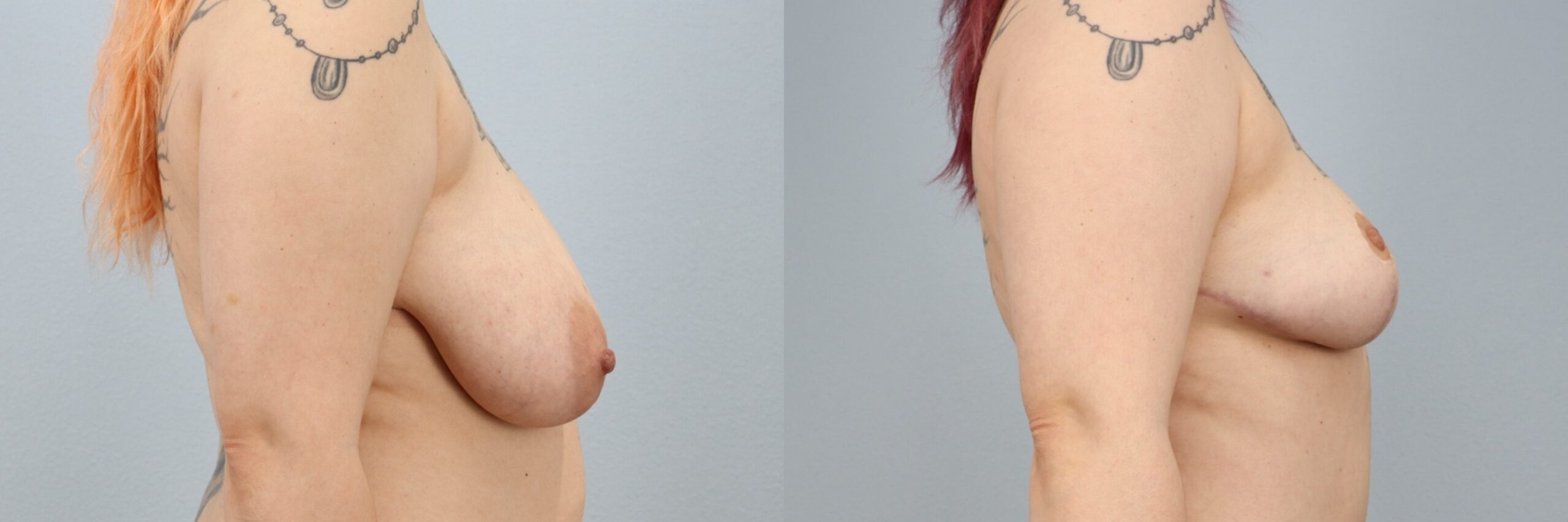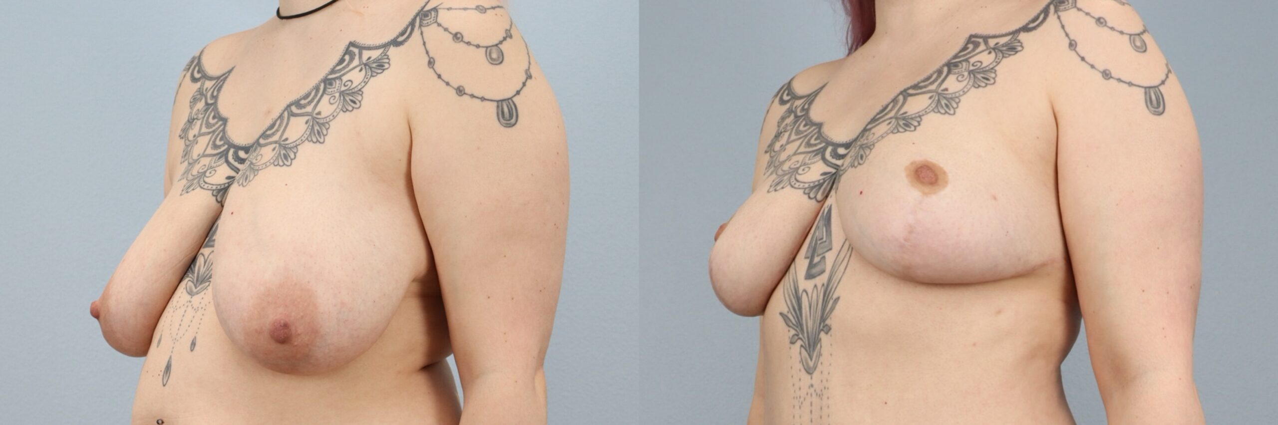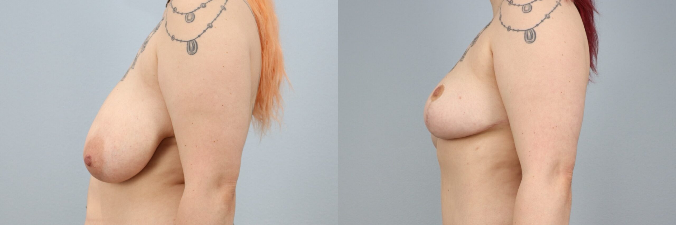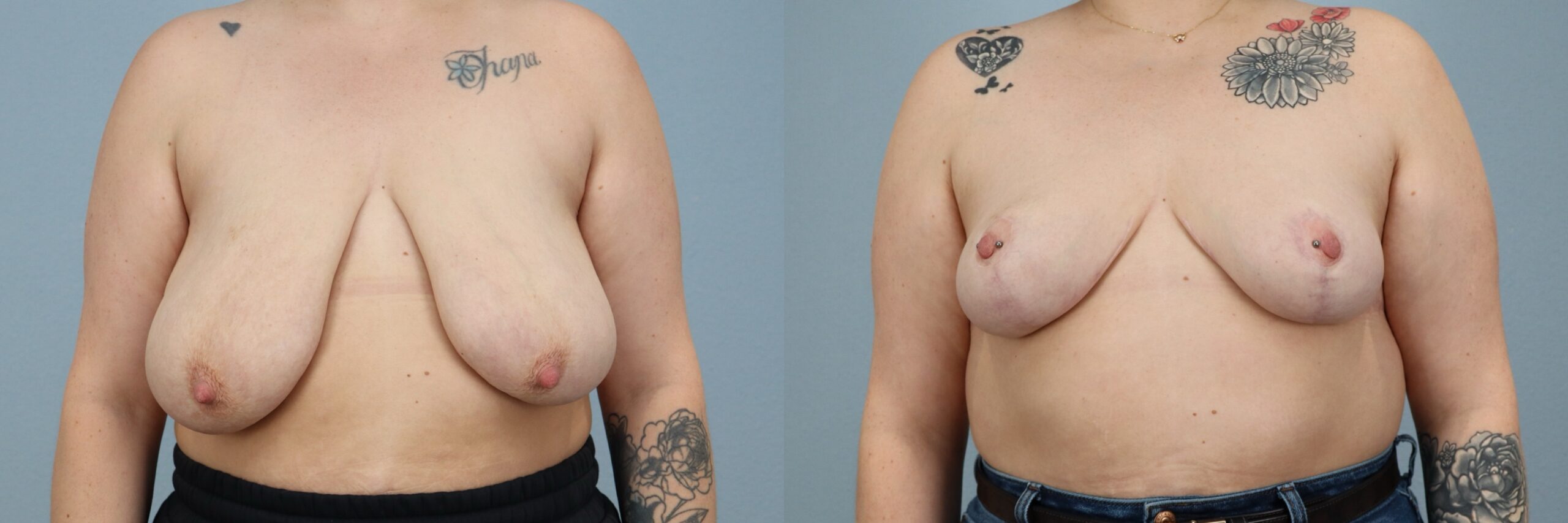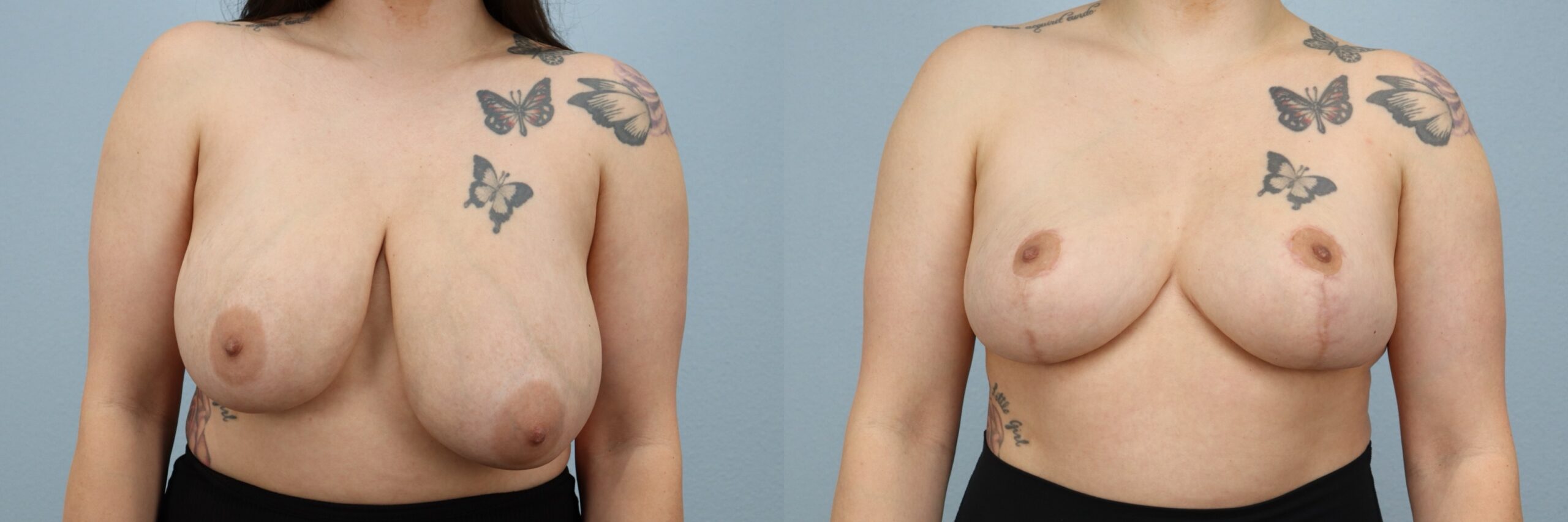 This 34-year-old female patient is shown 6 months after undergoing a breast reduction performed by board-certified plastic surgeon Dr. Neaman. The procedure removed approximately 2 pounds of excess breast tissue to improve breast proportion, reduce heaviness, and create a more balanced appearance. At 6 months post-op, her results show improved breast shape, enhanced symmetry, and a lighter, more comfortable contour that complements her frame. The outcome reflects a natural-looking reduction with long-lasting results.