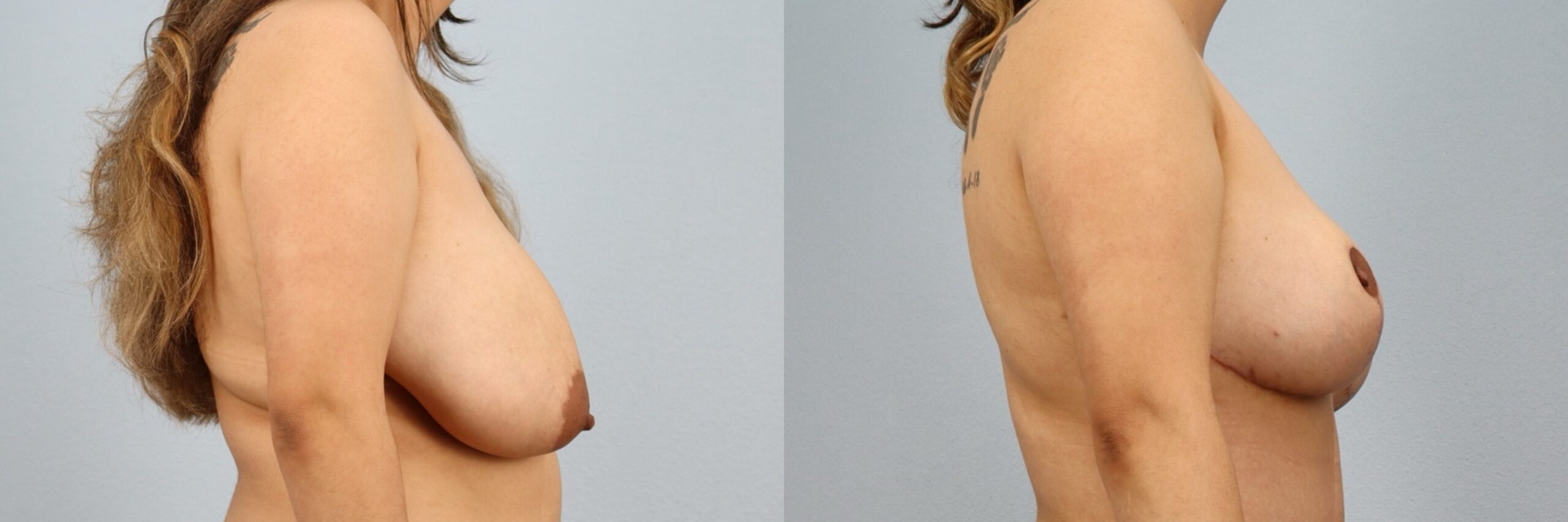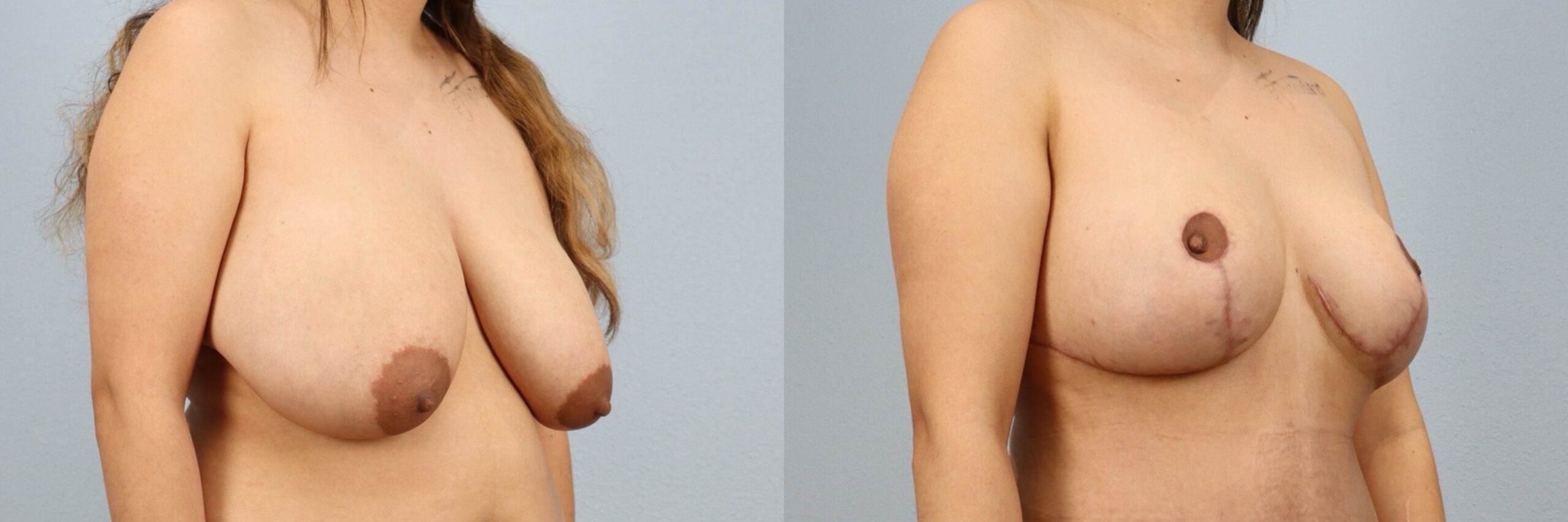 This 30-year-old female patient is shown 6 months after undergoing a breast reduction performed by board-certified plastic surgeon Dr. Neaman. The procedure removed 1250g of breast tissue to reduce excess volume and improve overall breast shape and proportion. At 6 months post-op, her results demonstrate improved symmetry, a lighter breast profile, and a more balanced appearance that complements her frame with natural-looking contour refinement.