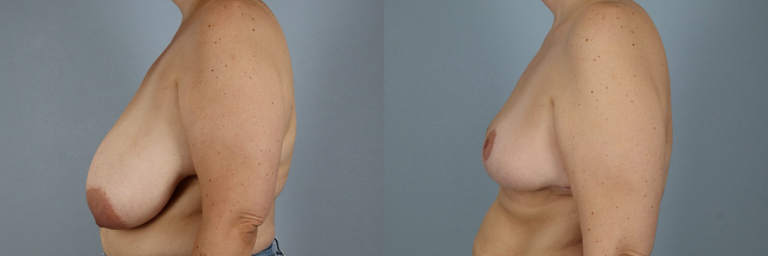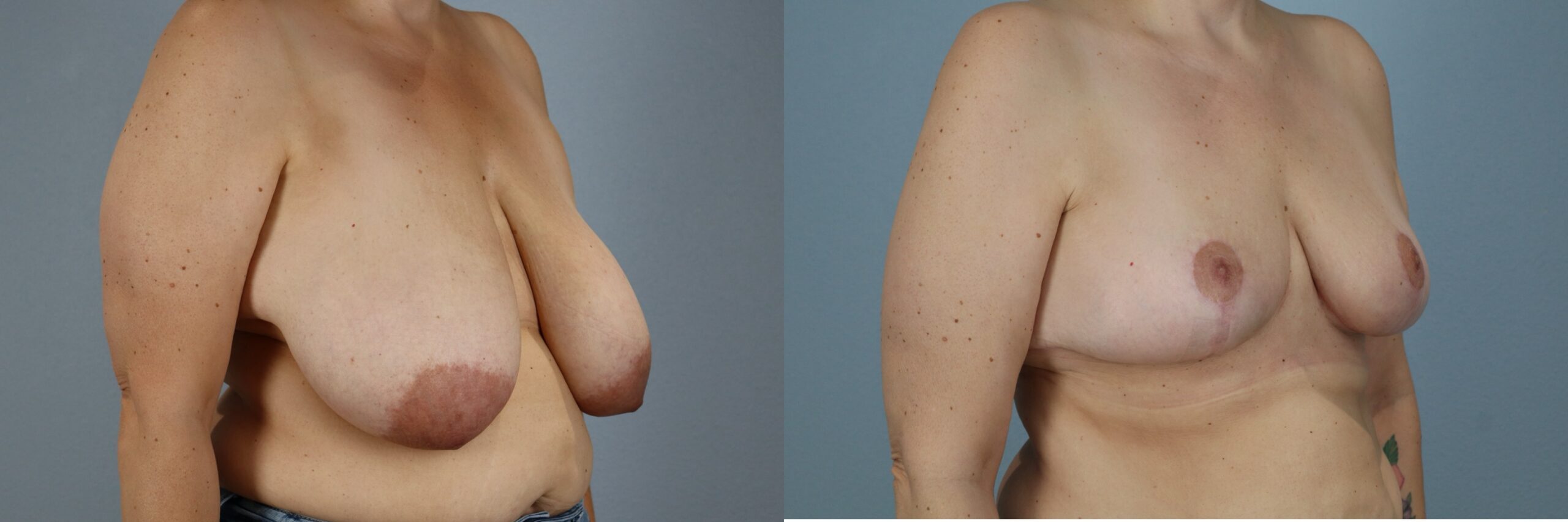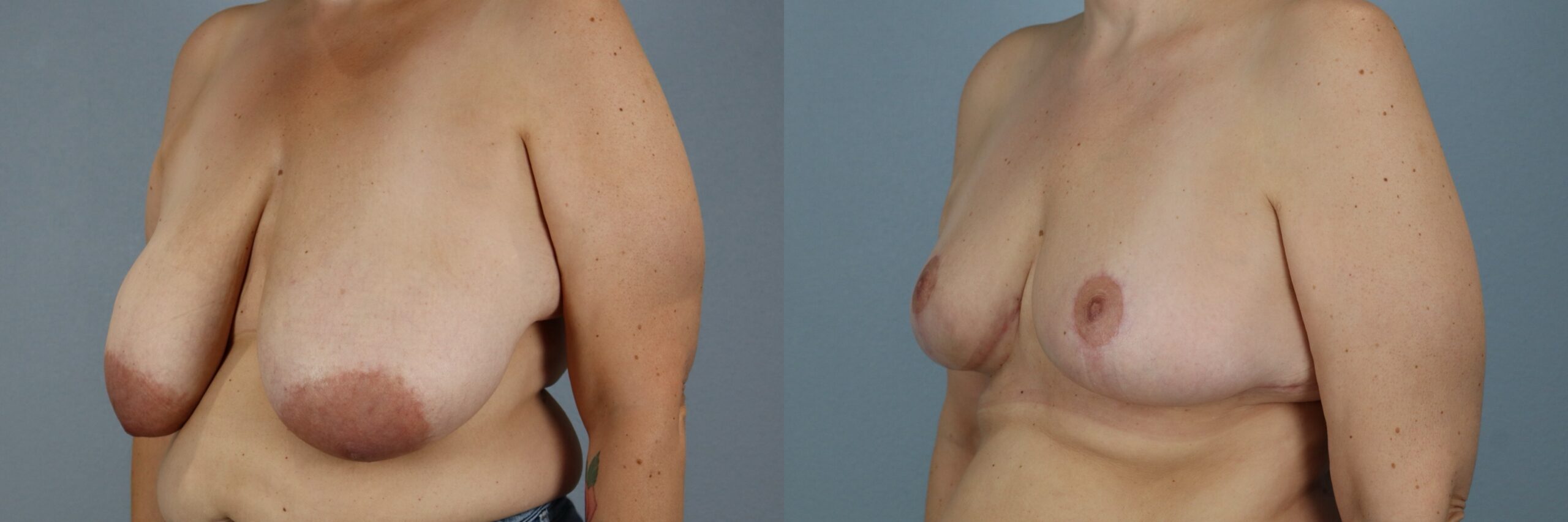 This 44-year-old female patient is shown 3 months after undergoing Breast Reduction performed by board-certified plastic surgeon Dr. Christiansen. The procedure removed excess breast tissue and reshaped the remaining tissue to create improved balance and proportion. Breast reduction surgery can help address concerns related to heaviness, discomfort, and difficulty finding well-fitting clothing. At 3 months post-op, her before and after results demonstrate improved breast contour, enhanced symmetry, and a lifted, well-supported appearance that complements her frame.