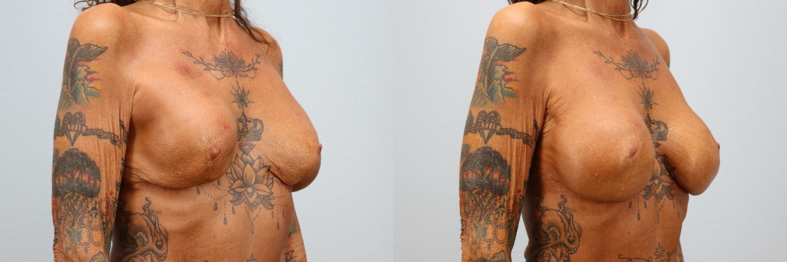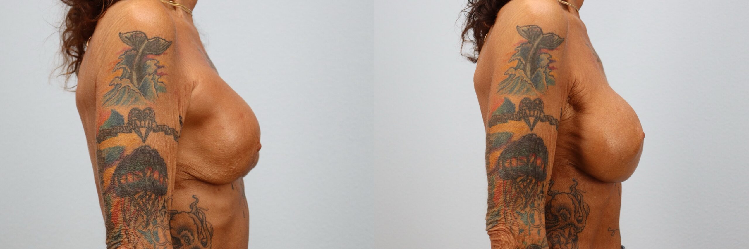 This 69-year-old female patient is shown 6 months after undergoing a bilateral breast lift with implant exchange and capsulectomy performed by board-certified plastic surgeon Dr. Neaman. She previously had breast implants placed by another surgeon, and following a right implant rupture, elected to exchange her implants. A capsulectomy was performed to remove scar tissue, and a breast lift was added to improve shape and position. Her new implants are 450cc on the right and 415cc on the left, selected to restore symmetry and volume. At 6 months post-op, her results highlight improved breast contour, balanced proportions, and a natural, rejuvenated appearance.
