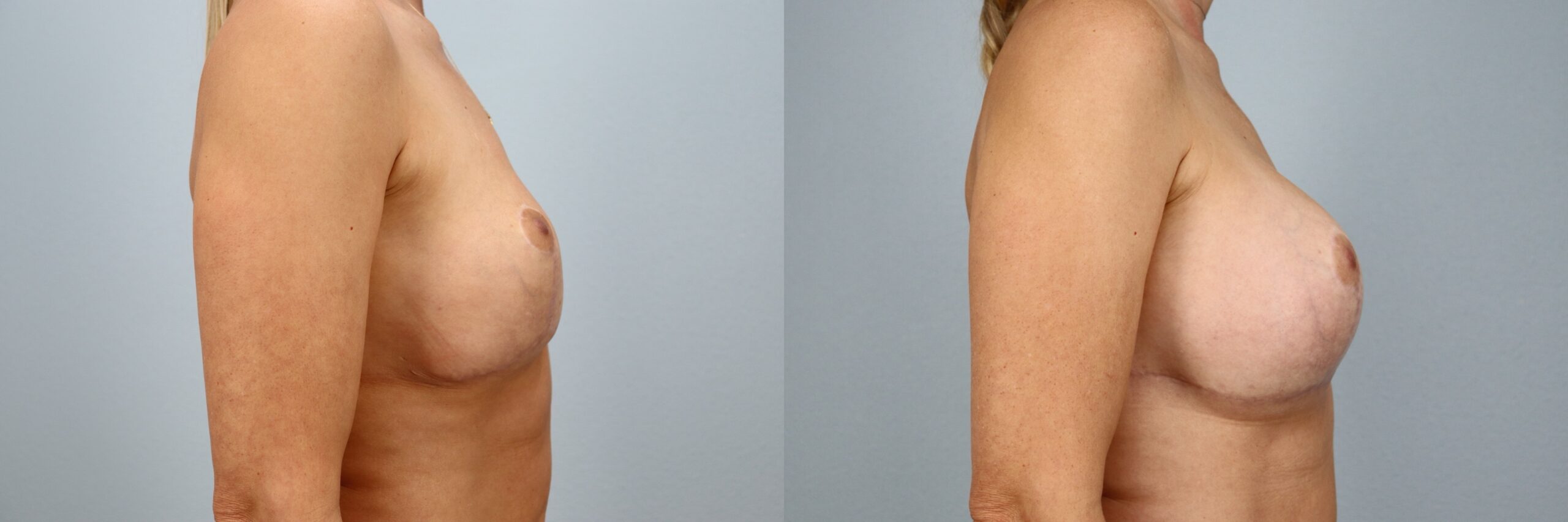 This 48-year-old female patient is shown 6 months after undergoing a breast augmentation with inframammary fold (IMF) reconstruction performed by board-certified plastic surgeon Dr. Neaman. The patient previously had breast implants that were removed, and this procedure focused on restoring implant support, shape, and symmetry. New high-profile silicone implants sized at 520cc were placed, along with careful reconstruction of the inframammary fold to improve breast positioning and contour. A small amount of tissue was resected as part of the revision process. At 6 months post-op, her results demonstrate improved breast structure, balanced projection, and a smooth, natural-looking contour that reflects precise surgical planning and ongoing healing.