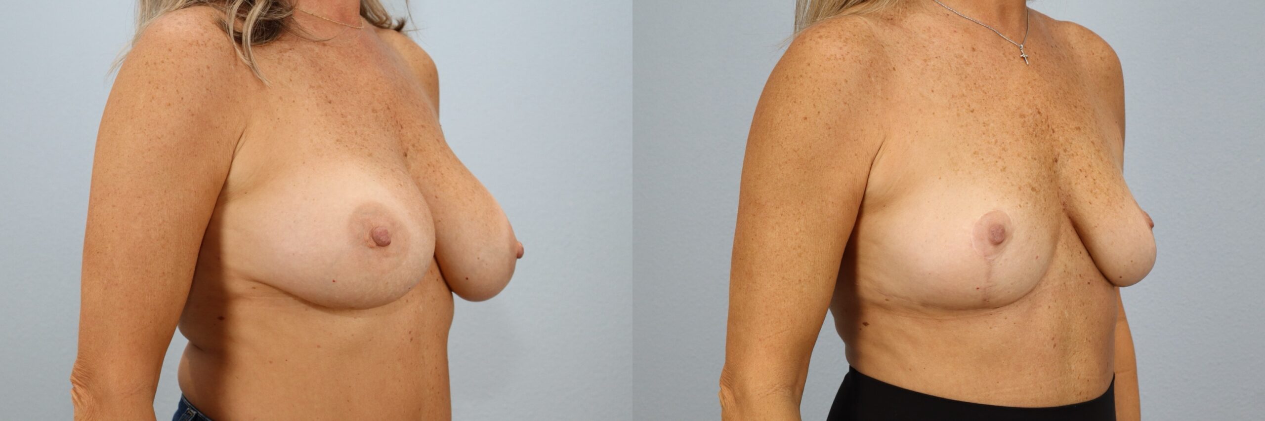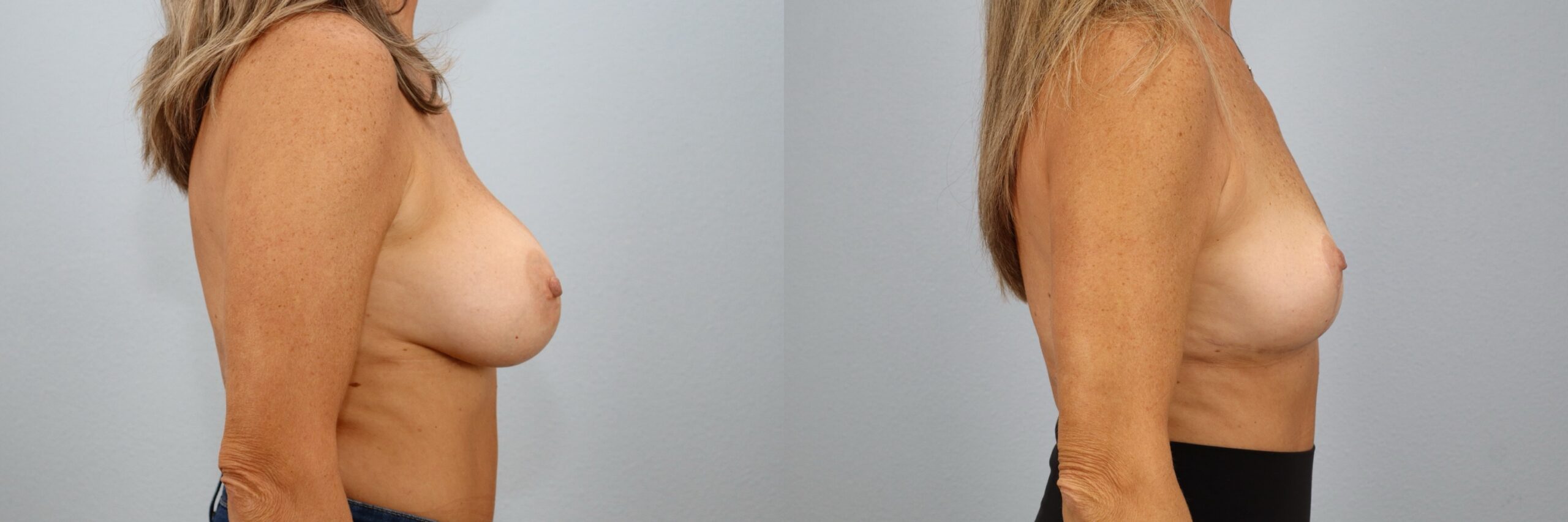 This 51-year-old female patient is shown 1 year after undergoing a Breast Lift (Mastopexy) with Implant Removal performed by board-certified plastic surgeon Dr. Neaman. After having breast implants for over 20 years, she chose to remove them and restore a natural breast contour. The procedure lifted and reshaped her existing tissue to improve support and symmetry without replacing the implants. At one year post-op, her before and after results highlight balanced proportions, refined shape, and long-lasting lift. Her outcome demonstrates natural breast rejuvenation following long-term implant removal.