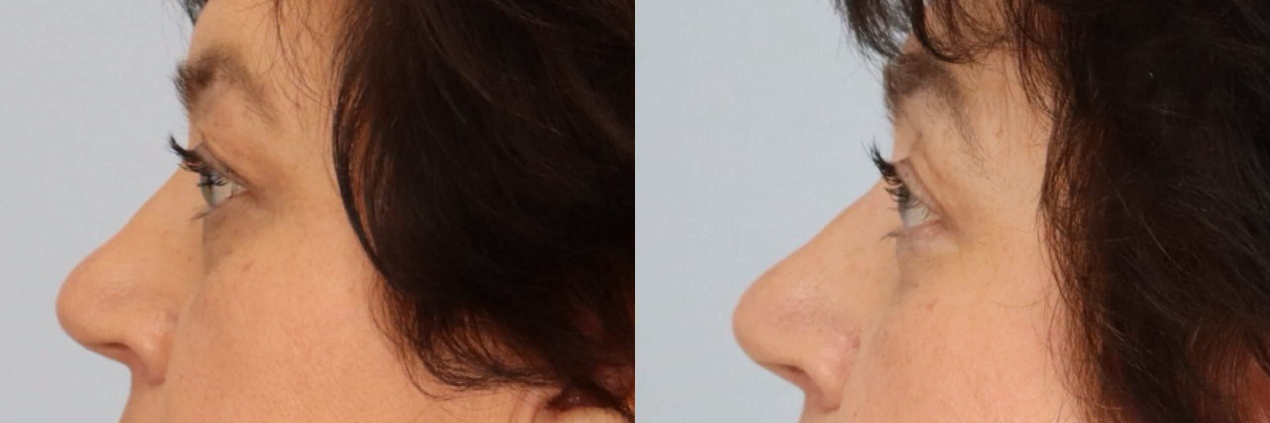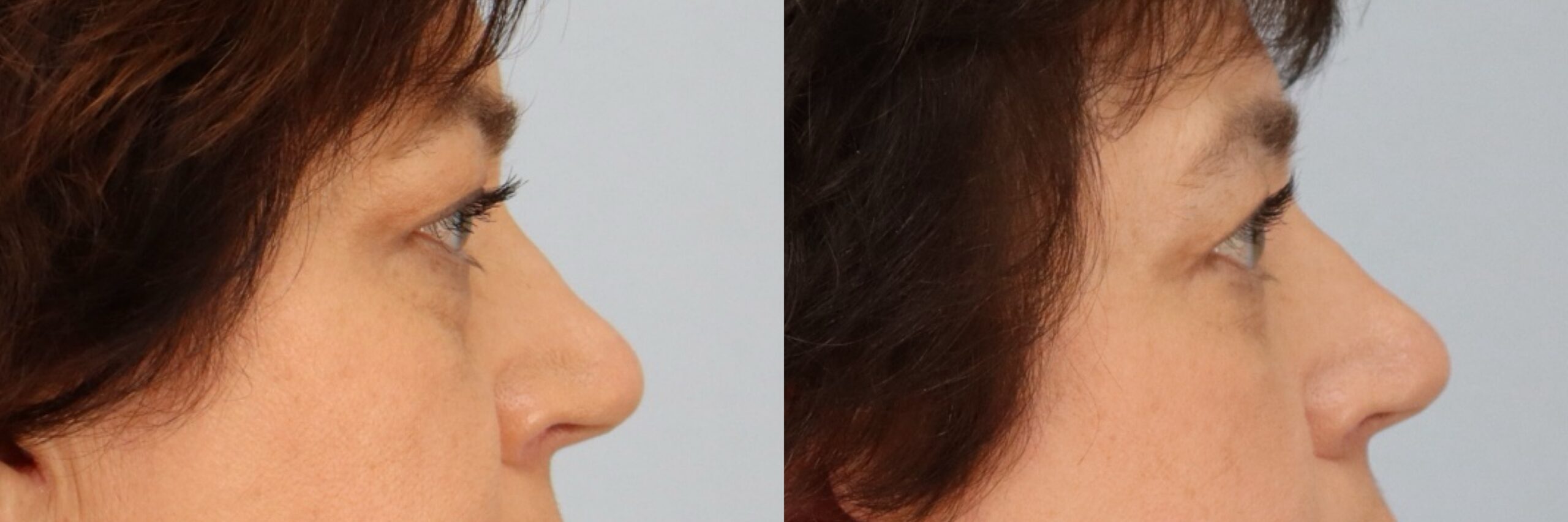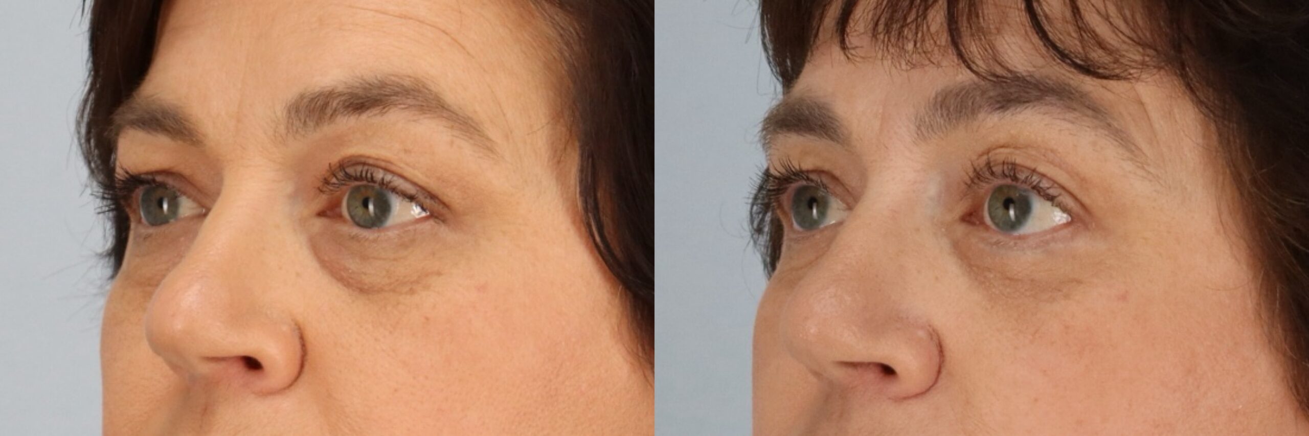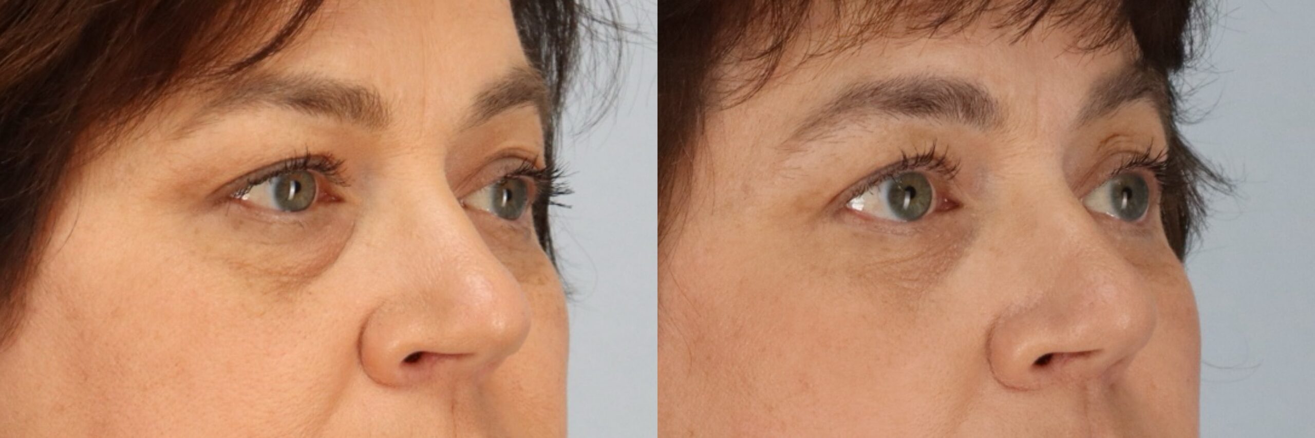 This 51-year-old female patient is shown 12 months after undergoing Lower Lid Blepharoplasty performed by board-certified plastic surgeon Dr. Neaman. This procedure addressed under-eye puffiness and excess tissue to improve contour and create a smoother appearance beneath the eyes. Lower eyelid surgery helps refine the transition between the lower eyelid and cheek while maintaining natural eye shape. At one year post-op, her before and after results demonstrate a more refreshed under-eye contour and improved overall balance.
