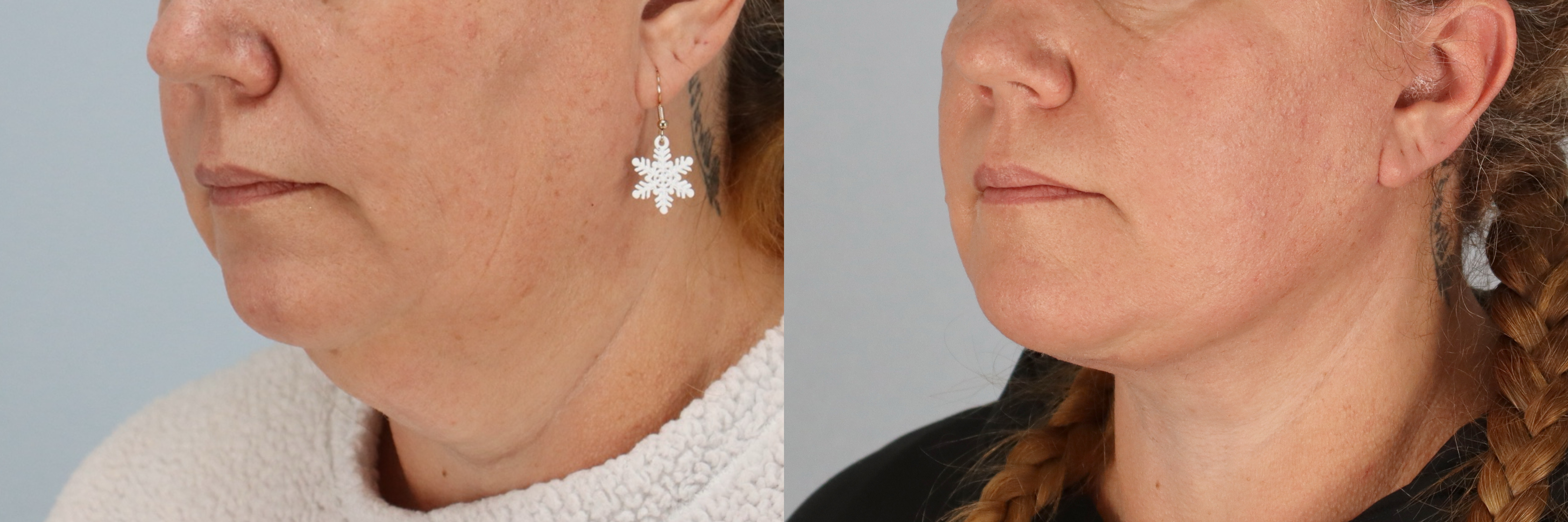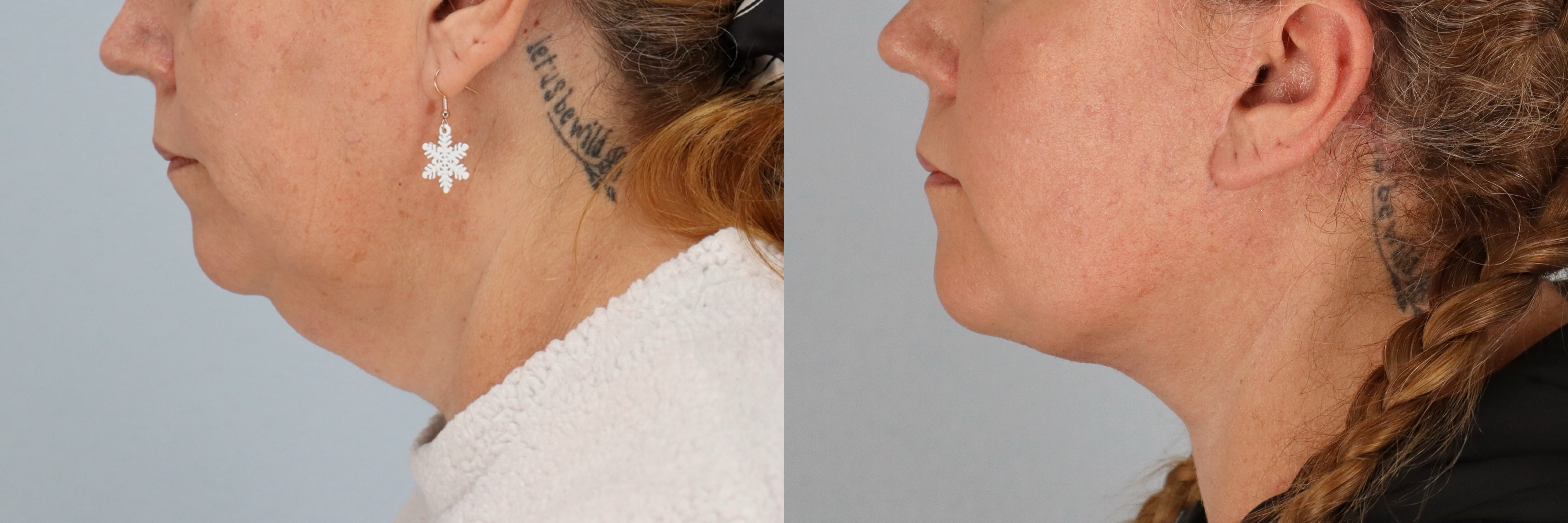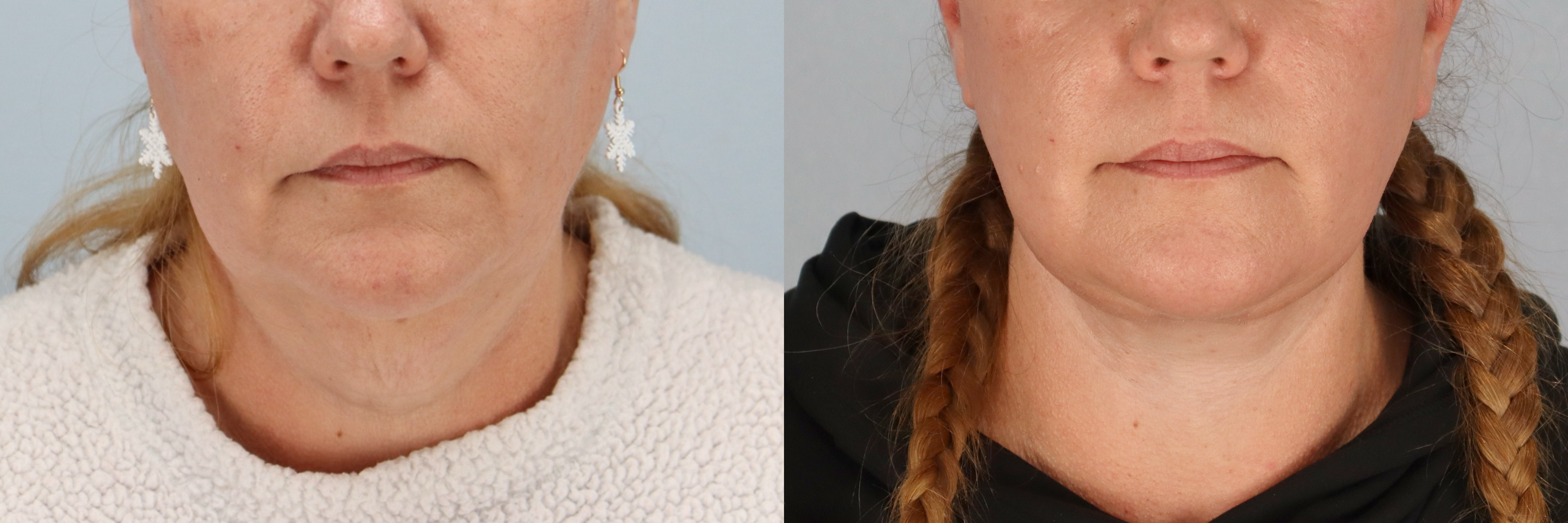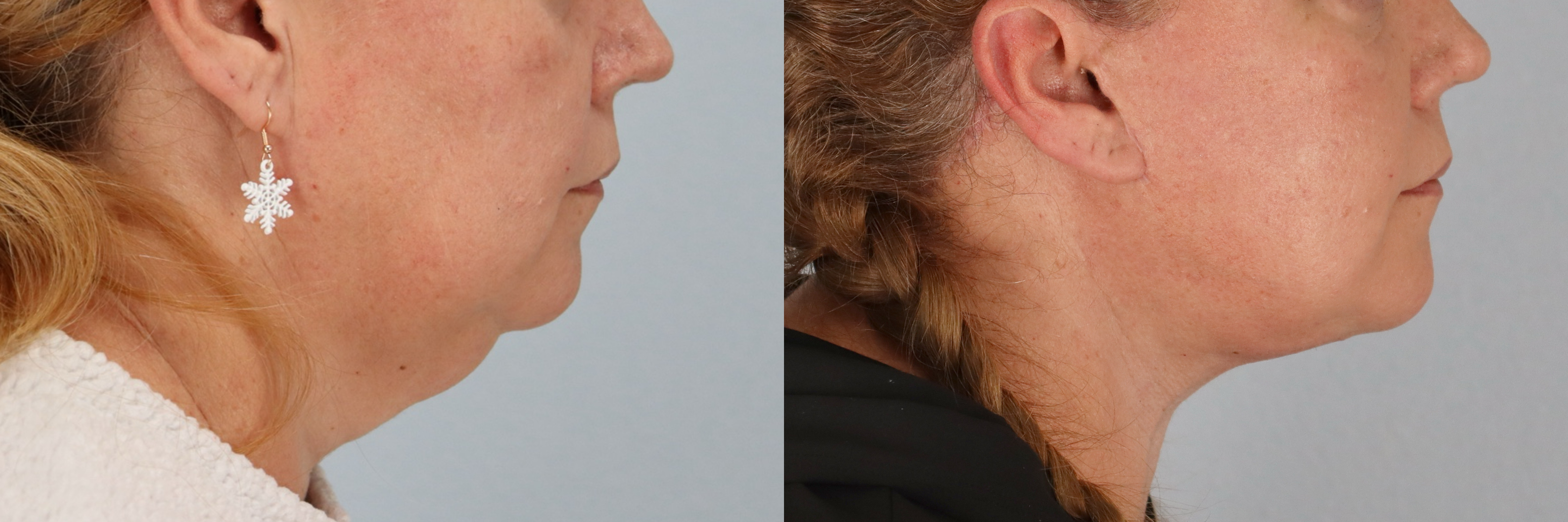 This 45-year-old female patient is shown 7 months after her neck lift performed by board-certified plastic surgeon Dr. Neaman. The procedure refined and tightened the underlying neck structures while removing excess skin for a firmer, more contoured neckline. Her results display smoother definition and a rejuvenated appearance.