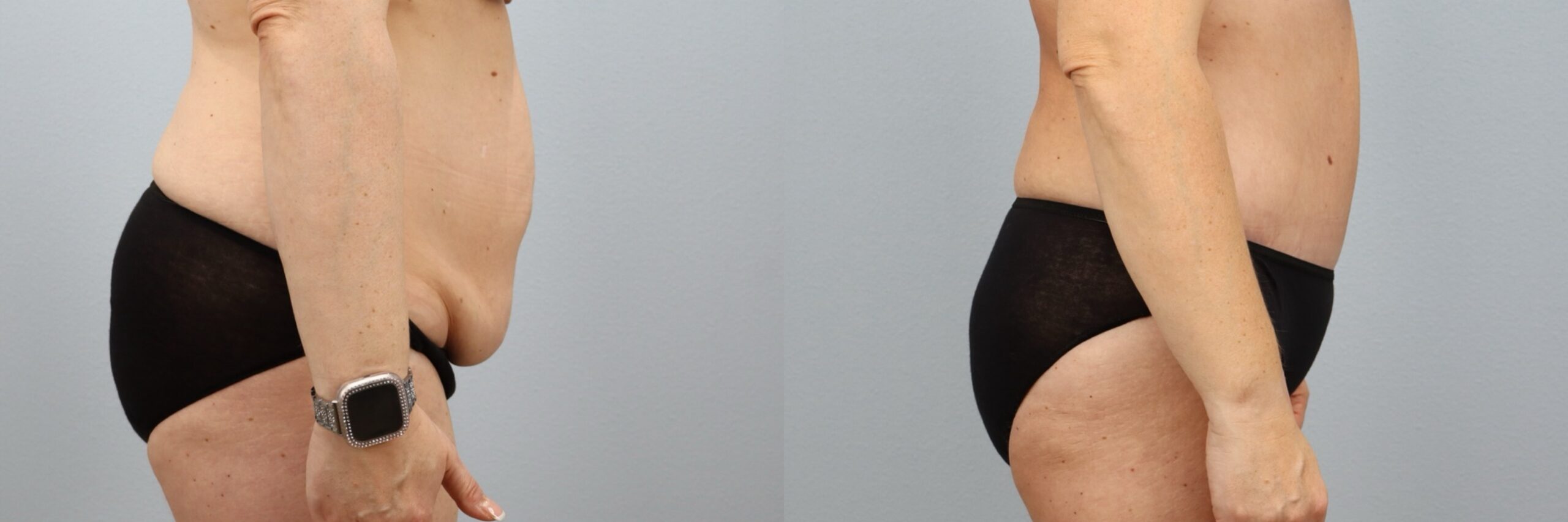 This 42-year-old female patient is shown 8 months after her abdominoplasty (tummy tuck) with liposuction to the flanks, performed by board-certified plastic surgeon Dr. Neaman. The procedure removed excess skin and tightened underlying muscles while contouring the waistline through targeted liposuction. At 8 months post-op, her abdomen appears smoother, flatter, and more defined, showcasing improved tone and natural balance.