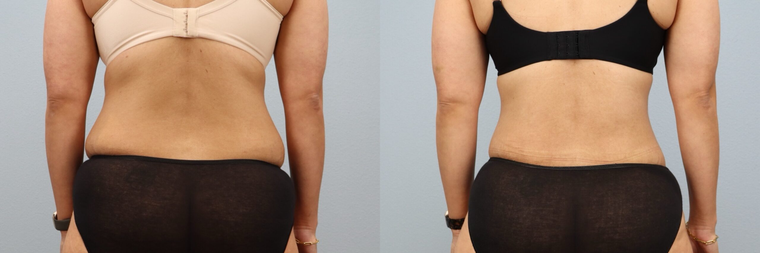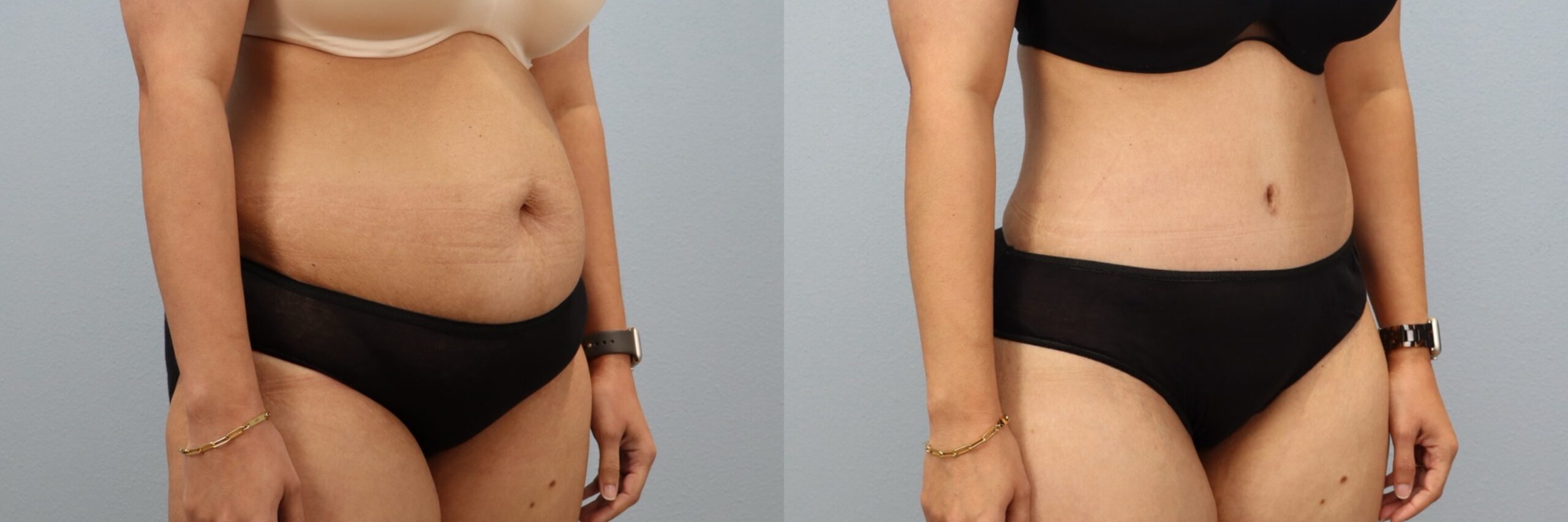 This 39-year-old female patient is shown 6 months after undergoing a tummy tuck (abdominoplasty) with liposuction to the flanks performed by board-certified plastic surgeon Dr. Neaman. This skin removal surgery addressed loose abdominal tissue and tightened the underlying muscles for a smoother, firmer midsection. Liposuction refined the waistline by removing excess fat from the flanks, enhancing her overall body contour. At 6 months post-op, her results reveal a flatter abdomen, improved tone, and a natural, contoured silhouette that reflects both precision and balance.