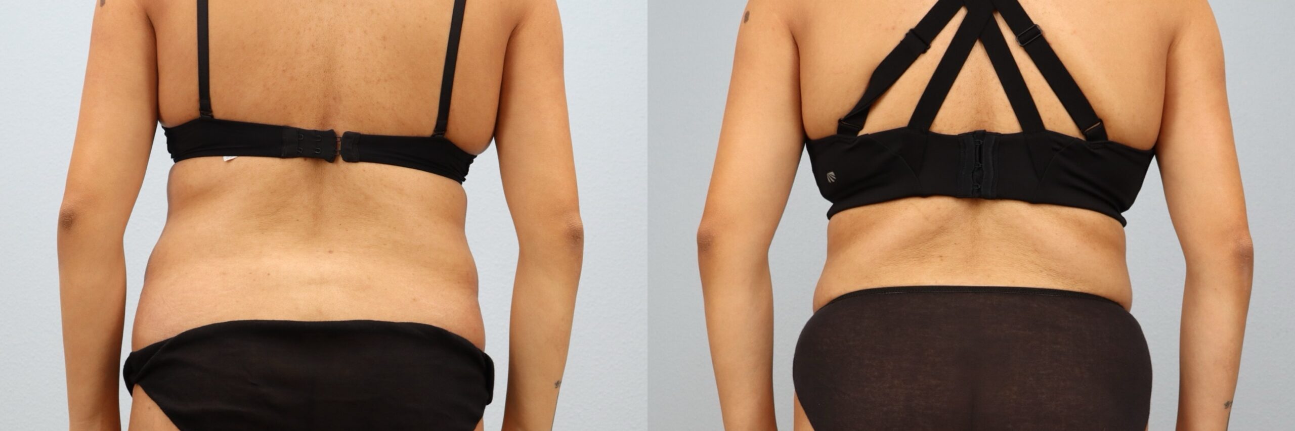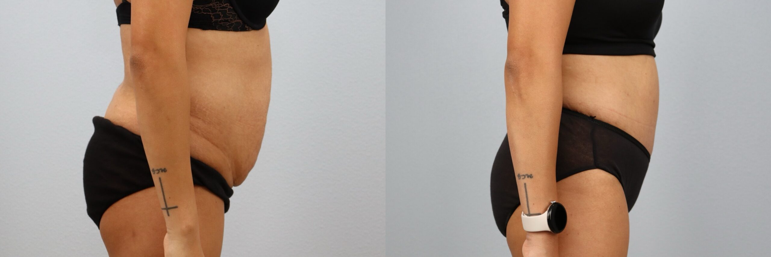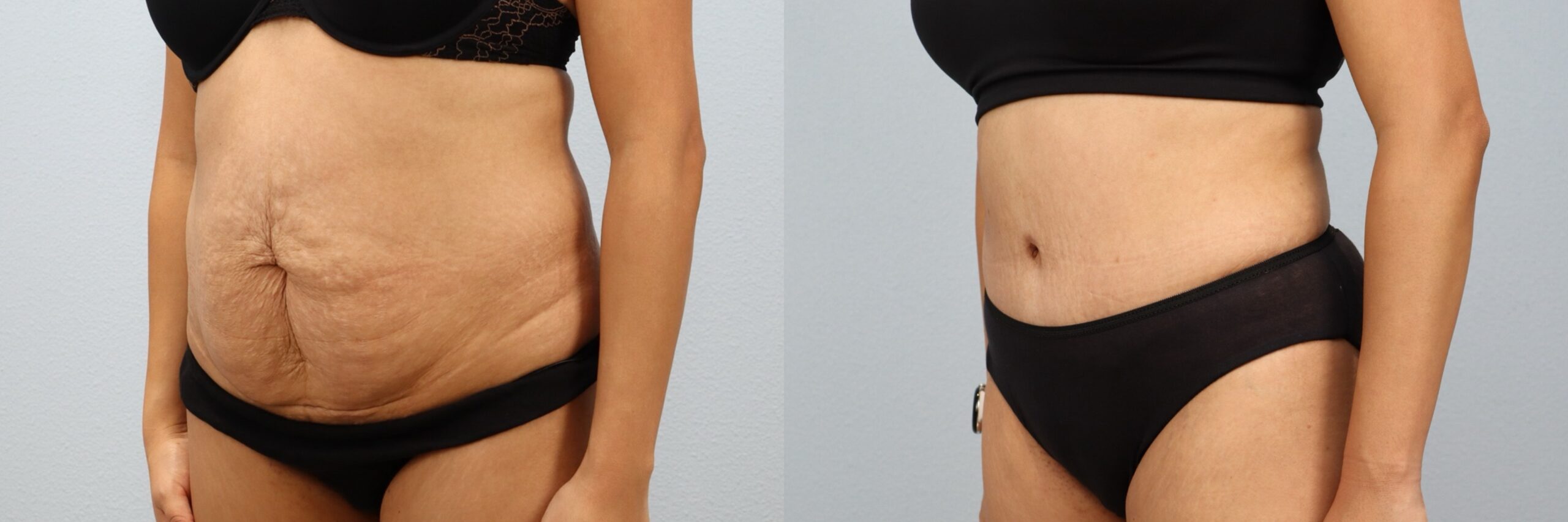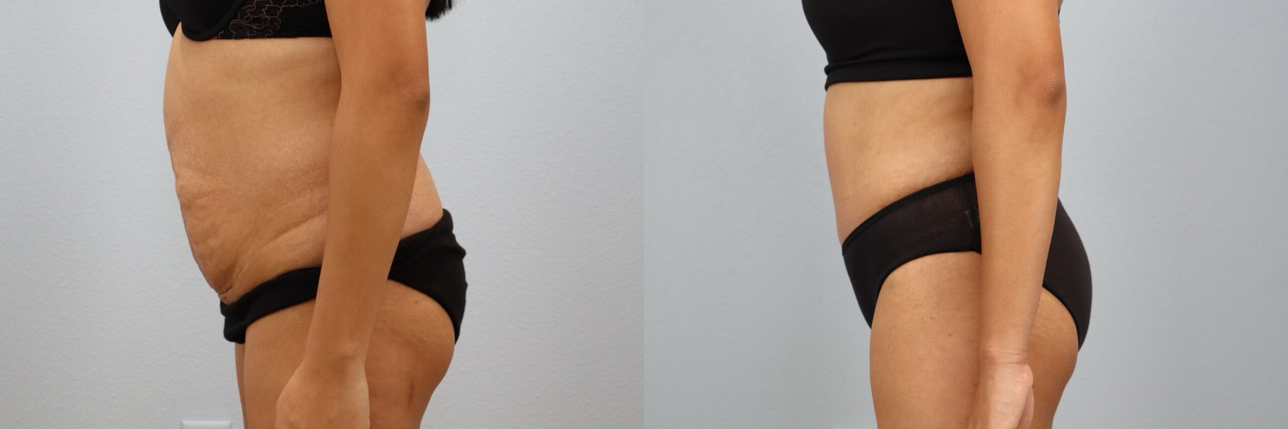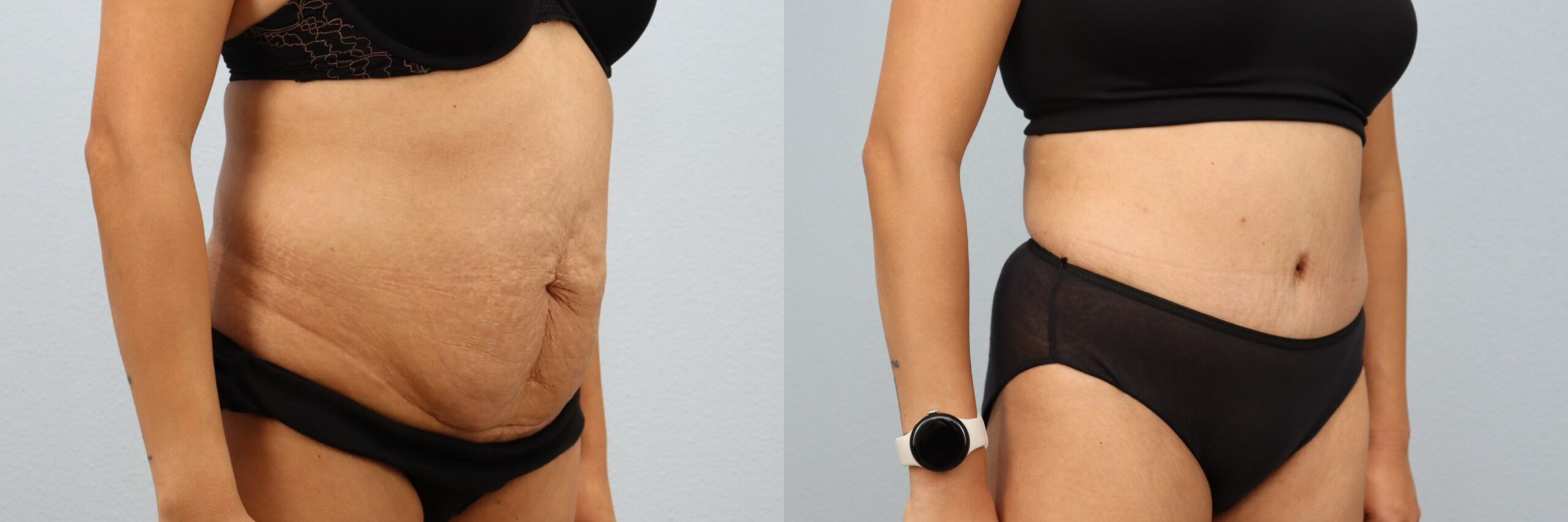 This 34-year-old female patient is shown 9 months after her tummy tuck (abdominoplasty) with liposuction 360 performed by board-certified plastic surgeon Dr. Neaman. This comprehensive body contouring and skin removal surgery tightened the abdominal wall, removed excess skin, and targeted fat around the flanks, back, and abdomen for full circumferential contouring. Her before and after tummy tuck results reveal a flatter, firmer midsection with a smoother waistline and improved proportions. At 9 months post-op, her outcome appears natural, defined, and well-balanced with her overall frame.