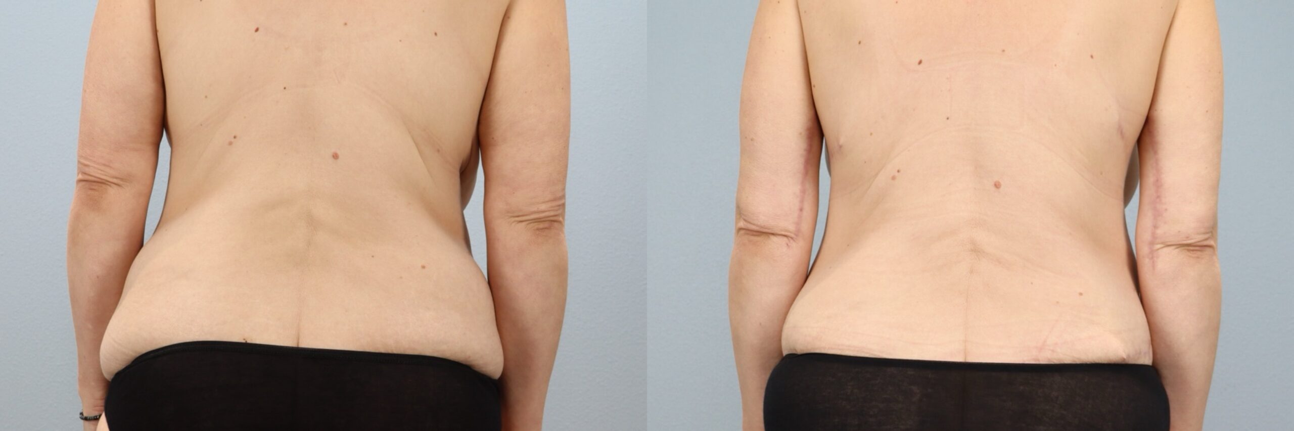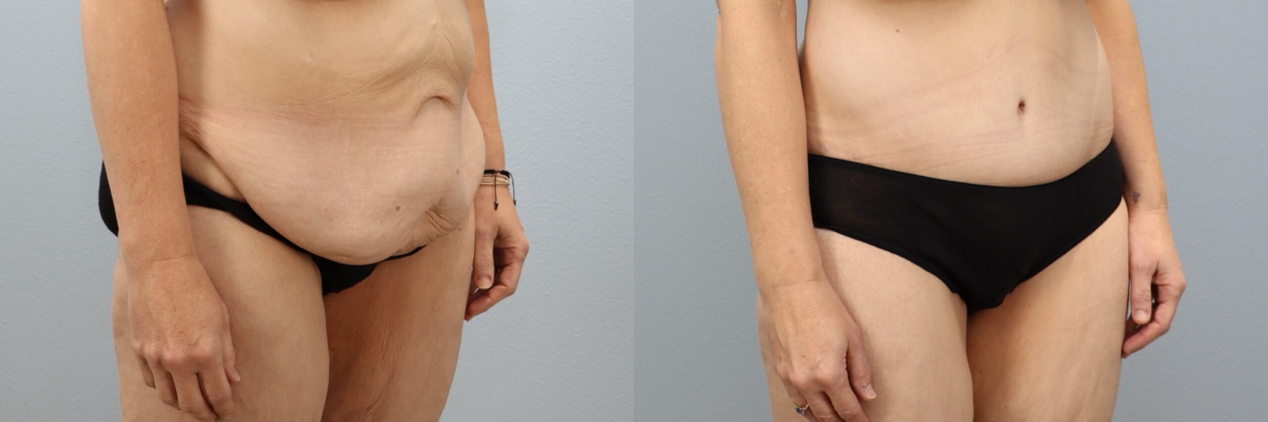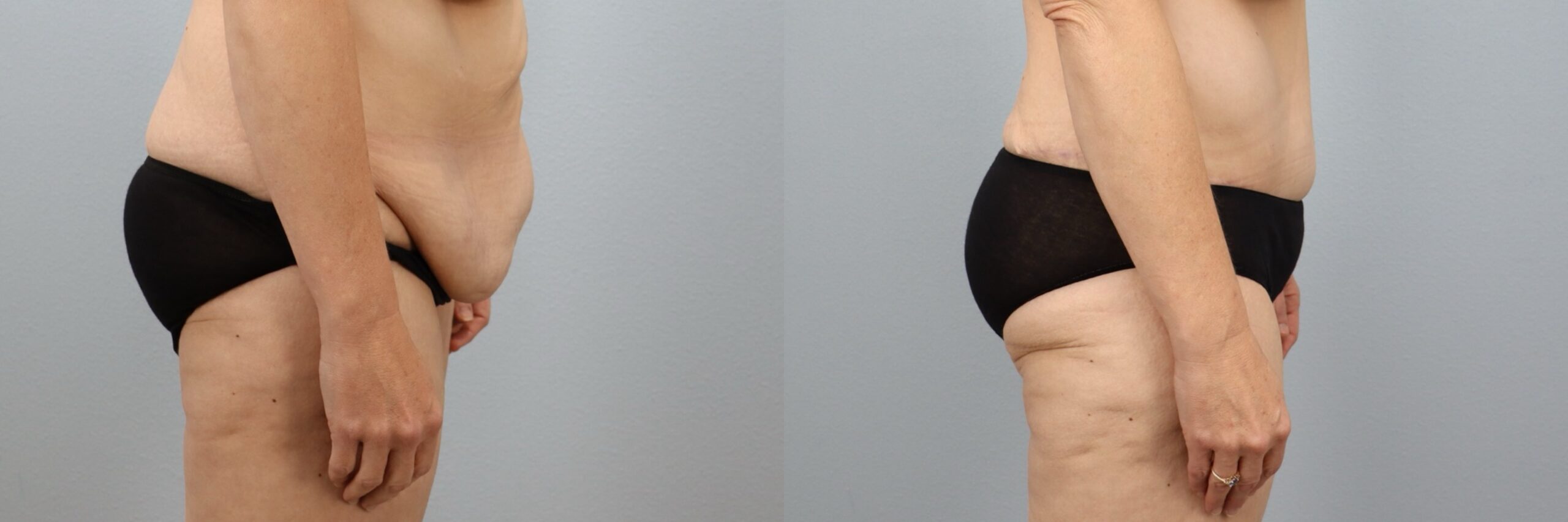 This 50-year-old female patient is shown 11 months after undergoing a full abdominoplasty (tummy tuck) with liposuction to the flanks performed by board-certified plastic surgeon Dr. Neaman. This skin removal and body contouring procedure removed excess abdominal tissue, tightened the underlying muscles, and refined the waistline through targeted liposuction. Approximately 5 pounds of tissue were removed from the midsection, along with 1200cc of liposuction to the flanks. At 11 months post-op, her results show a flatter abdomen, smoother contours, and improved core definition.