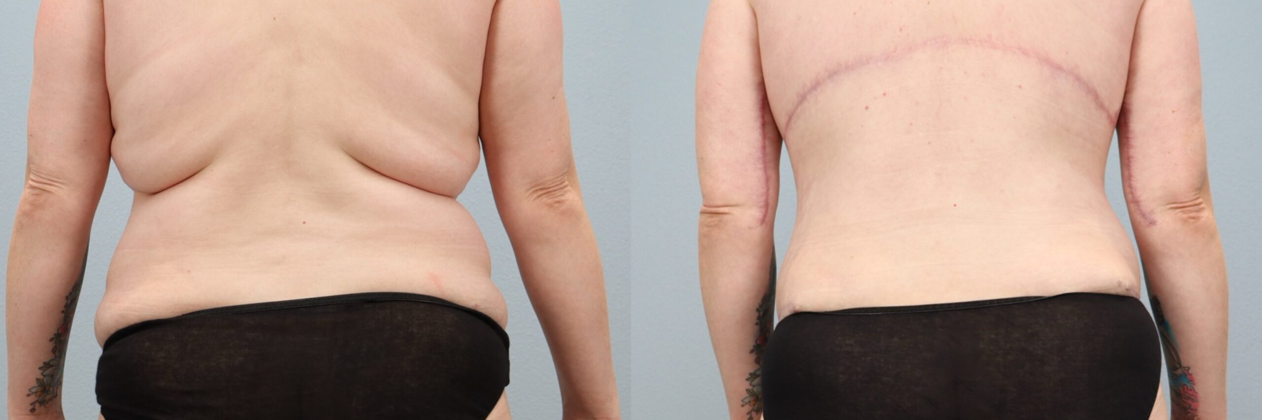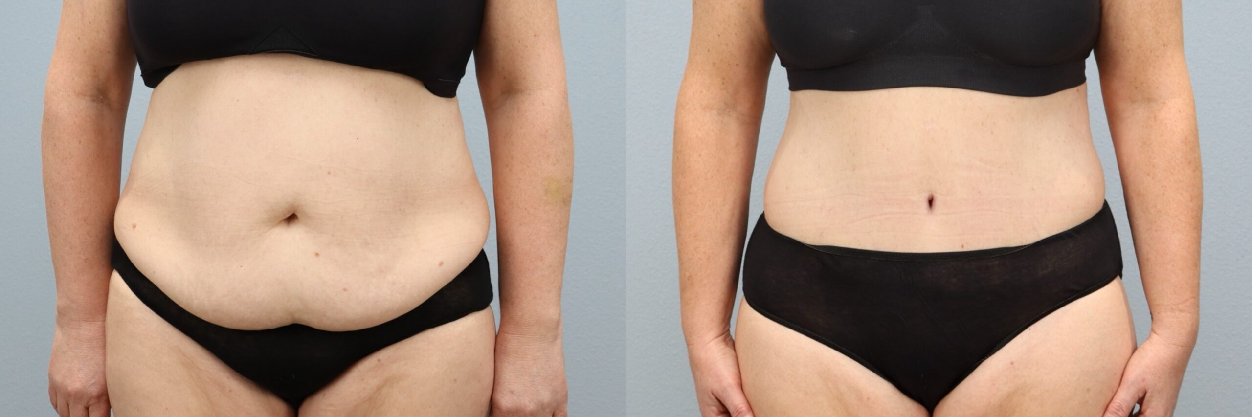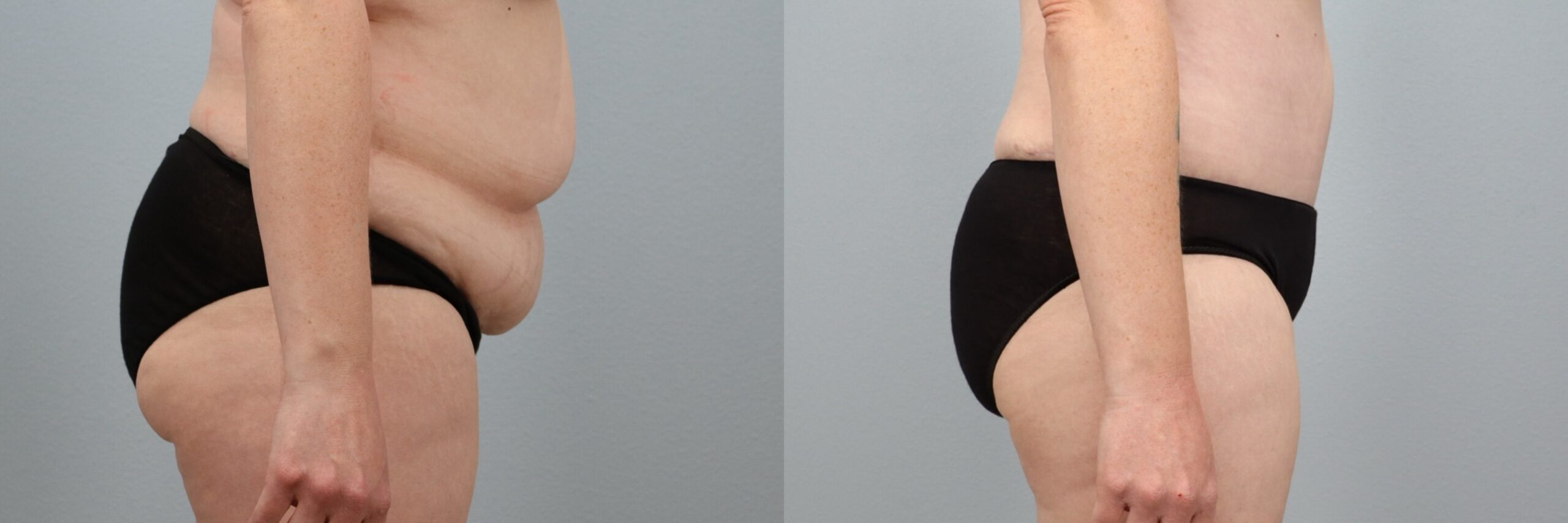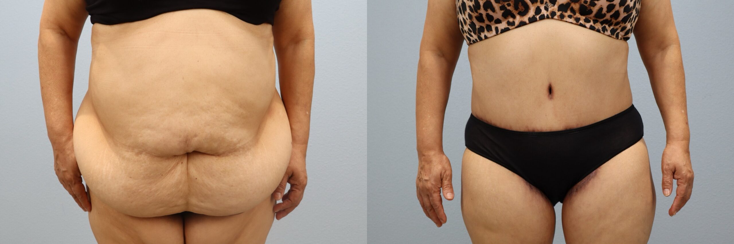 This 39-year-old female patient is shown 6 months after her tummy tuck (abdominoplasty) with liposuction to the flanks, back, and abdomen, performed by board-certified plastic surgeon Dr. Neaman. This body contouring and skin removal surgery addressed loose abdominal skin while refining surrounding areas for smoother transitions. Her before and after tummy tuck results reveal a flatter abdomen, improved waist definition, and a more sculpted midsection.