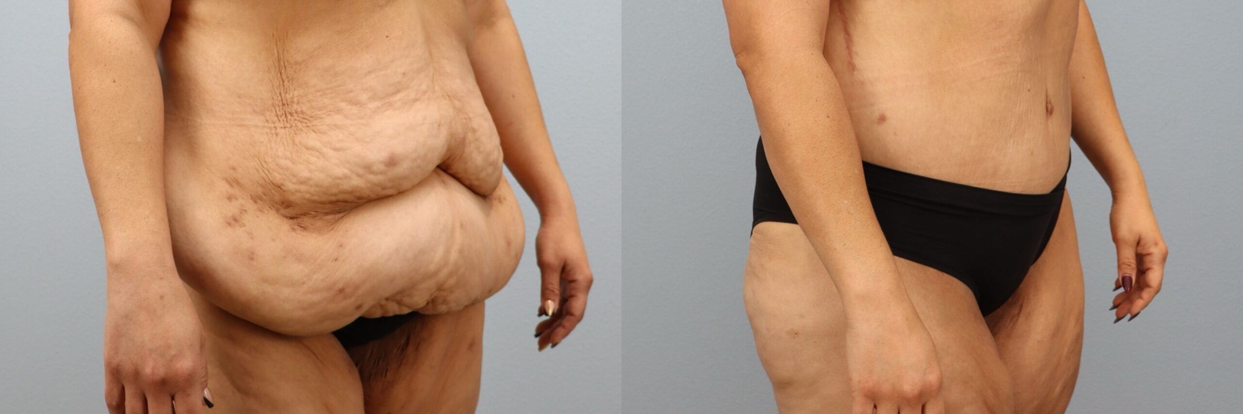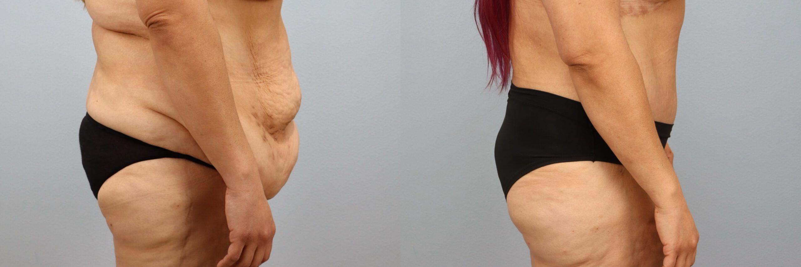 This 42-year-old female patient is shown 8 months after a tummy tuck (abdominoplasty) with liposuction to the flanks and back performed by board-certified plastic surgeon Dr. Neaman. The procedure removed excess abdominal skin while tightening the midsection and refining the waistline. Her results demonstrate a flatter abdomen, smoother back contour, and improved overall body proportion.