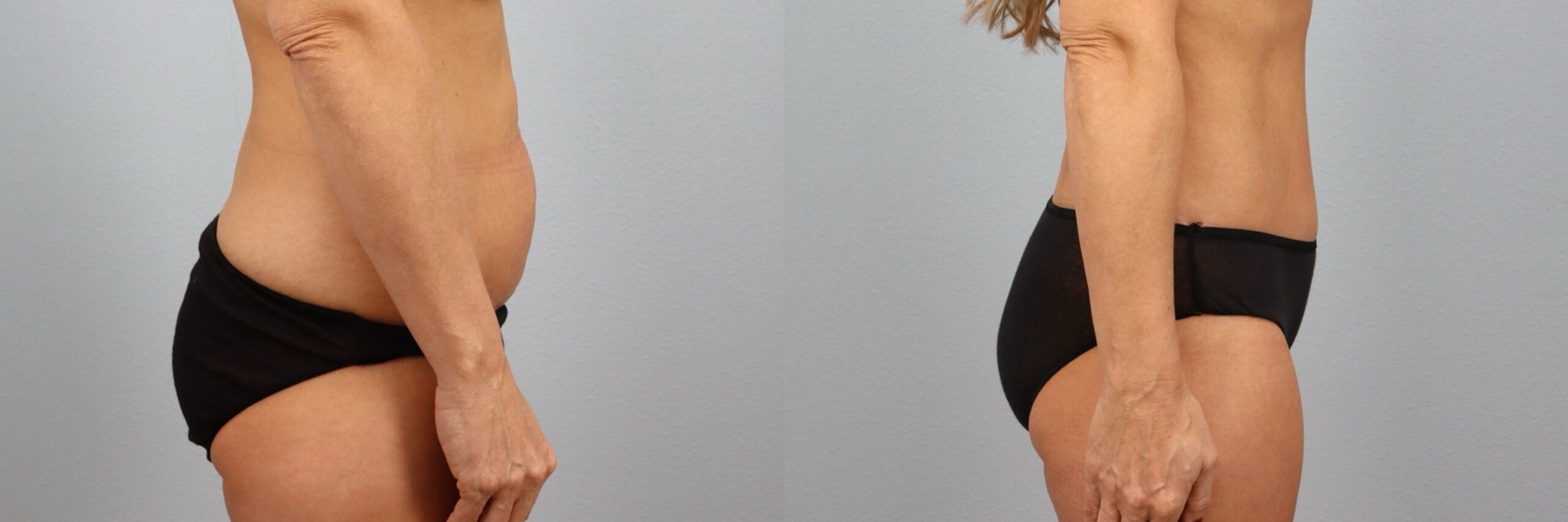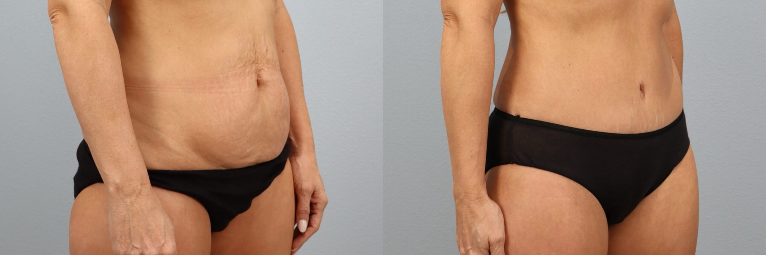 This 43-year-old female patient is shown 7 months after a tummy tuck (abdominoplasty) with liposuction to the flanksperformed by board-certified plastic surgeon Dr. Neaman. The procedure removed excess abdominal skin while tightening the midsection and refining the waistline. At 7 months post-op, her results demonstrate a flatter abdomen, improved core contour, and smoother transitions along the flanks.
