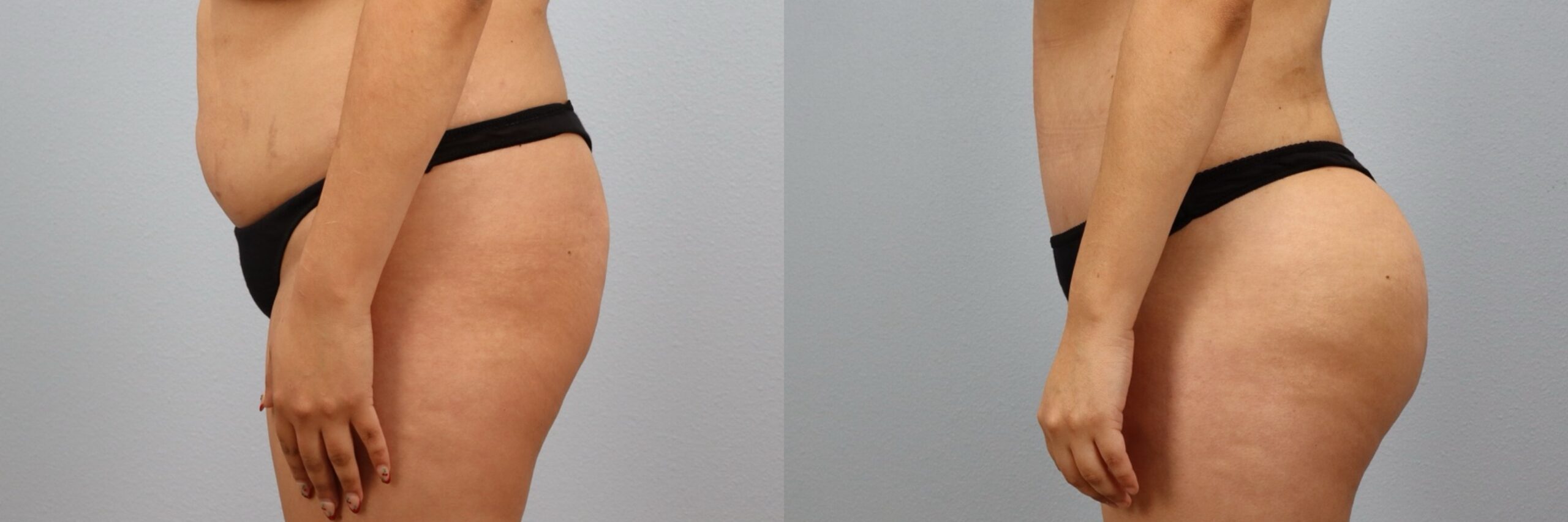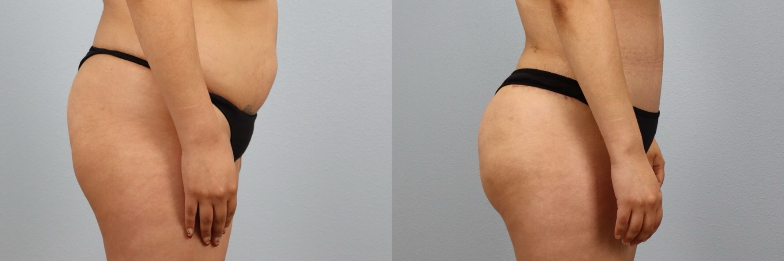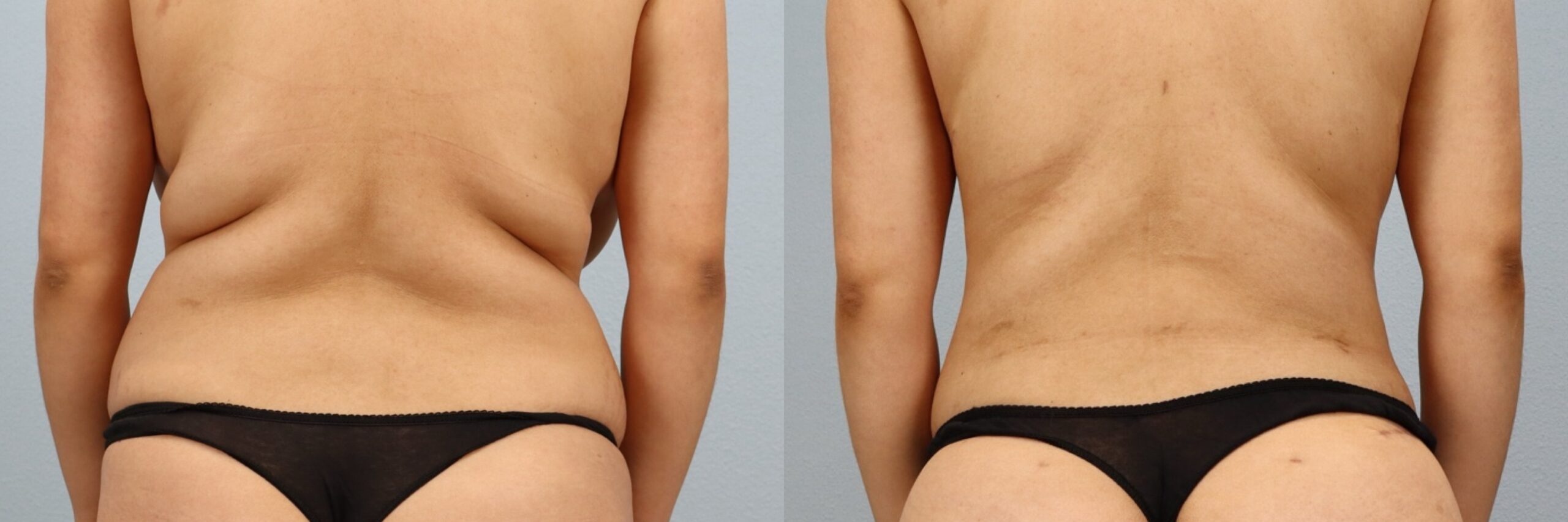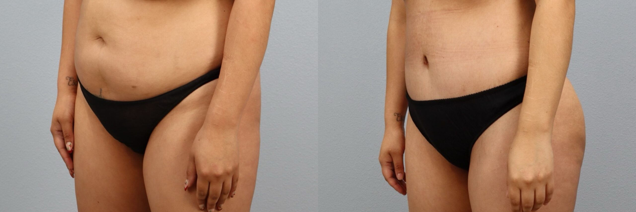 This 30-year-old female patient is shown 6 months after a tummy tuck (abdominoplasty) with liposuction 360performed by board-certified plastic surgeon Dr. Neaman. This body contouring and skin removal surgery tightened the midsection while refining the waist, flanks, and surrounding contour. A total of 3800cc of liposuction was performed, and 2100g of abdominal tissue was resected during the tummy tuck. At 6 months post-op, her before and after tummy tuck results show a flatter abdomen, improved waist definition, and smoother overall contours.