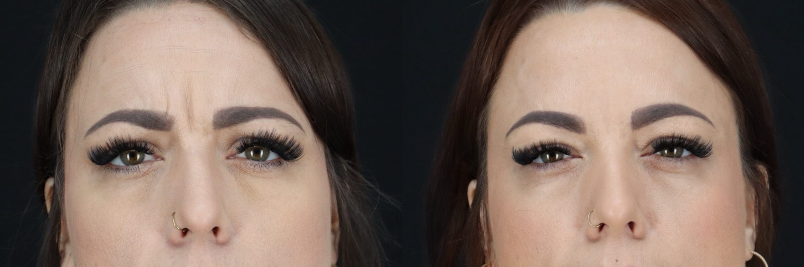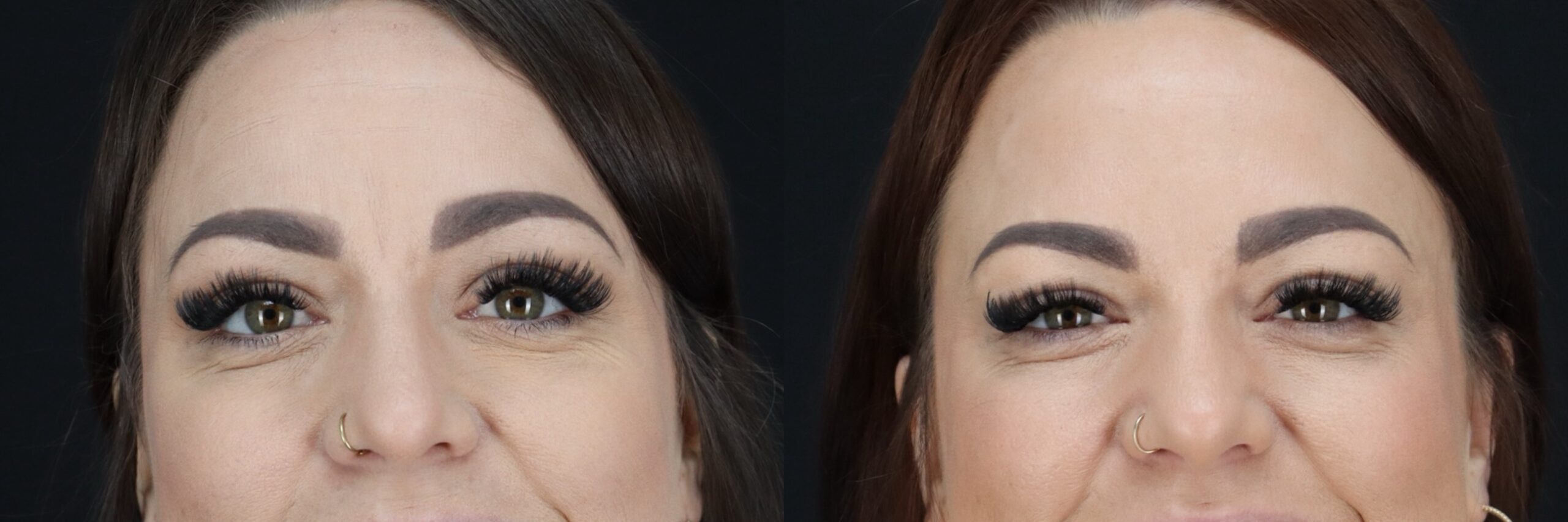 This patient received Botox to the forehead, glabella, and crow’s feet to smooth expression lines and relieve areas of facial tension. At two weeks post-treatment, the upper face appears more relaxed and refreshed, with softened lines that still allow for natural movement and expression. The eyes look brighter and more rested, and the forehead appears smoother without heaviness. The overall result is a subtle, natural enhancement that helps the patient look well rested and refreshed without appearing overdone.