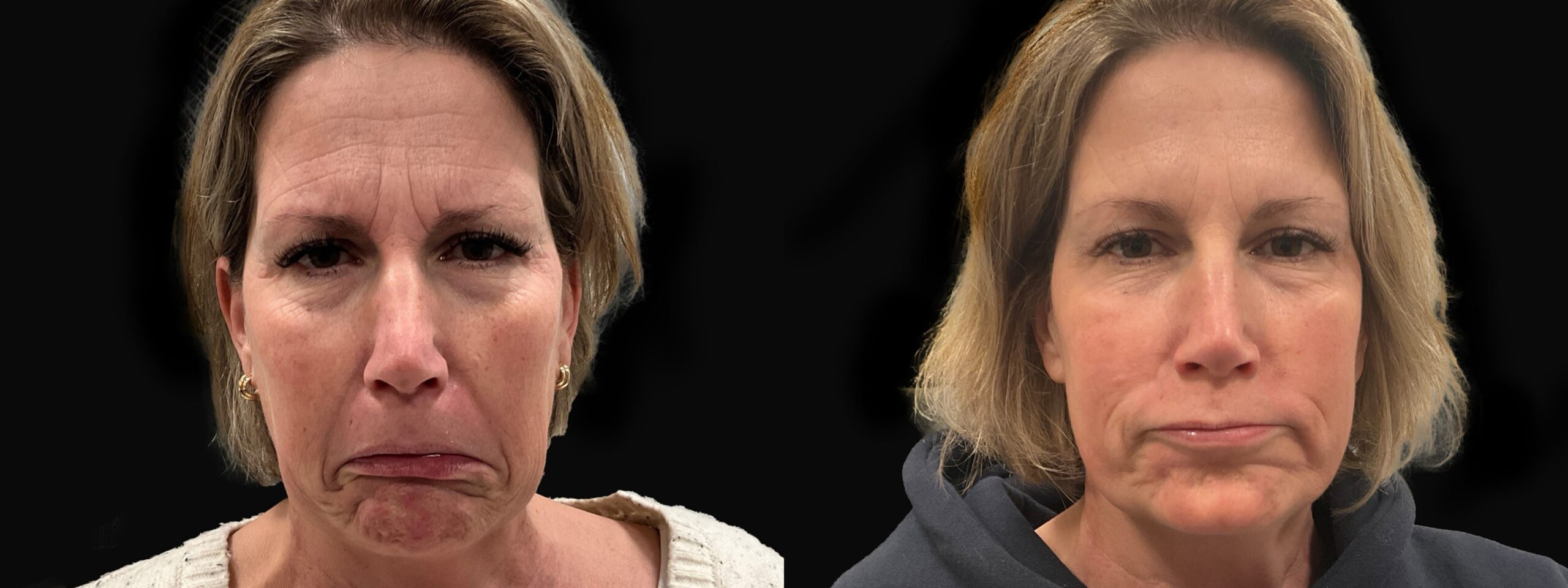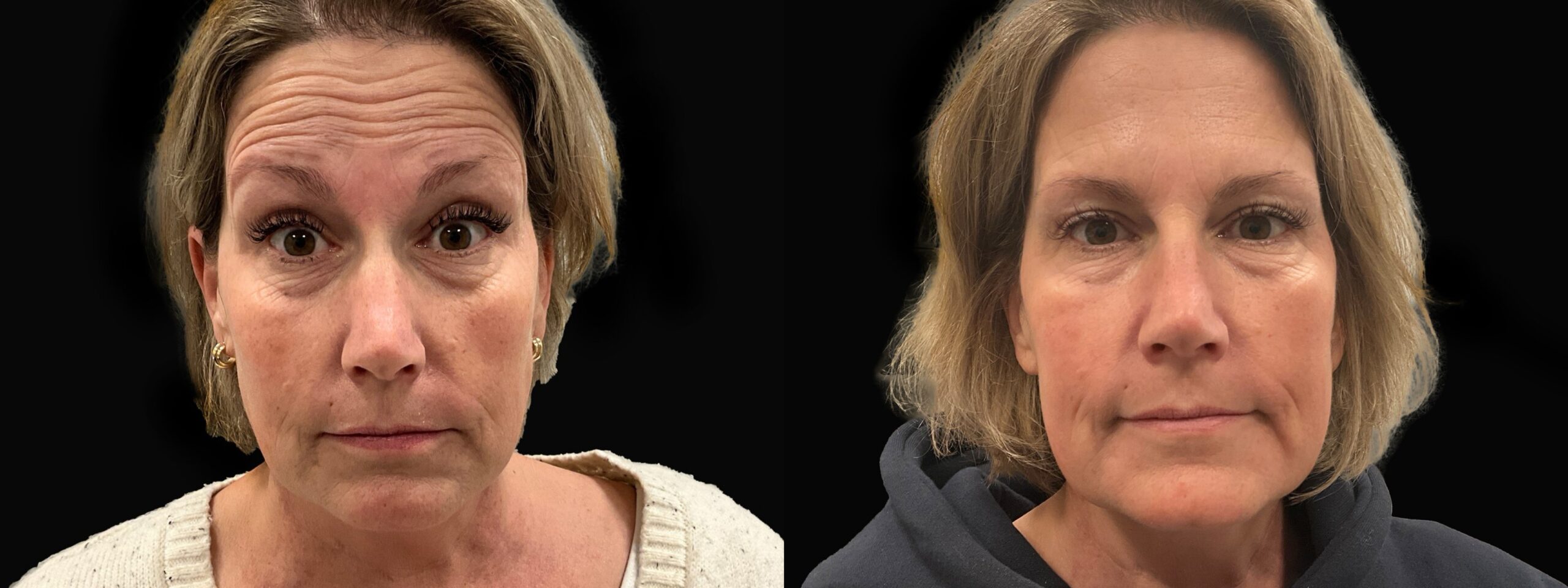 This patient received Full Face Botox for the forehead, glabella, crow’s feet, chin, jawline, and lip flip. At two weeks, her results show a balanced, refreshed look while maintaining natural expression. Fine lines around the eyes and forehead are softened, the jawline appears more relaxed, and subtle definition around the lips enhances her smile. As this was her first Botox treatment, the smooth yet natural finish reflects a conservative, expertly dosed approach designed to rejuvenate without changing her unique features.