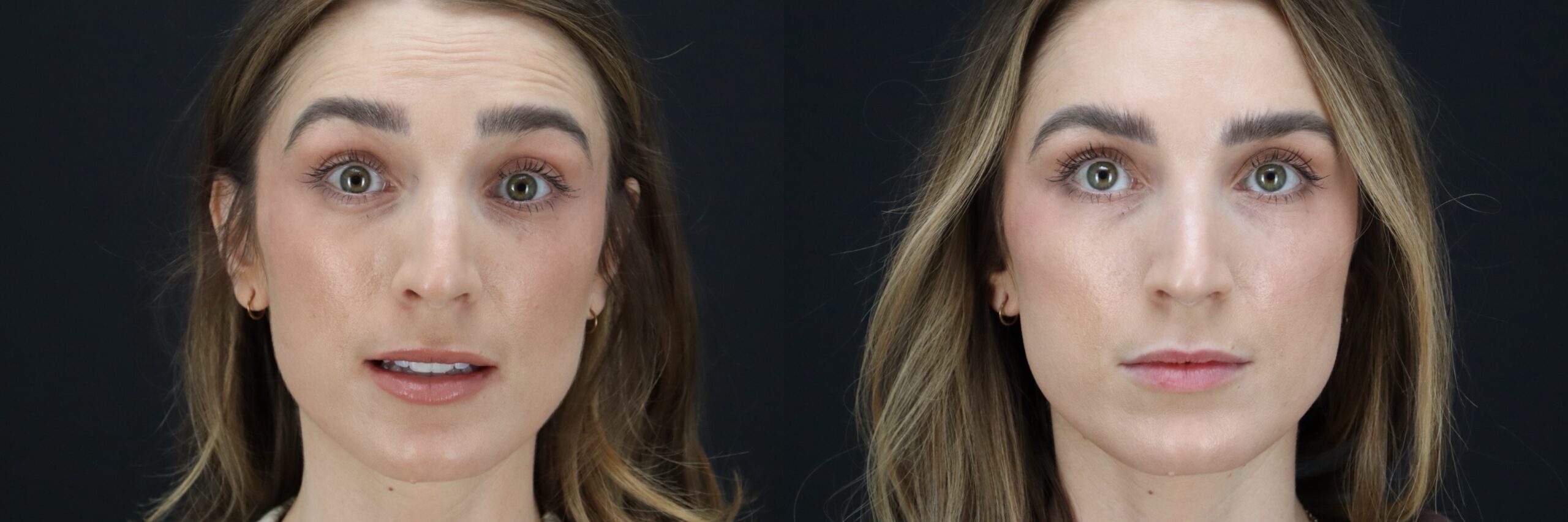 This patient received Botox to the forehead, glabella, and crow’s feet to smooth fine lines and refresh the upper face. At two weeks post-treatment, the results reveal a softer, more relaxed appearance with visibly reduced expression lines across these key areas. The forehead appears smoother and more even, the frown lines between the brows are minimized, and the crow’s feet around the eyes are gently softened. The outcome maintains natural movement and expression while offering a brighter, more youthful look.